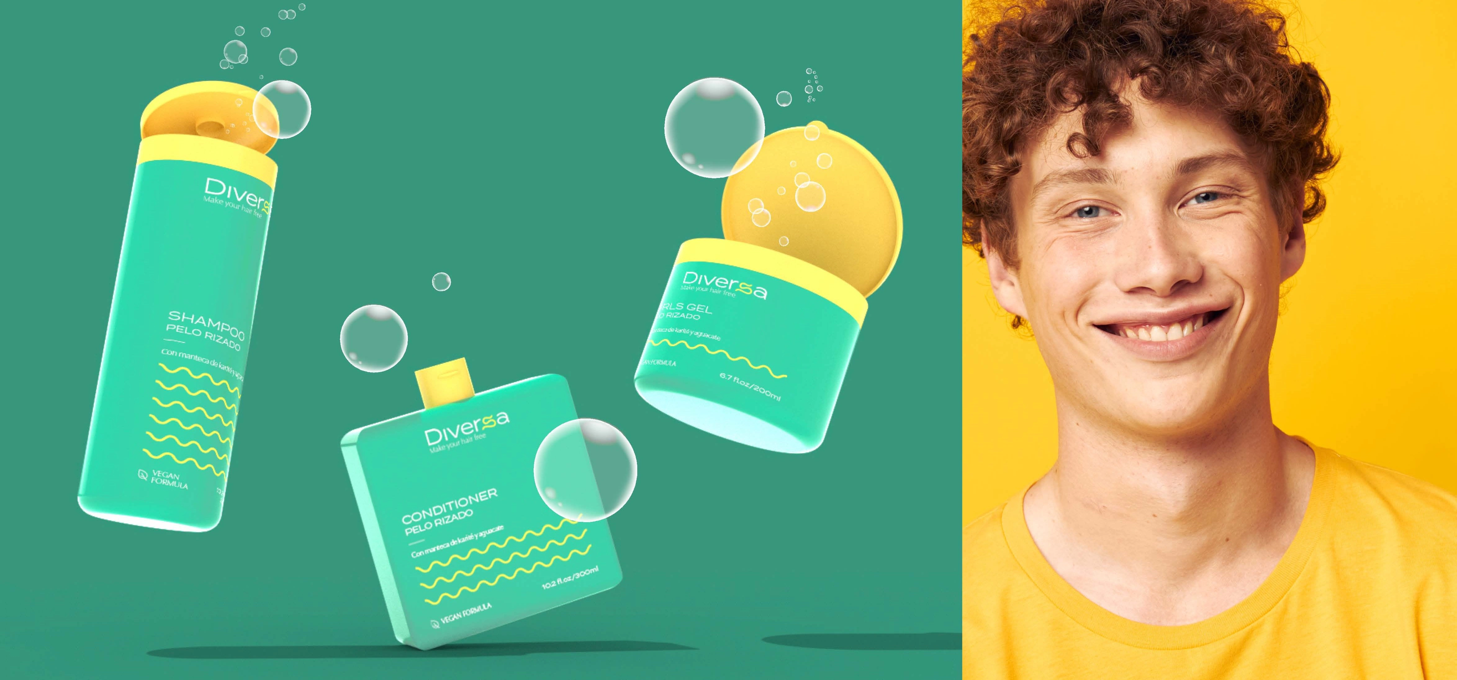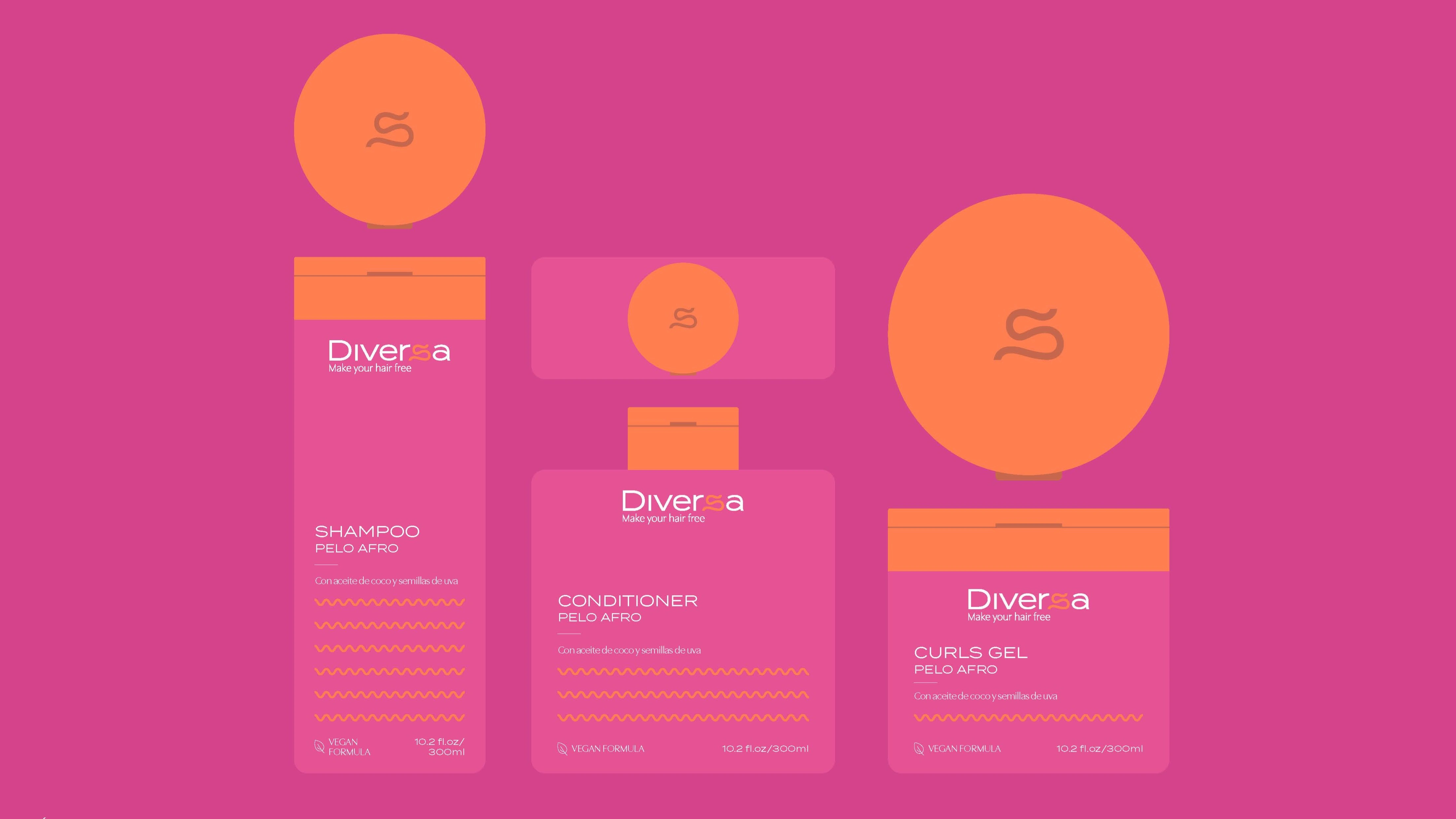 Visualmente vibrante, joven y optimista, Diversa rompe con el enfoque tradicional y monótono del sector. Su sistema simbólico y de color es clave: cada tipo de cabello se identifica por una onda más o menos rizadas y por un código cromático llamativo y alegre, creando una experiencia sensorial desde el primer vistazo.