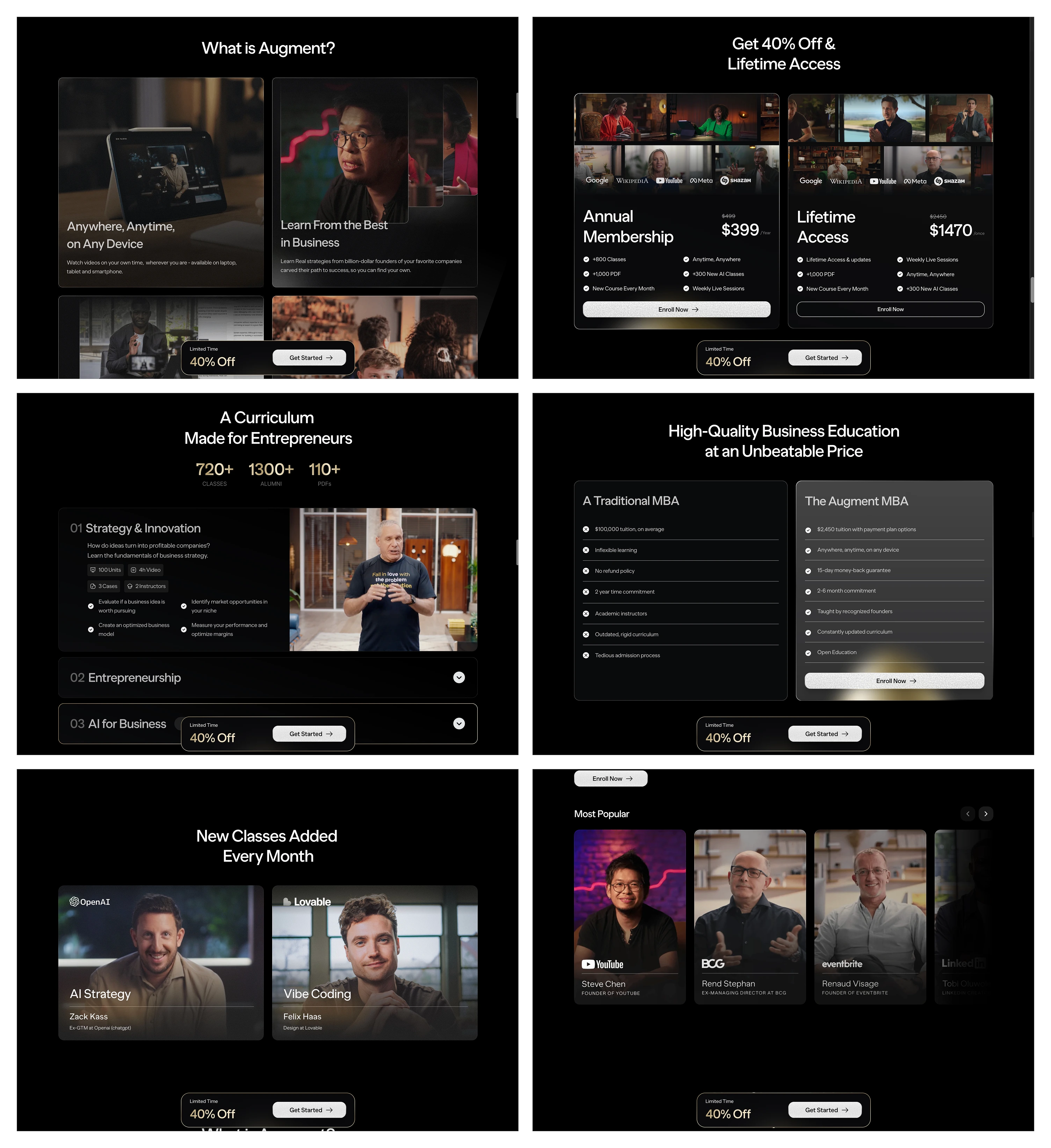 Augment had a world-class roster and a real product. But their page made them look like another course marketplace. Multiple fonts fighting each other, a lime green accent that read "tech startup," twelve sections at identical visual weight. Nothing stopped you.