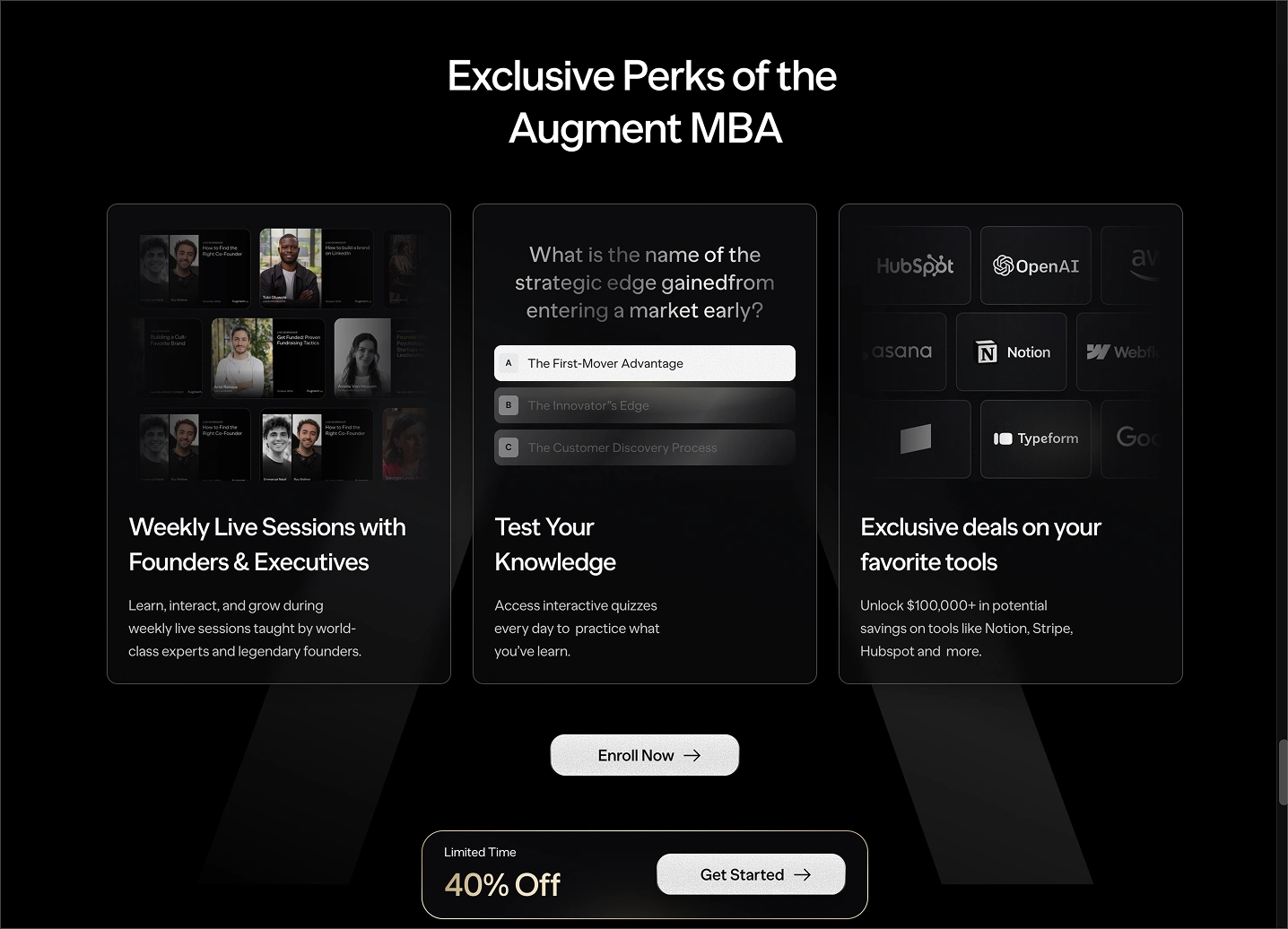 Augment sells an alternative to the traditional MBA. Their instructors include the founders of Wikipedia, YouTube, Shazam, and Eventbrite. Annual memberships run $399/year; lifetime access is $1,470.