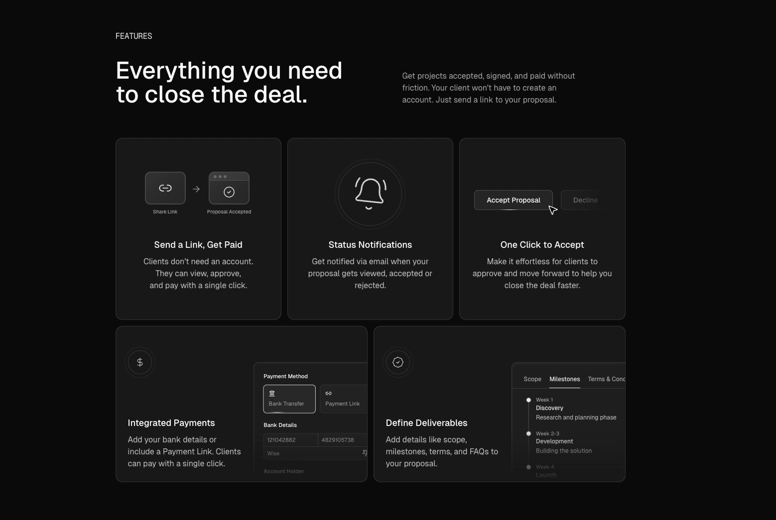 Sending proposals as a freelancer means juggling multiple tools. You write the proposal in one app, send it through email, chase clients for signatures in another platform, then set up payment through something else entirely.