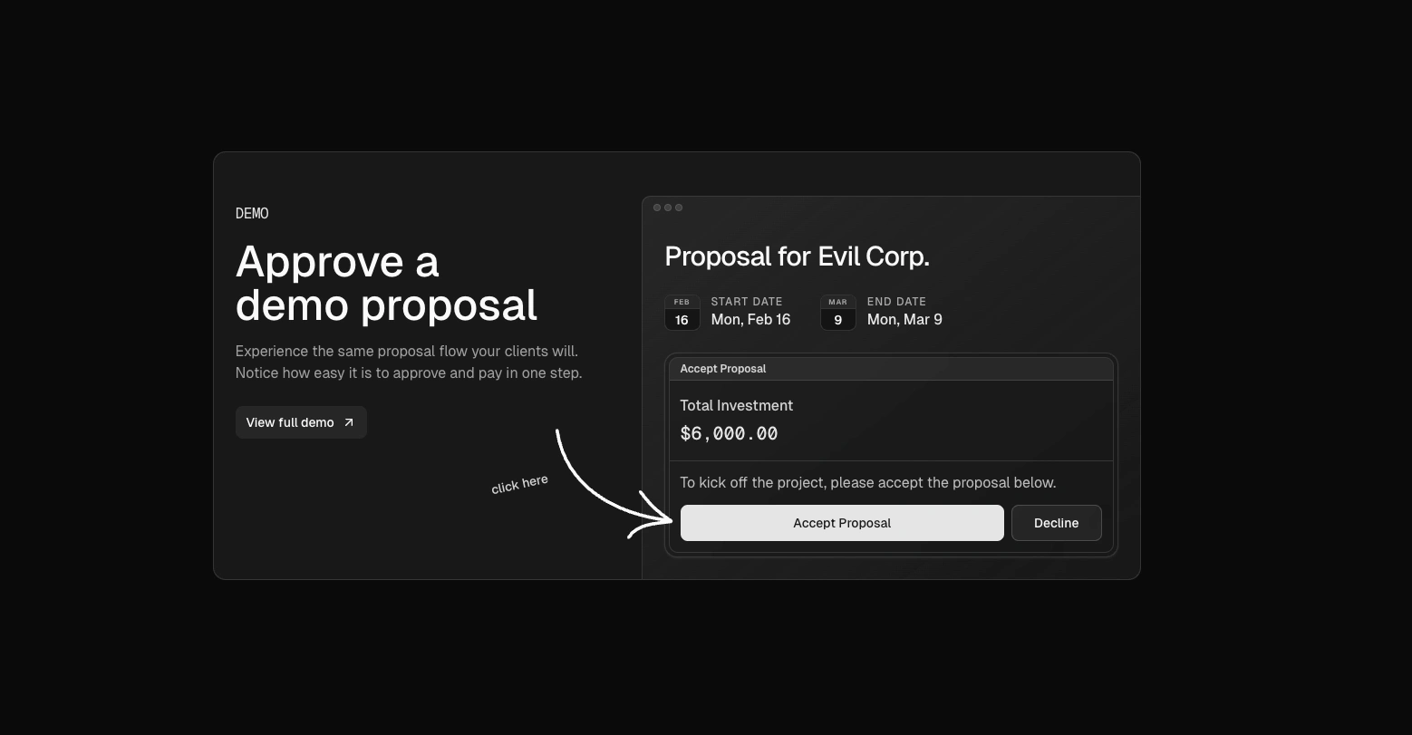 The hero section shows the actual product interface, not abstract graphics. People need to see what they're getting. The proposal demo is interactive so potential users can experience the client flow themselves.
