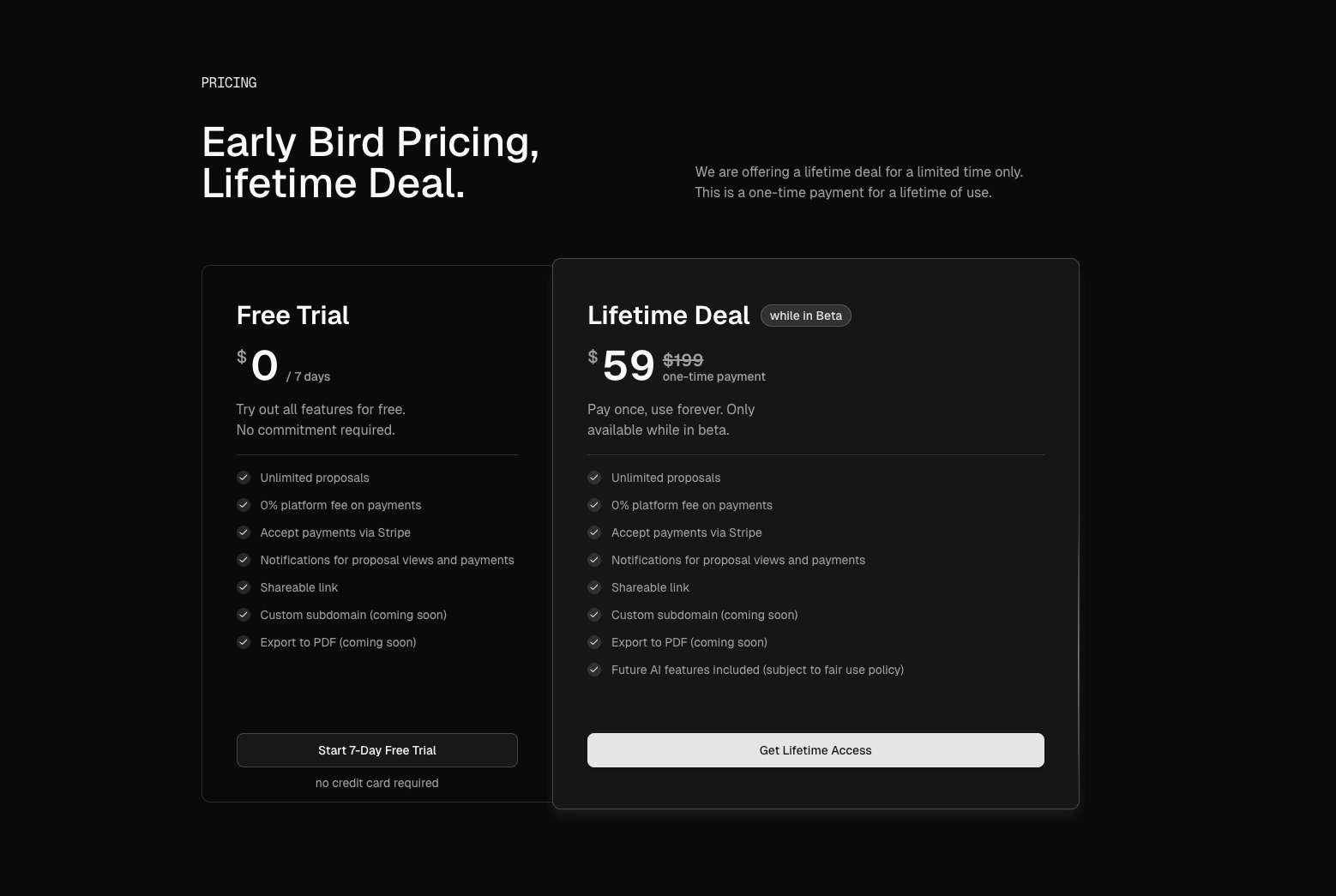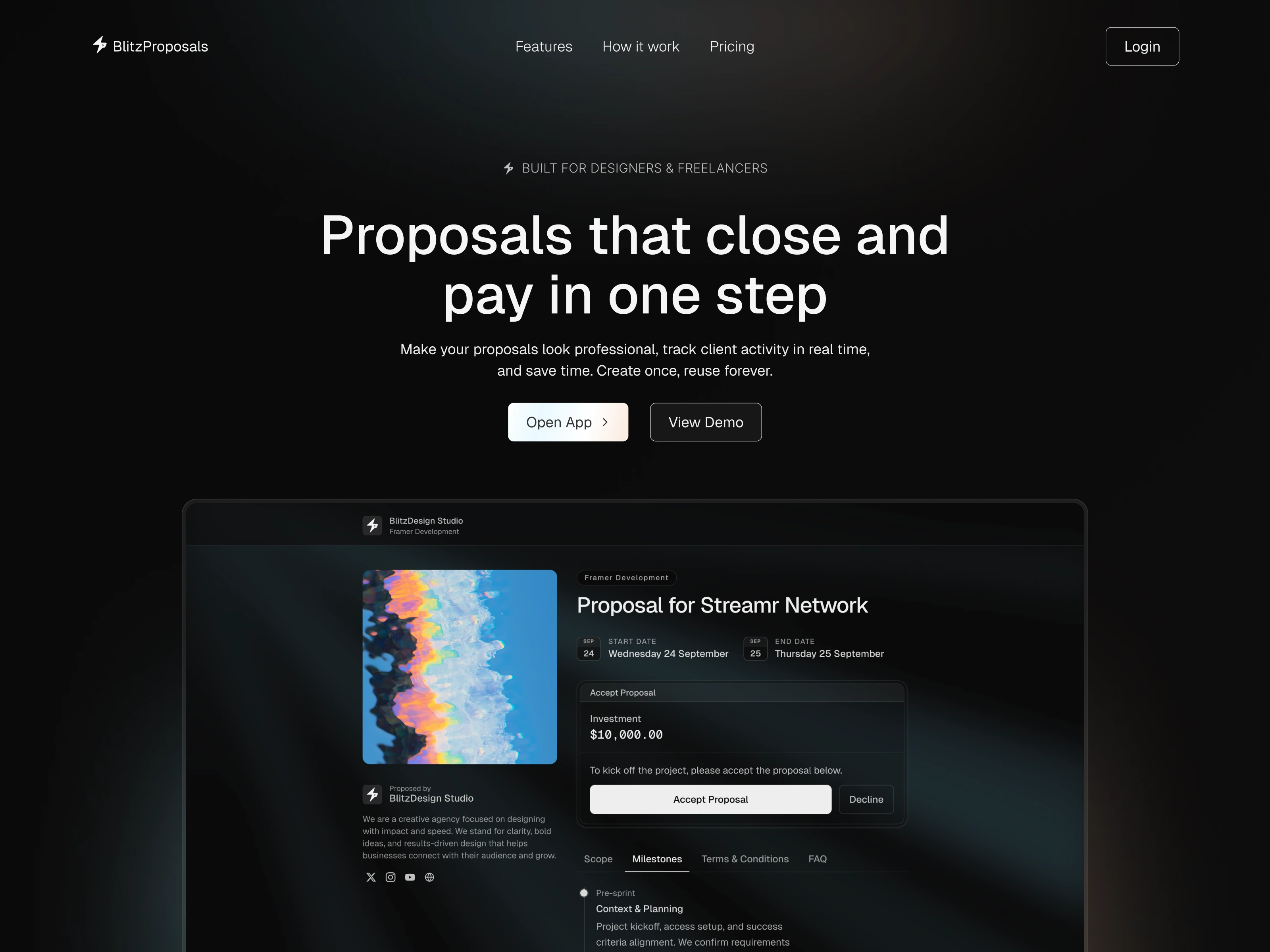 Freelancers lose deals to friction, not talent. Blitz Proposals removes the friction. One link, one decision, one payment. The landing page makes that promise clear from the first second.