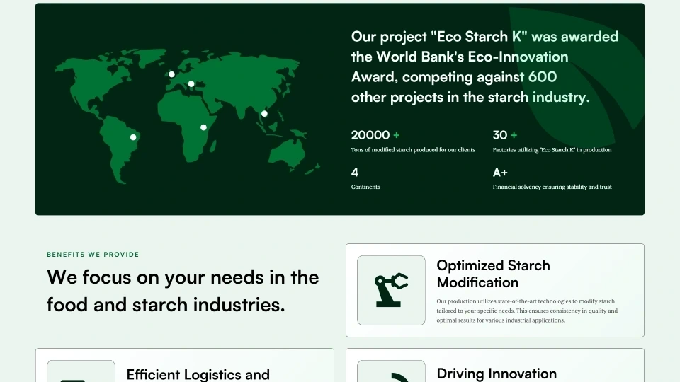 Ecoglobal BTD is a family-owned company founded in 2020 that combines experience with fresh, positive energy in the global market. They focus on discovering and applying modern technological methods for starch modification and improving supply chain logistics of raw materials in food production. As a leading company in modified starches and winner of the World Bank Eco-Innovation Award, Ecoglobal BTD has established itself as an innovative force in eco-friendly industrial solutions.