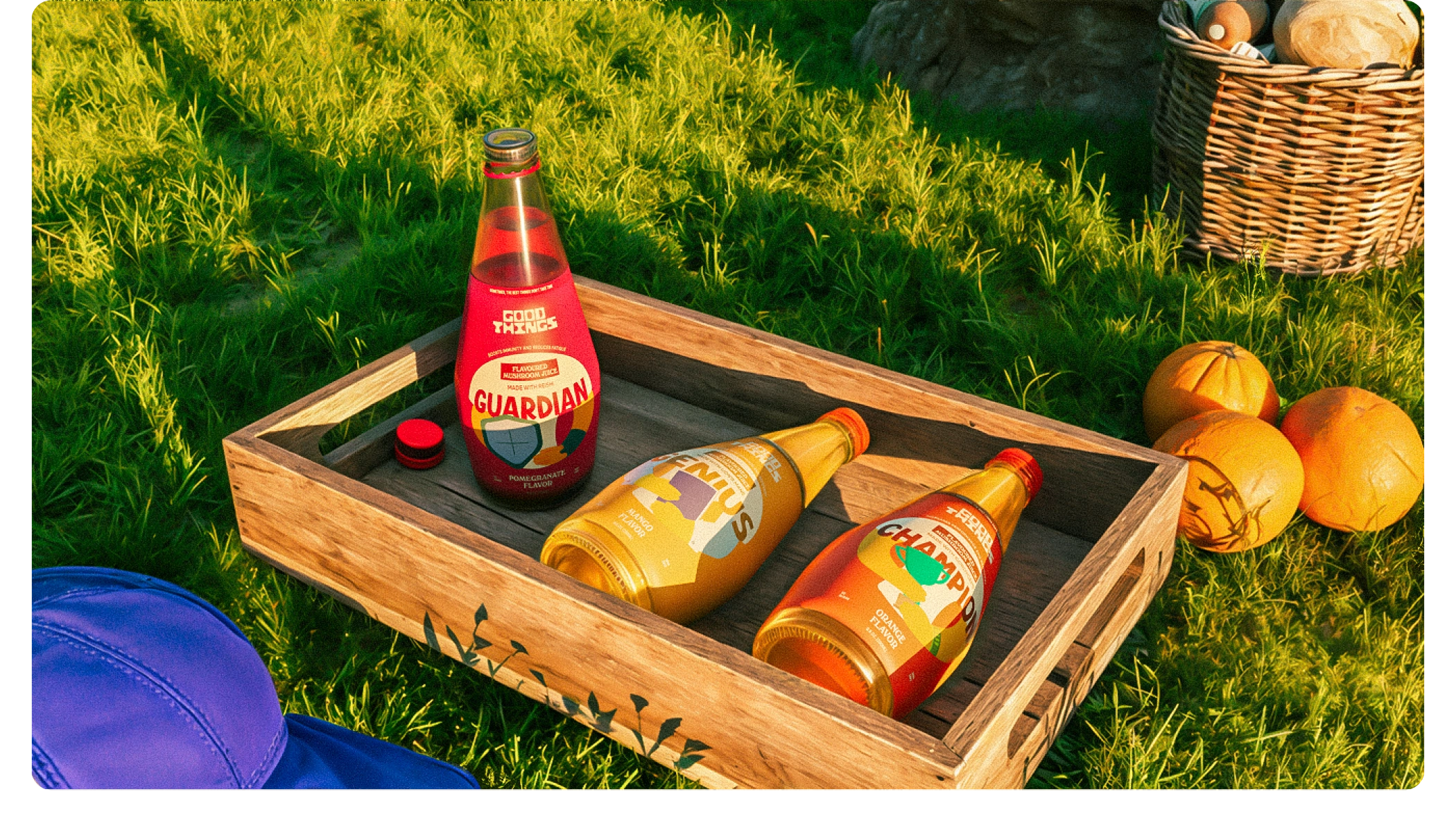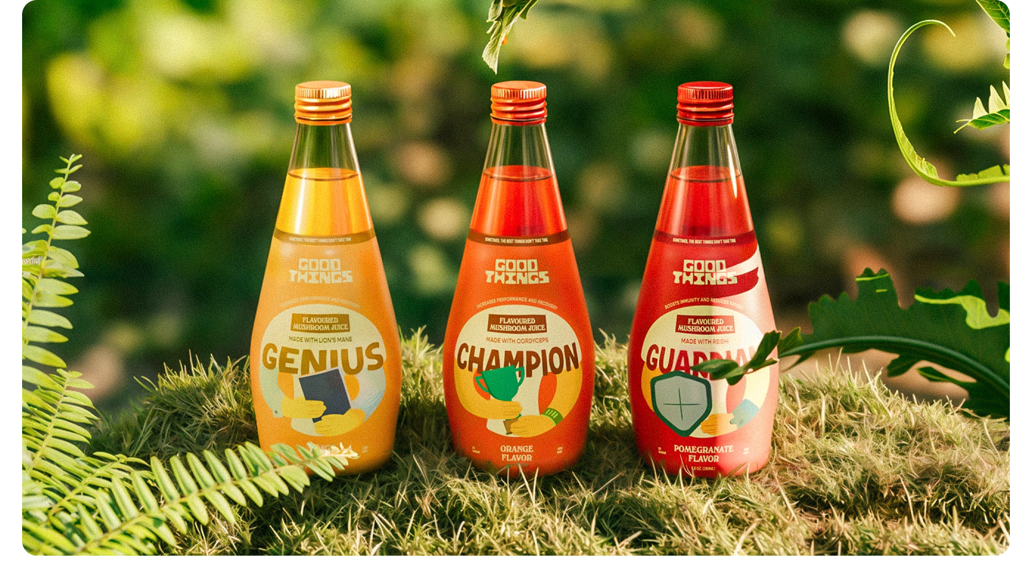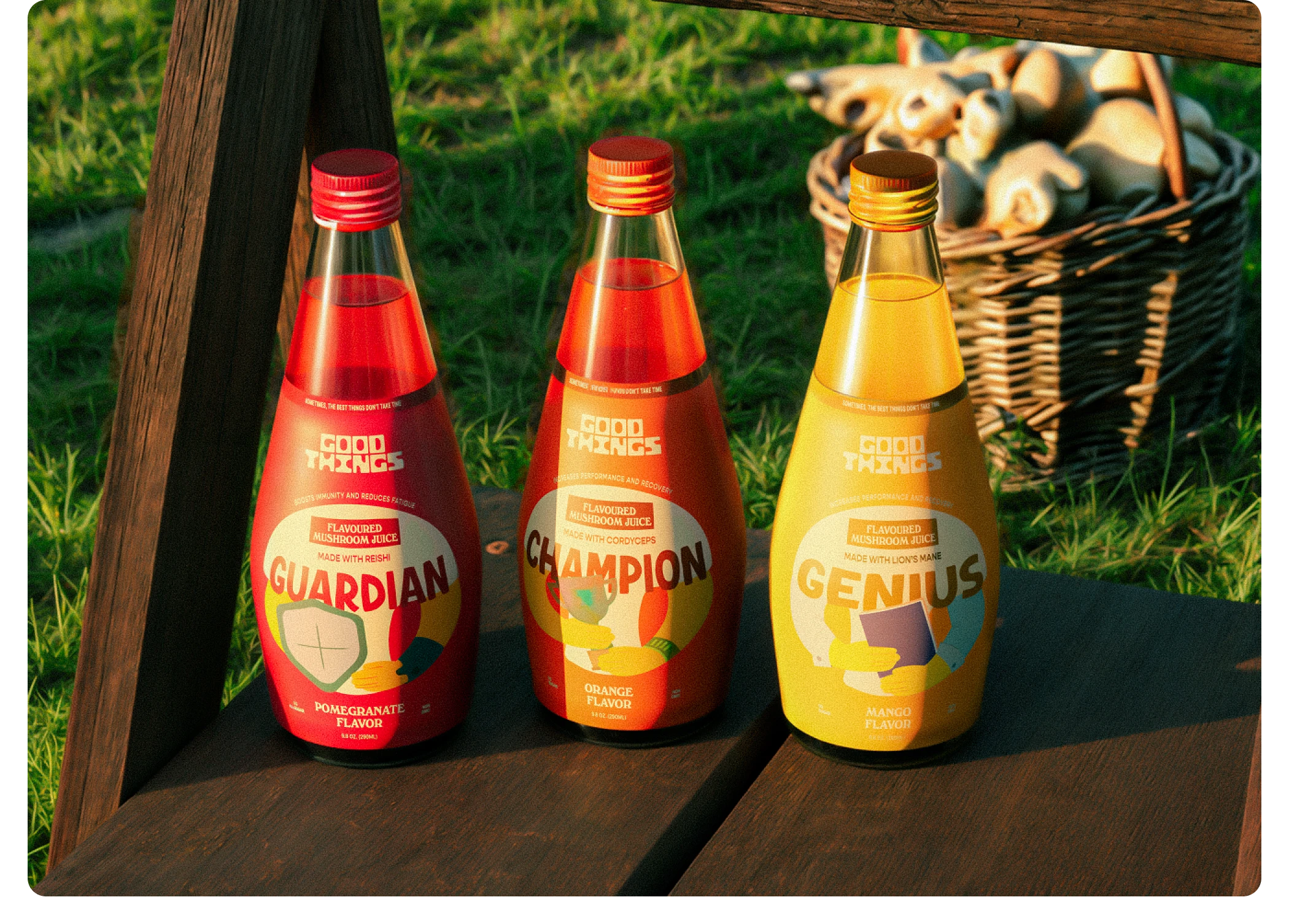 Brand Strategy, Brand Identity and Packaging designMaking niche drinks popular to the massesChallengeSolutionFinal impact: By blending the familiar (fruity flavors, fun and light messaging, and design language) with the new (functional mushrooms), Good Things makes healthy choices easy, enjoyable, and accessible—eliminating the hesitation that often comes with functional beverages.