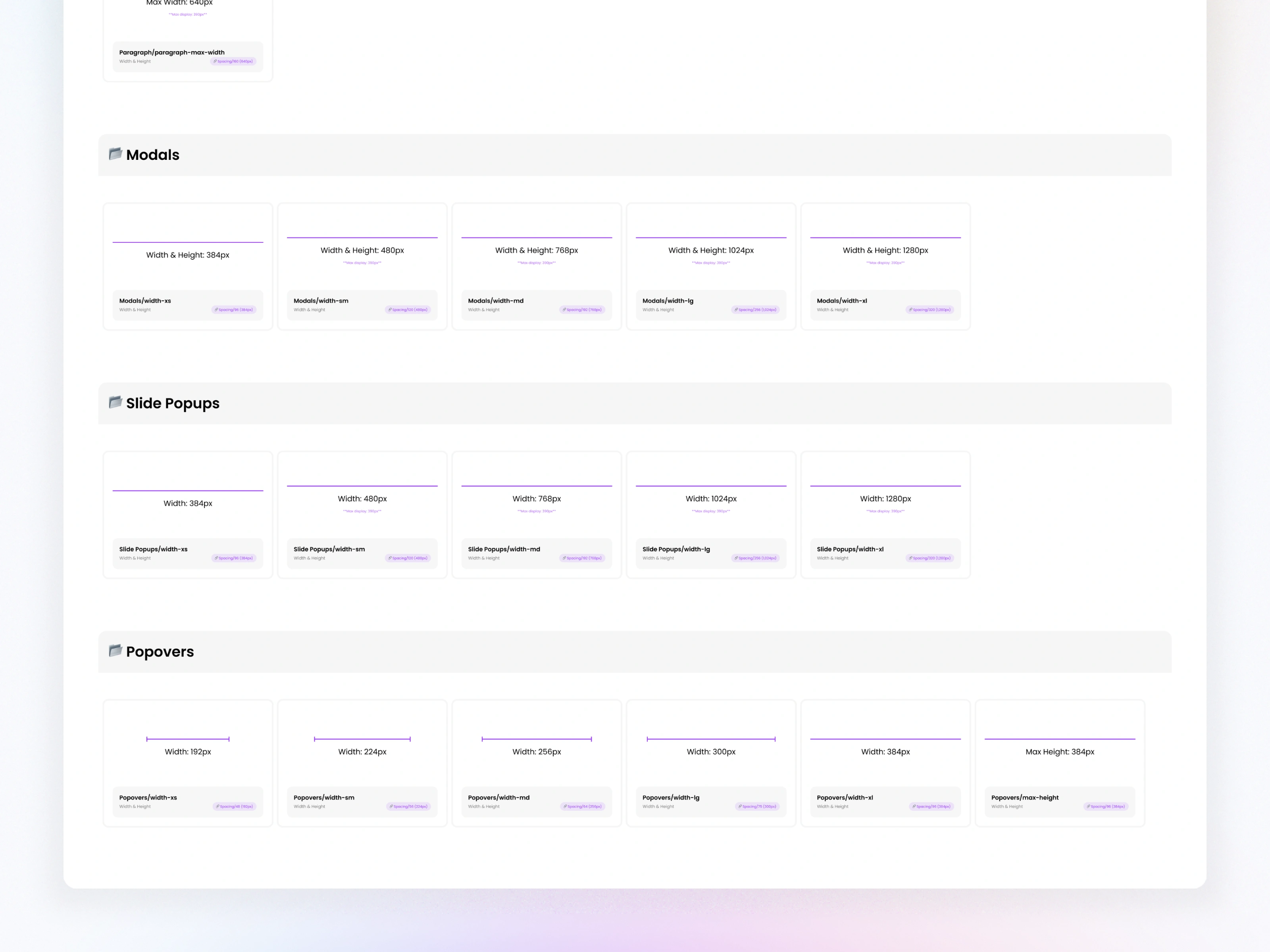 Established standardized widths for modals, slide-ups, popovers, content areas, and table sections.