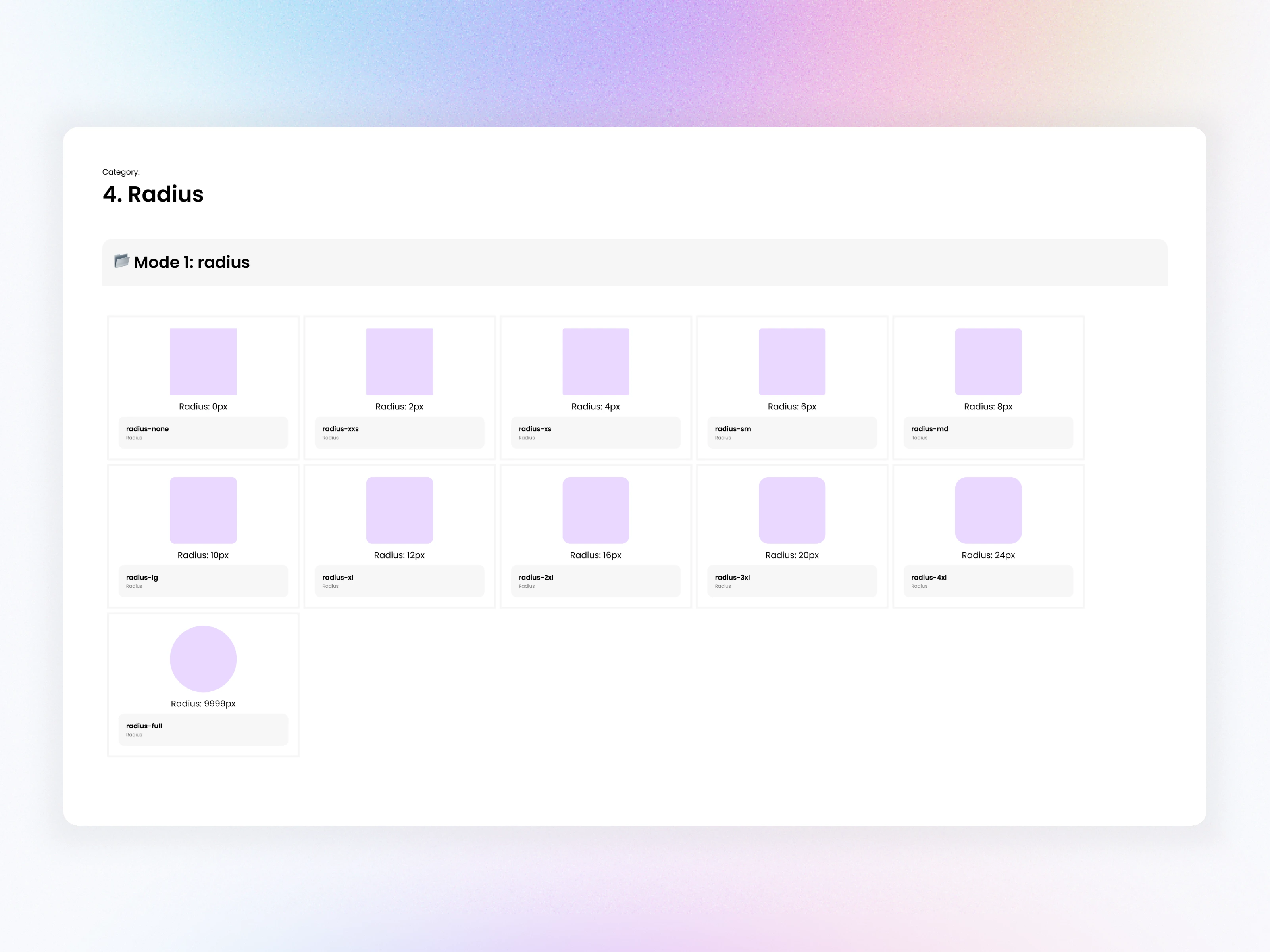 Defined radius tokens from 0px → 9999px to maintain consistency across buttons, cards, popups, tables, etc.