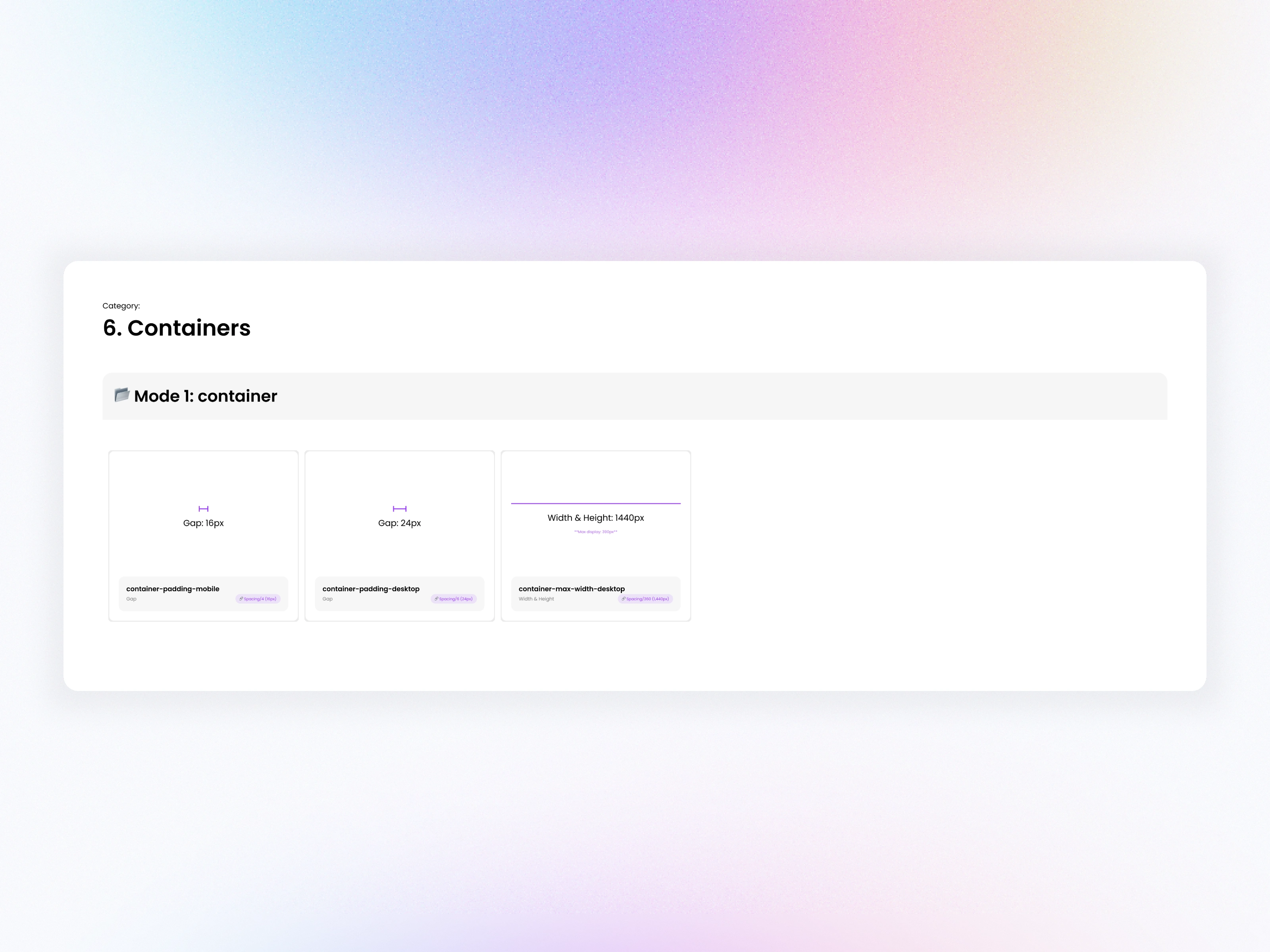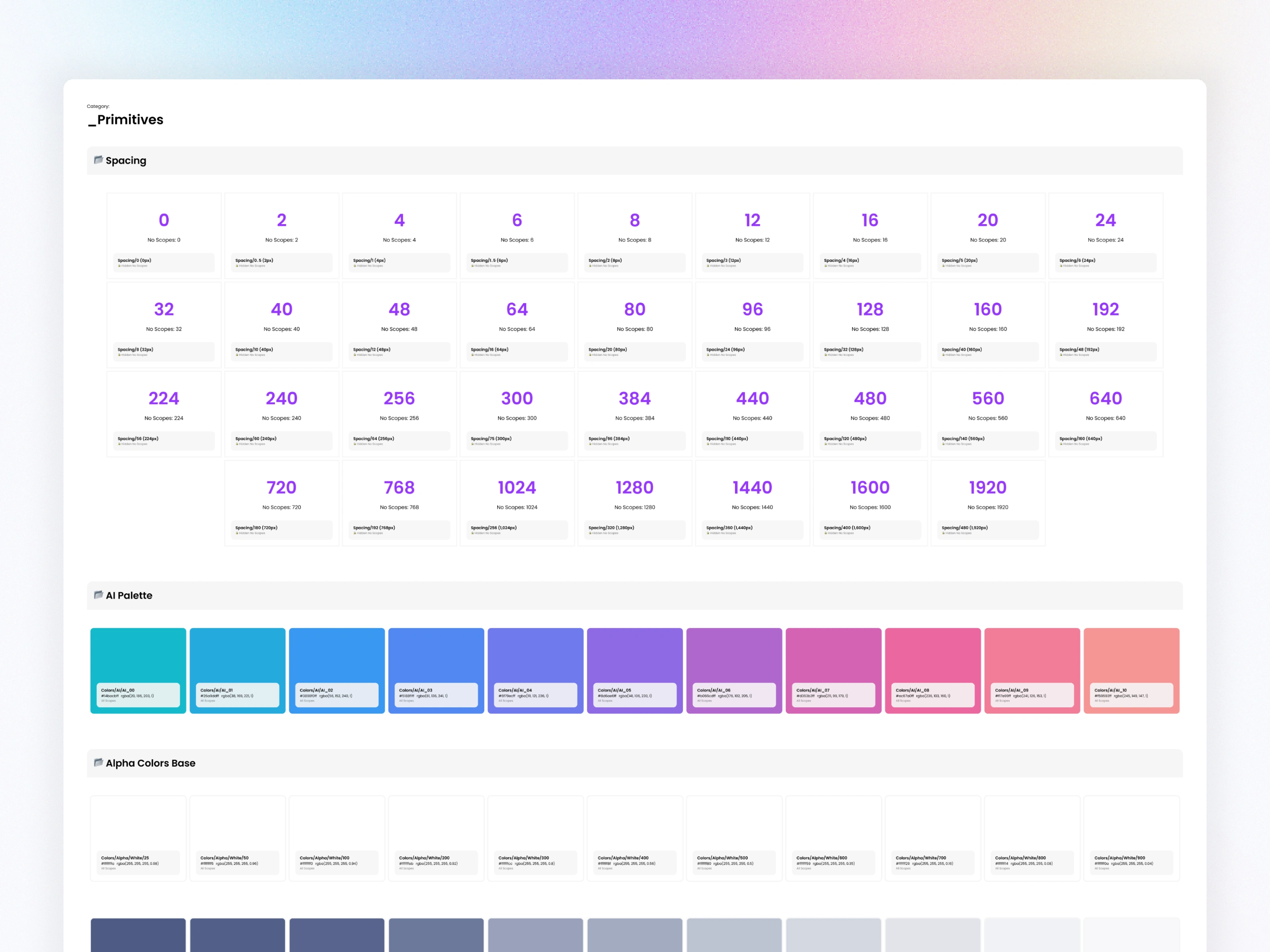 Created a 14-step spacing scale (0px–160px) with consistent gaps used across components, layouts, and responsive grids.