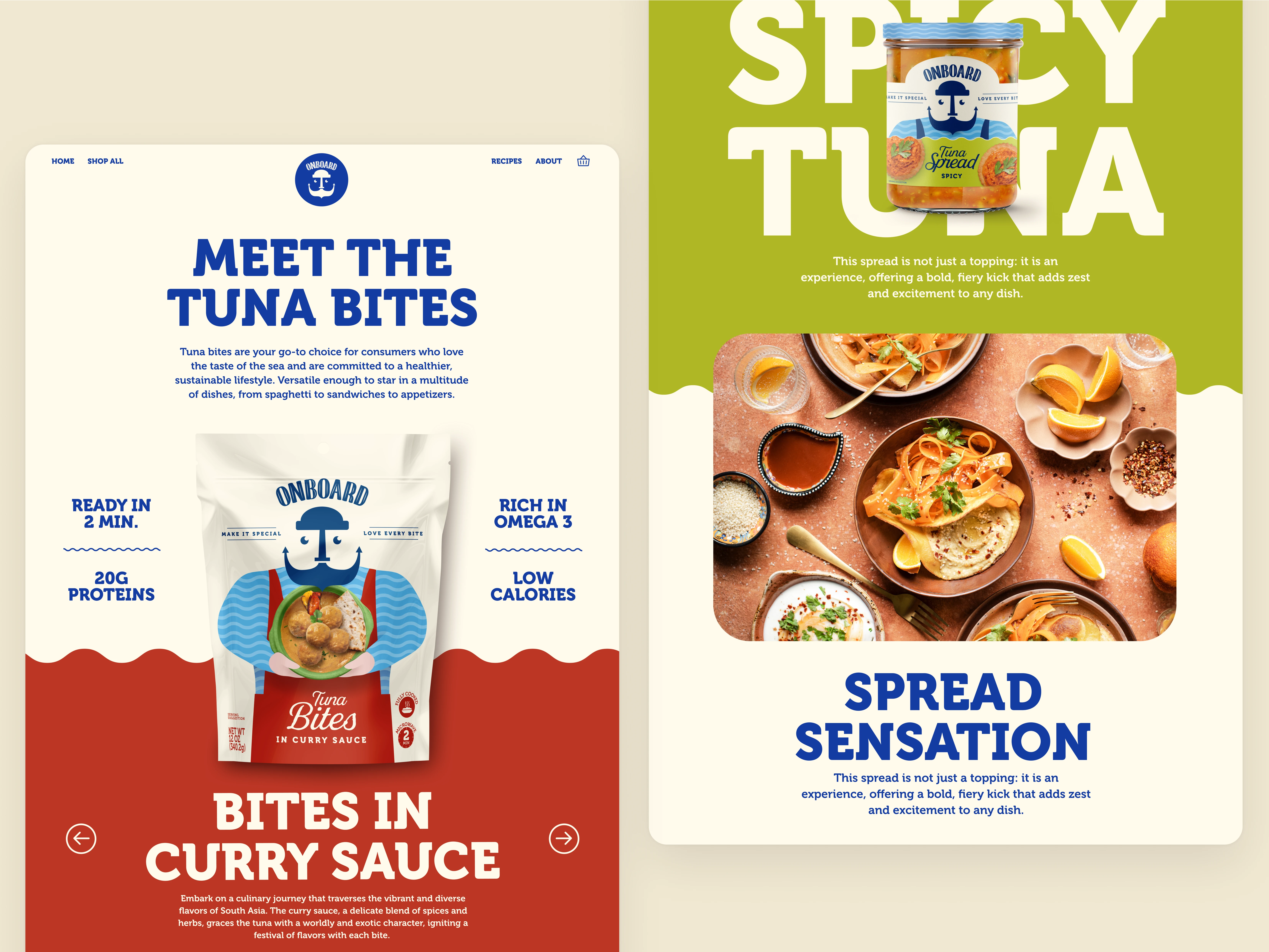 I partnered with the team to bring this vision to life through a vibrant e-commerce platform and playful brand system. At the core of the product line is Tuna Bites - protein-rich, tuna-based “meatballs” ready in 2 minutes - a bold alternative to traditional meat, perfect for bowls, pastas, and sandwiches. The expanded range includes Tuna Spreads (like Spicy and Hummus-style) and premium Fillets, all inspired by Mediterranean flavors and modern wellness trends.