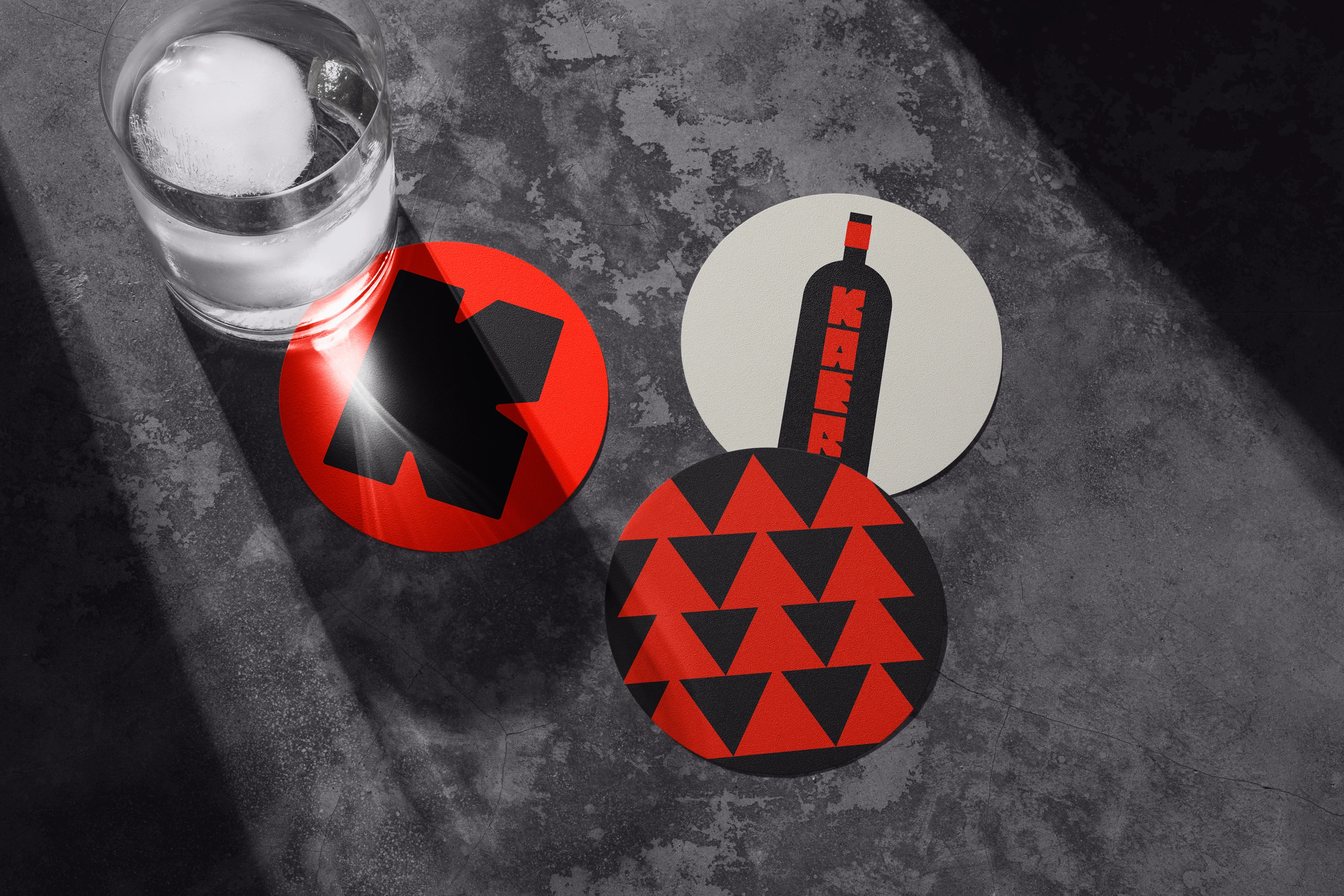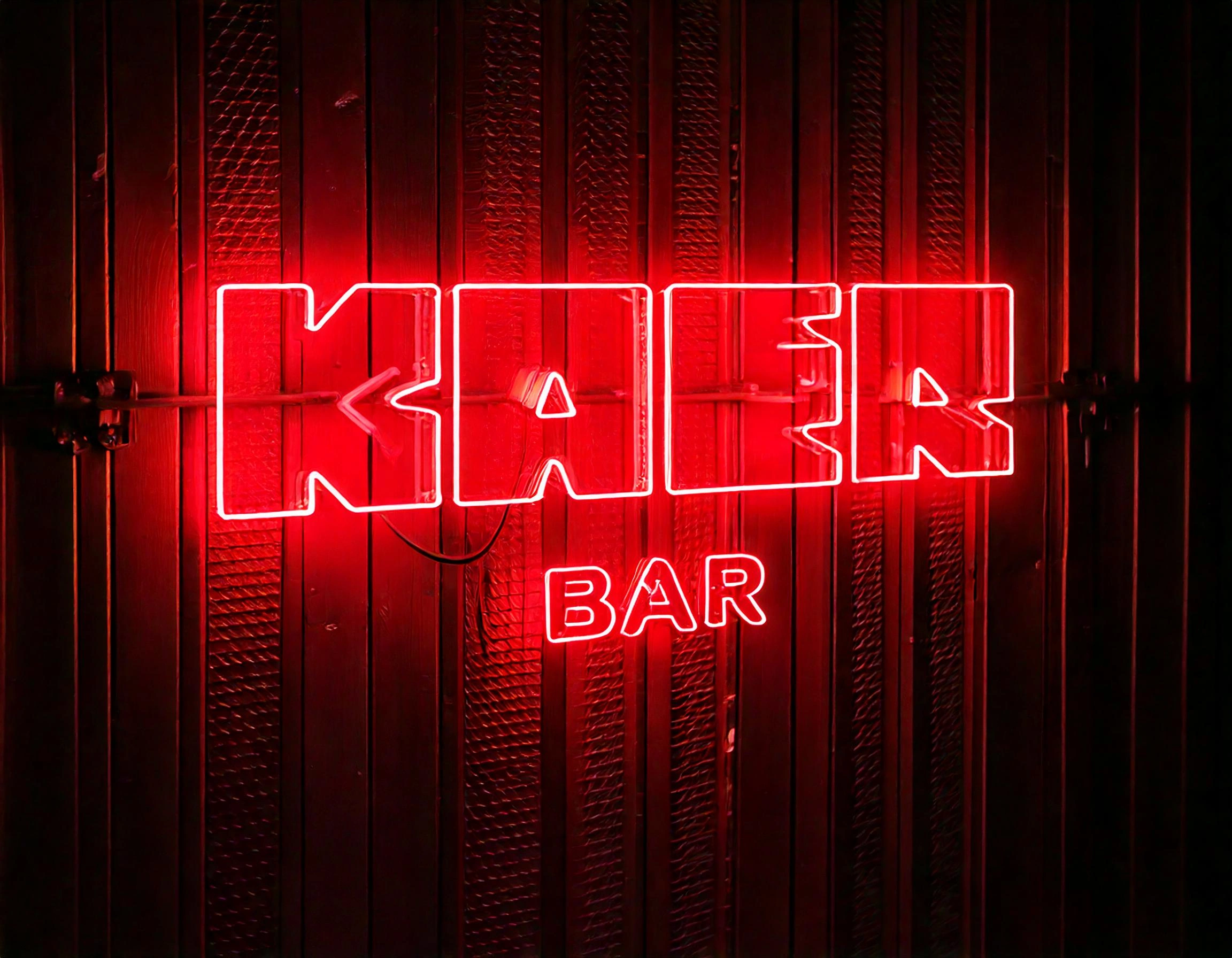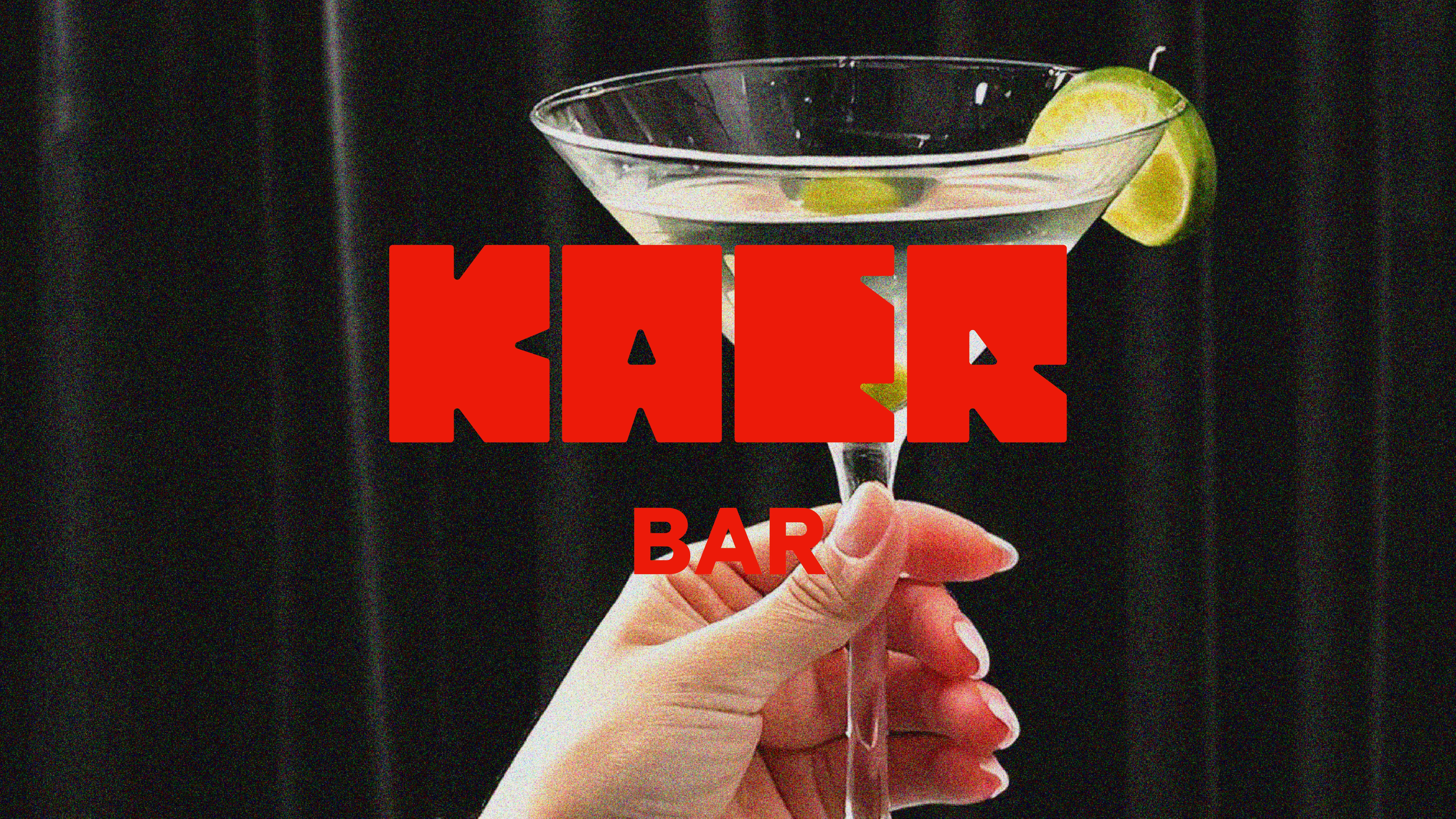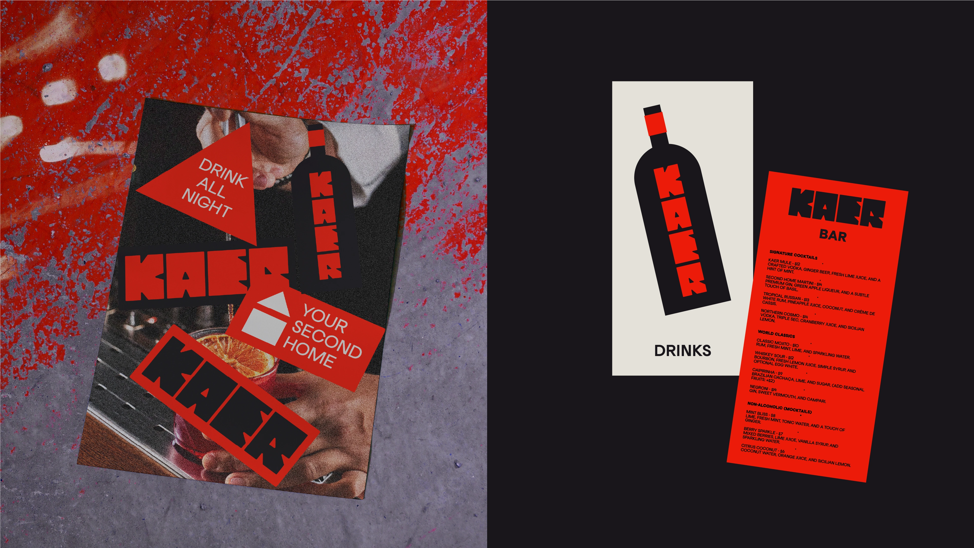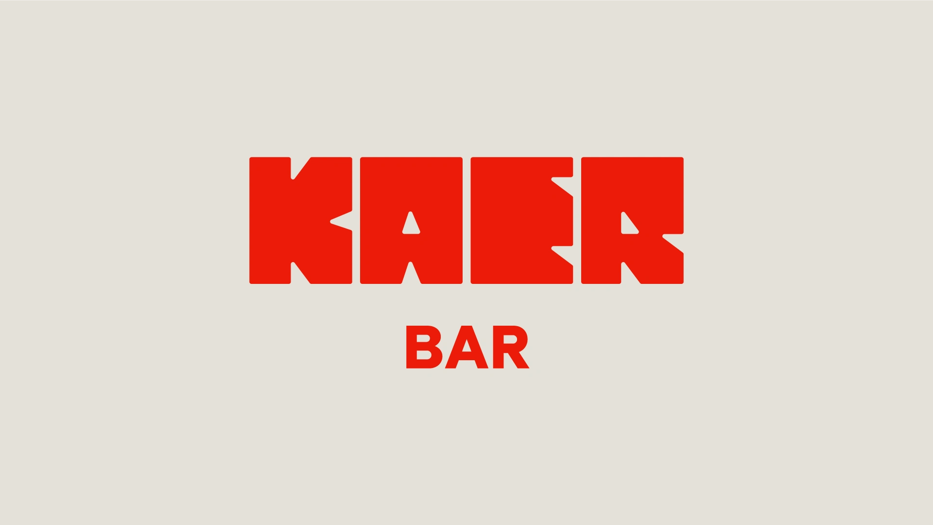 The visual identity of Kaer Bar is a deliberate exploration of typographic brutalism and retro-modern aesthetics, designed to convey boldness, warmth, and sophistication. The logotype, with its geometric and heavy forms, establishes a strong visual presence, while the vibrant red reflects the bar’s energy and approachability.