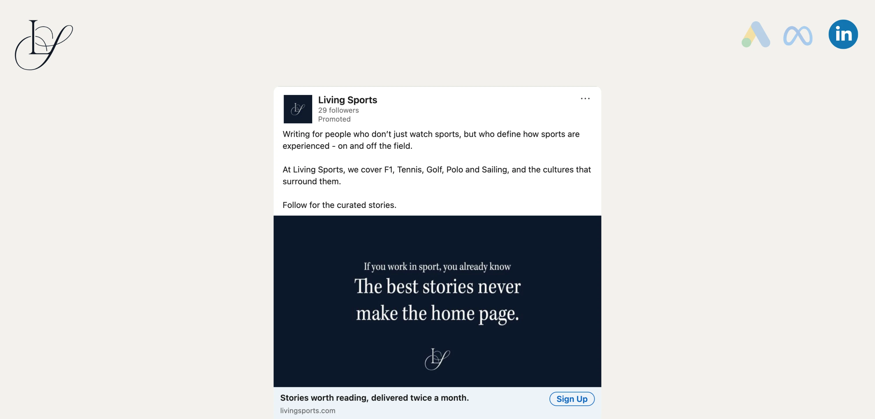 This was a launch campaign for the brand's socials. I executed targeted ad campaigns across Meta, Google Ads and LinkedIn, boosting traffic and sign-ups.