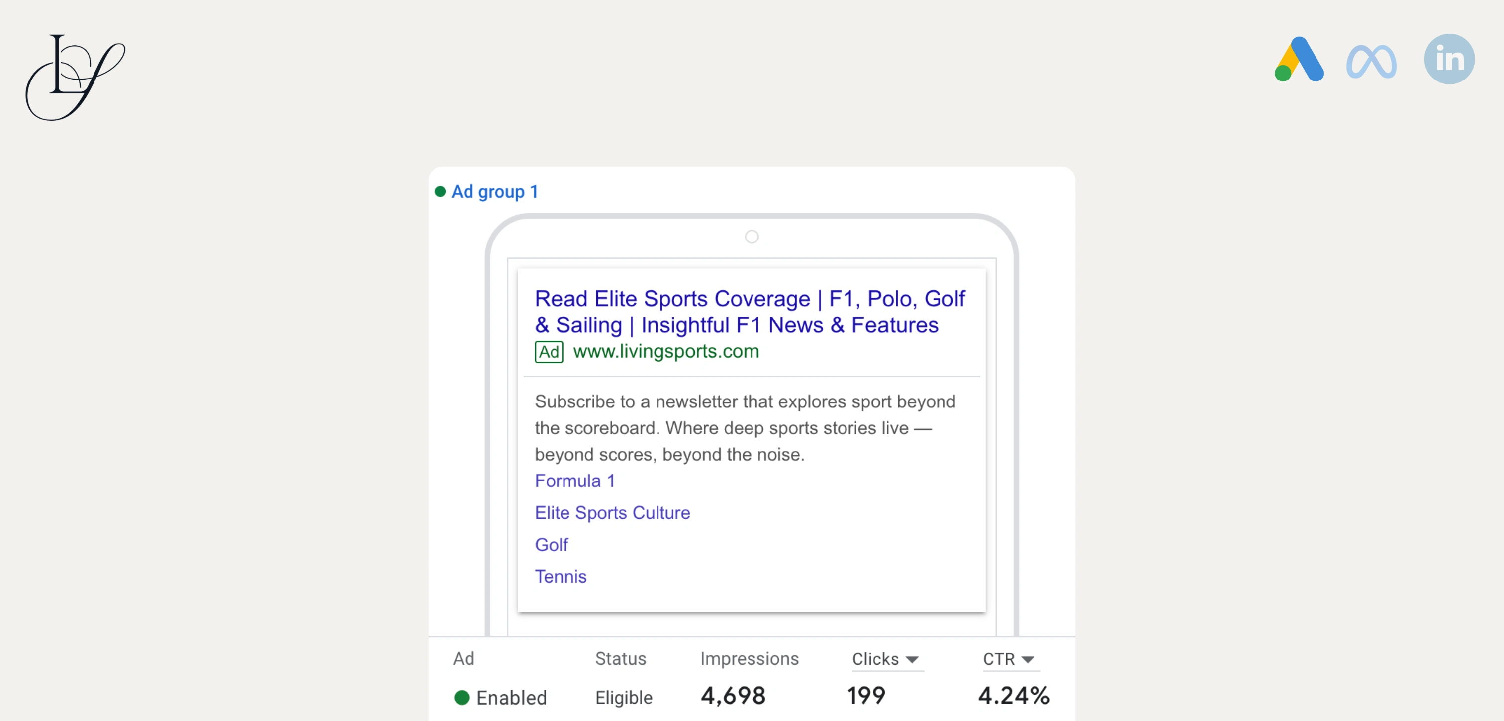 I developed and ran a highly targeted Google Search Ads campaign focusing on high-intent keywords across their full sports coverage (F1, tennis, golf, sailing, polo).