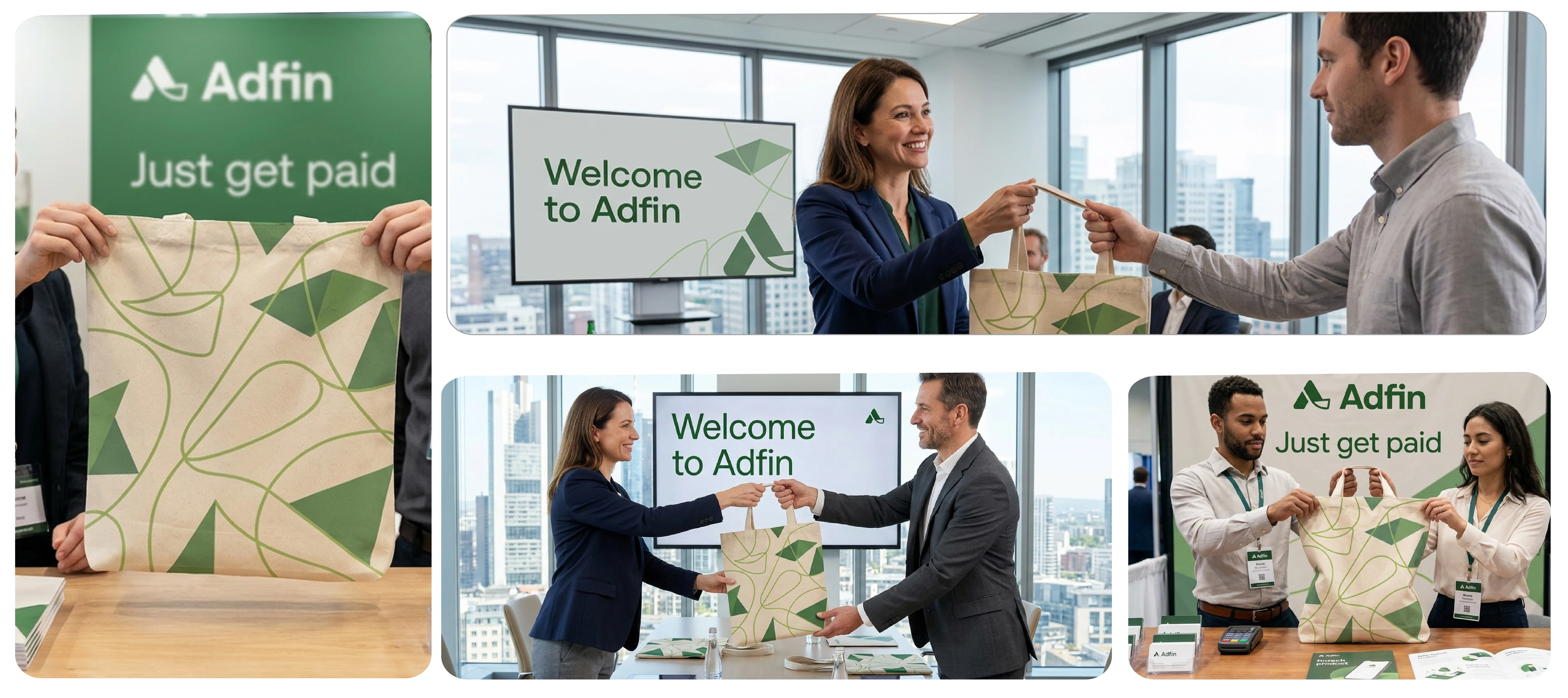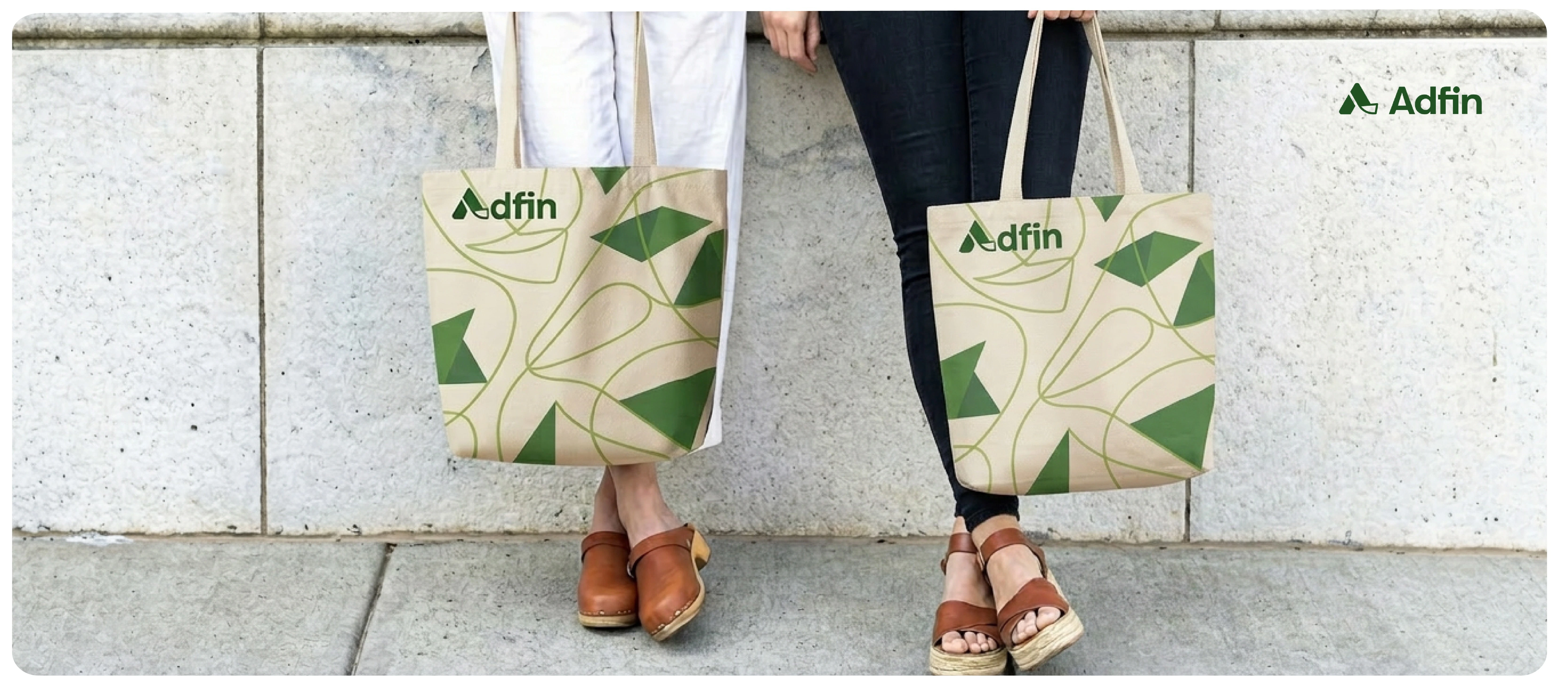 The tote designs were created to support Adfin’s presence at fintech conferences and startup events throughout 2026. As reusable merchandise, they extend brand visibility beyond the event floor — transforming attendees into mobile brand ambassadors.