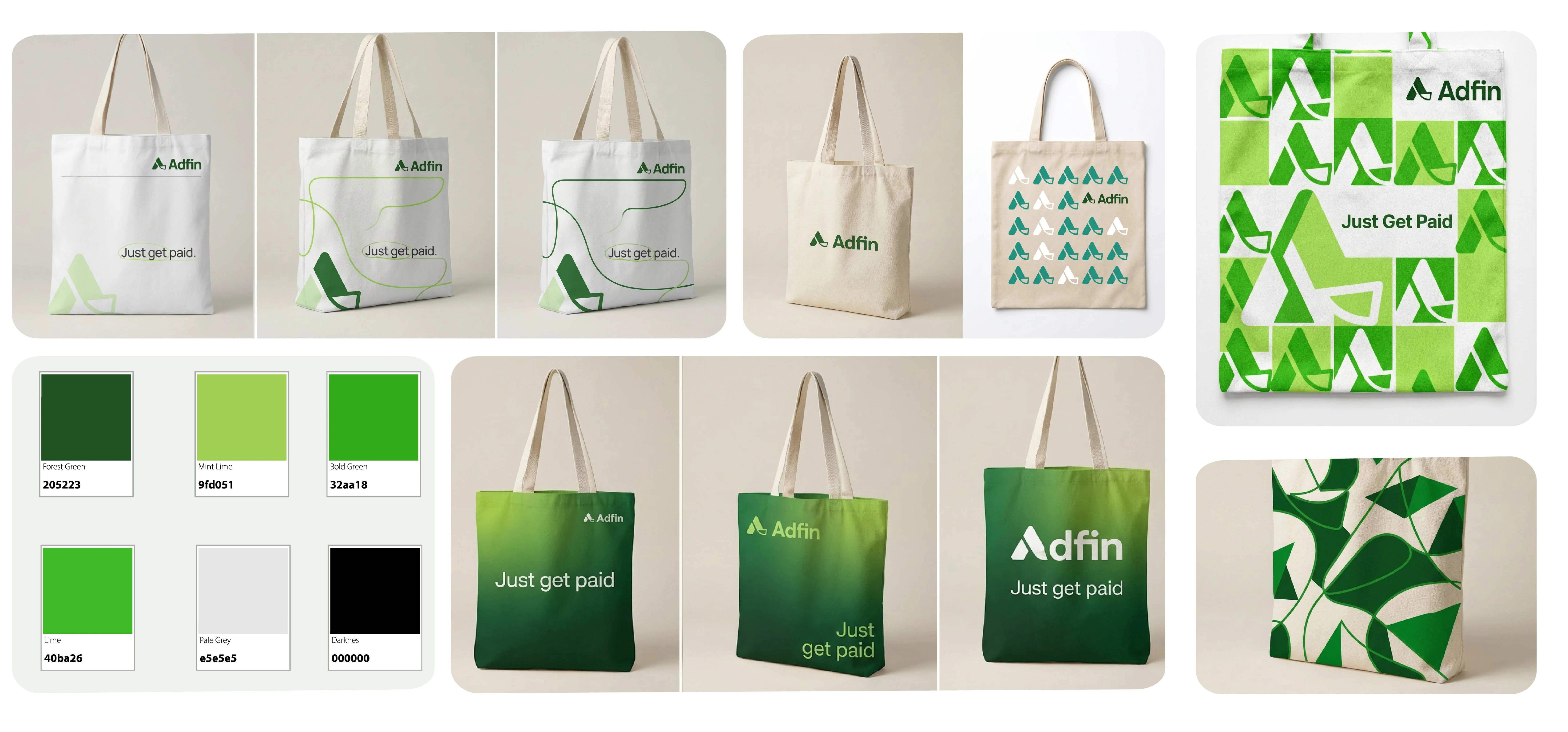 I designed a series of bold, logo-forward tote concepts that make Adfin’s brand impossible to ignore. Using their dark green and white palette, I pushed expressive graphics while keeping production practical and print-ready — built to travel far beyond the booth.
