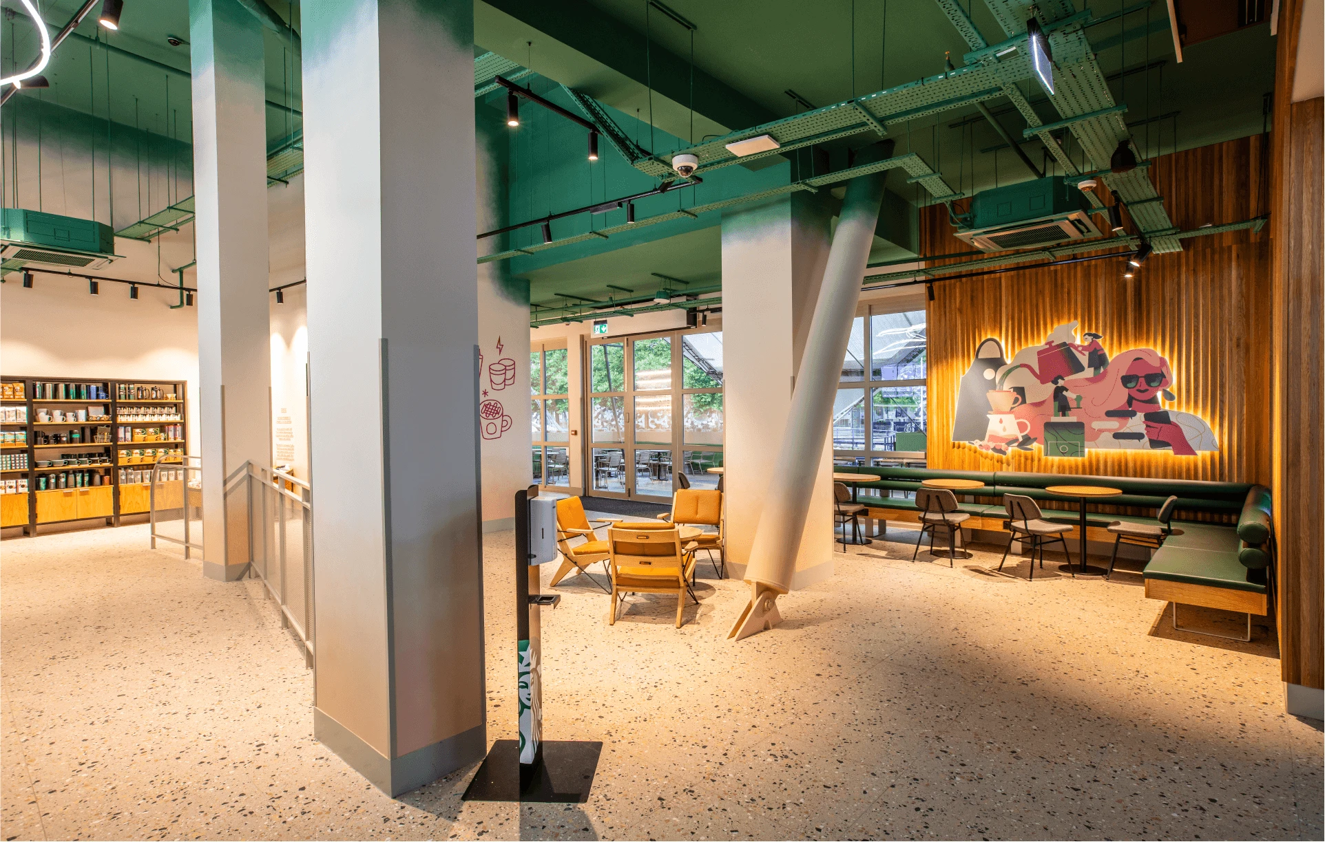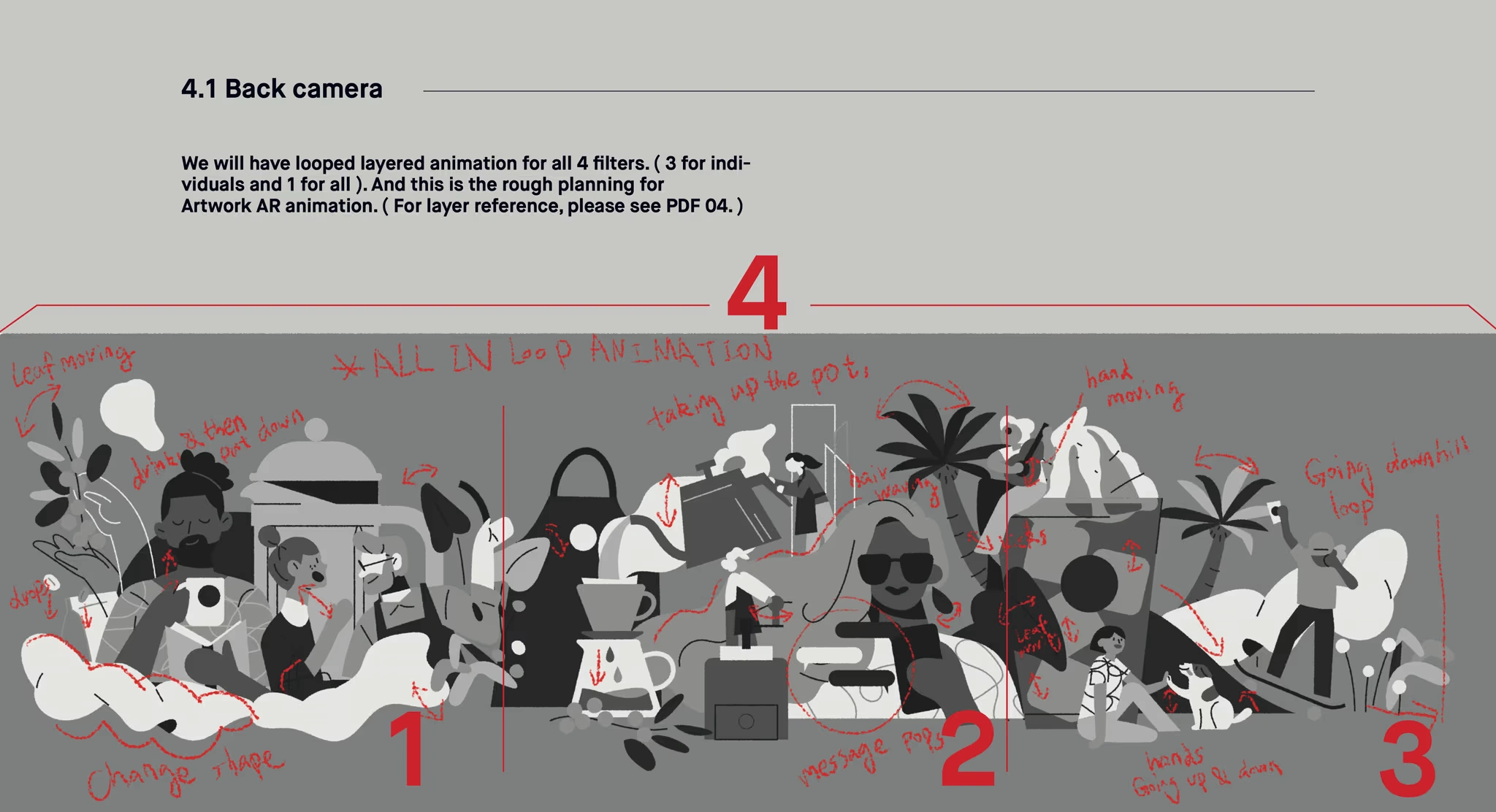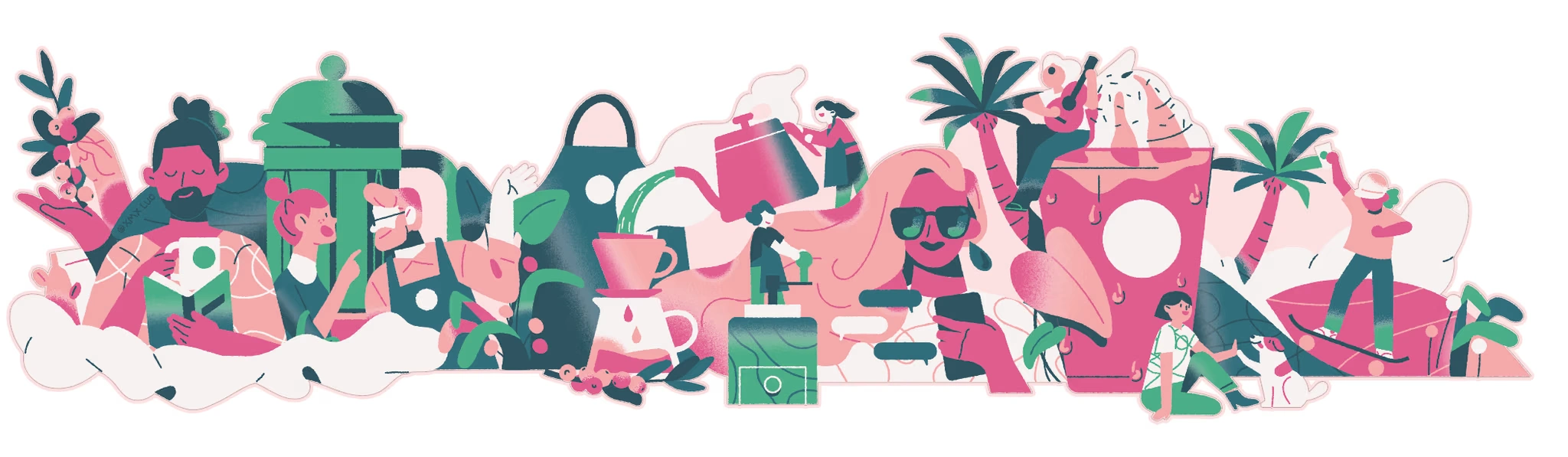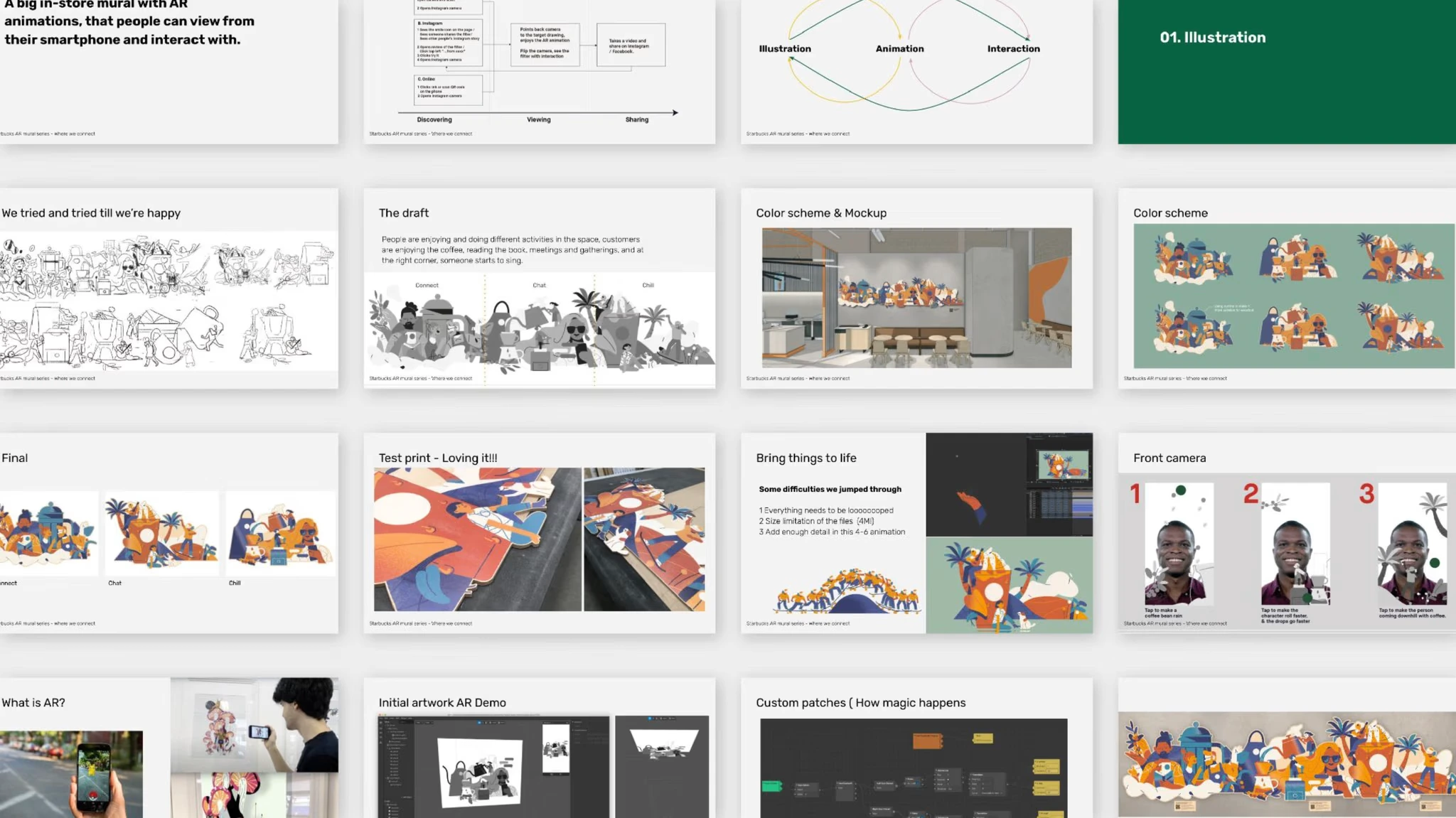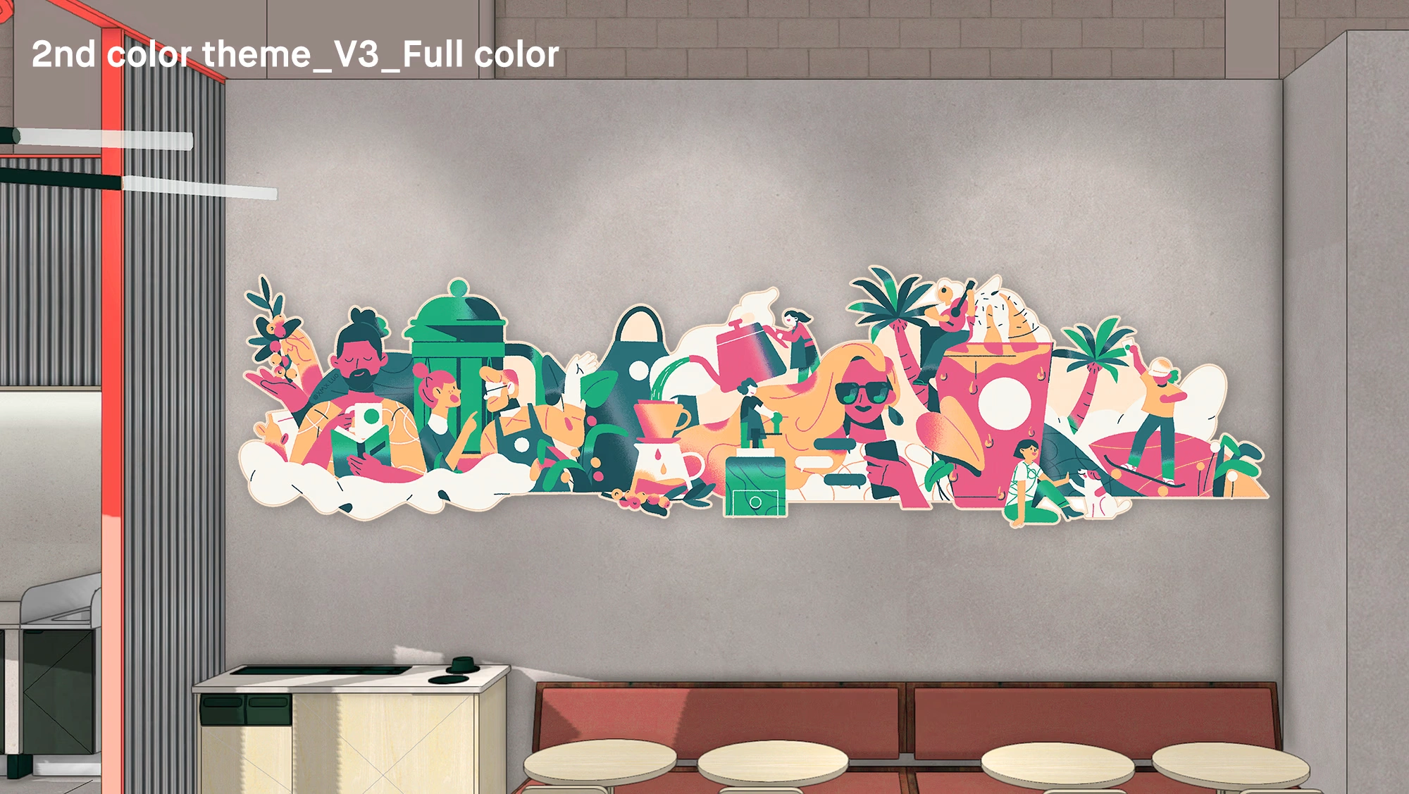 For the project, working closely with the shop concept design team, I created three unique scenes showcasing interactions between customers and baristas in various settings: inside the shop, in a virtual space, and outdoors, all highlighting the joy of connection. I collaborated closely with Starbucks’ concept designer to ensure the murals aligned with their brand vision, while also selecting the most suitable augmented reality (AR) solution. Using Spark AR, we integrated filters that can be accessed through Instagram by scanning a QR code beneath each mural.