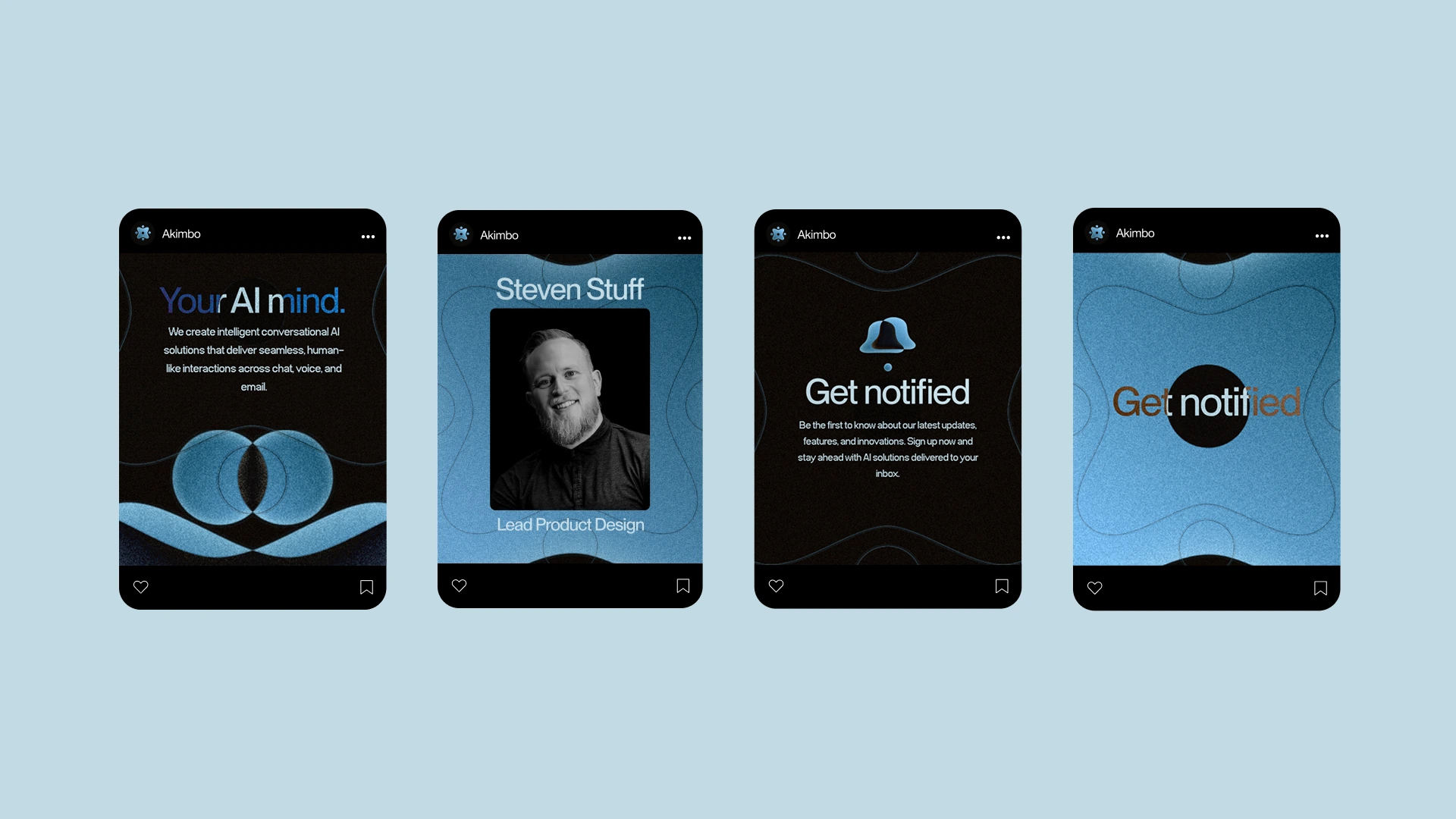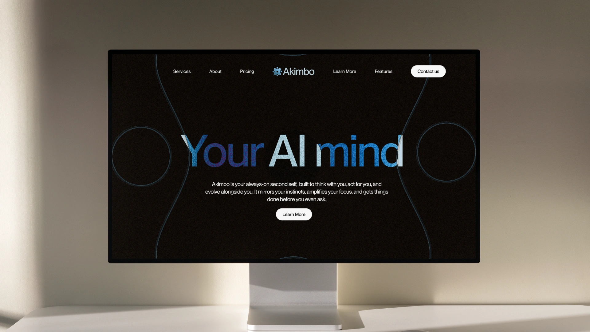 Akimbo is a dual-intelligence AI brand built for the era of personal automation, giving ambitious individuals an always-on second mind to navigate work, life, and everything in between. We developed a brand identity that brings this sense of duality to life, seamlessly aligning with Akimbo’s core values while capturing the balance between intuition and intelligence, human and machine.