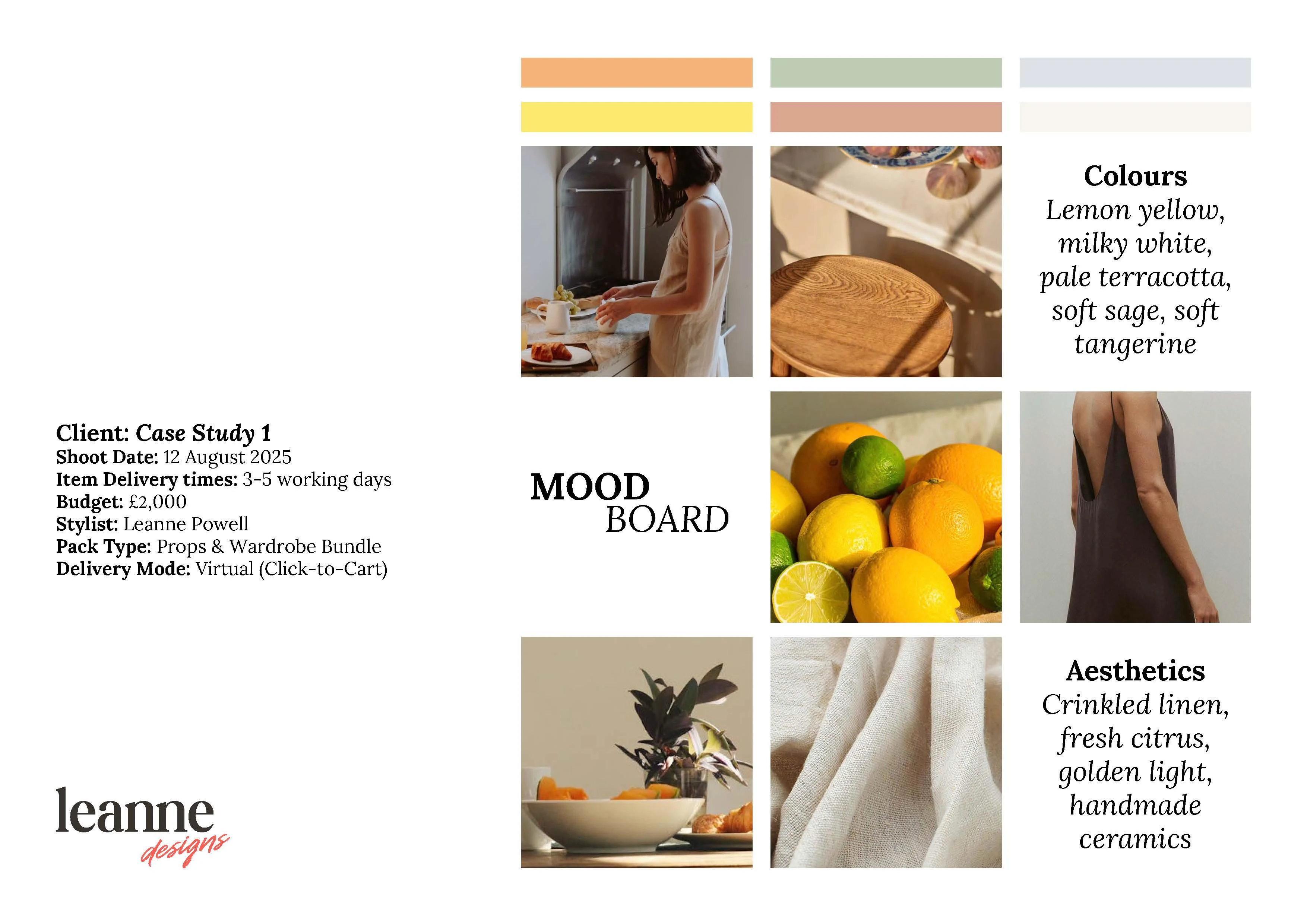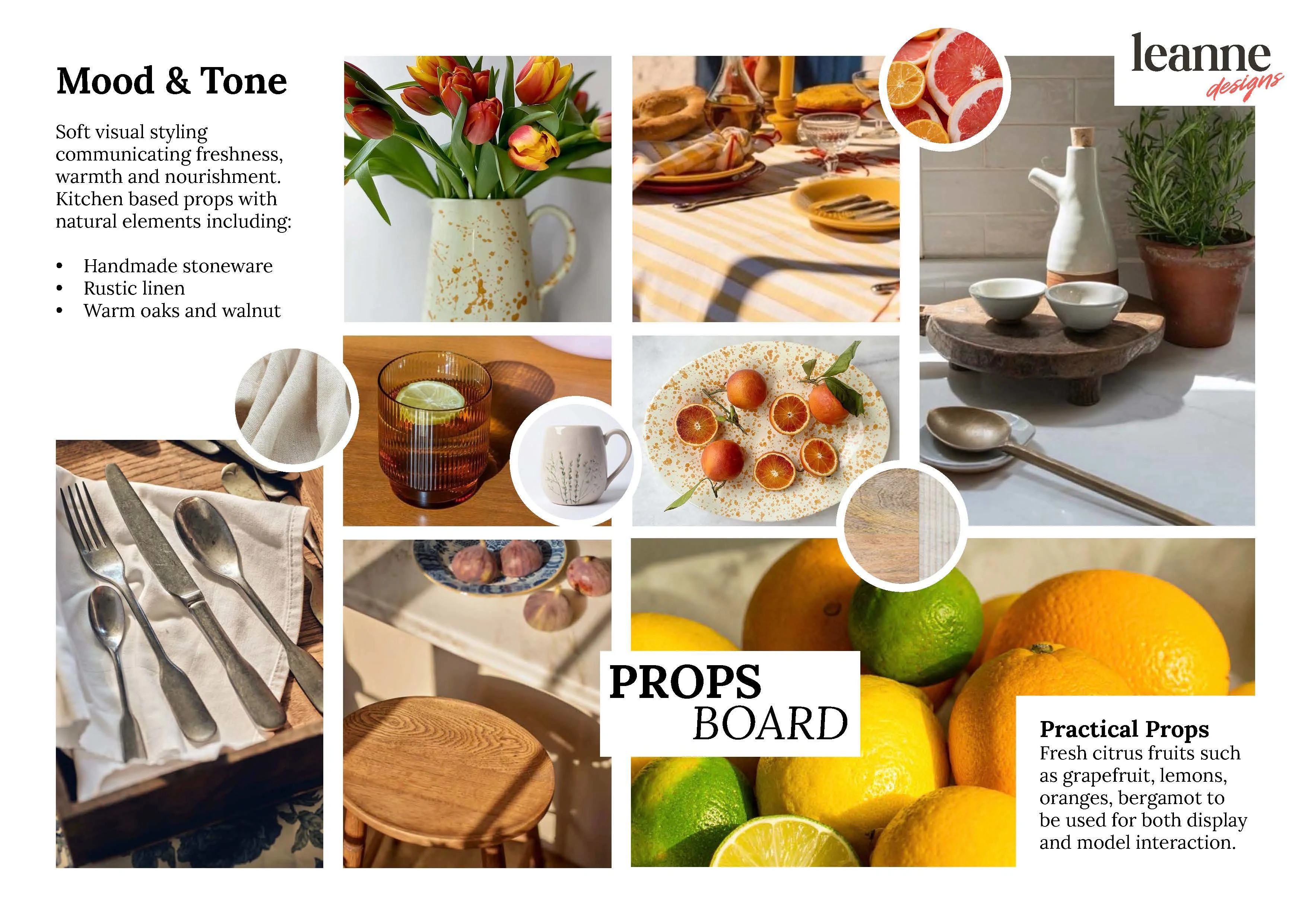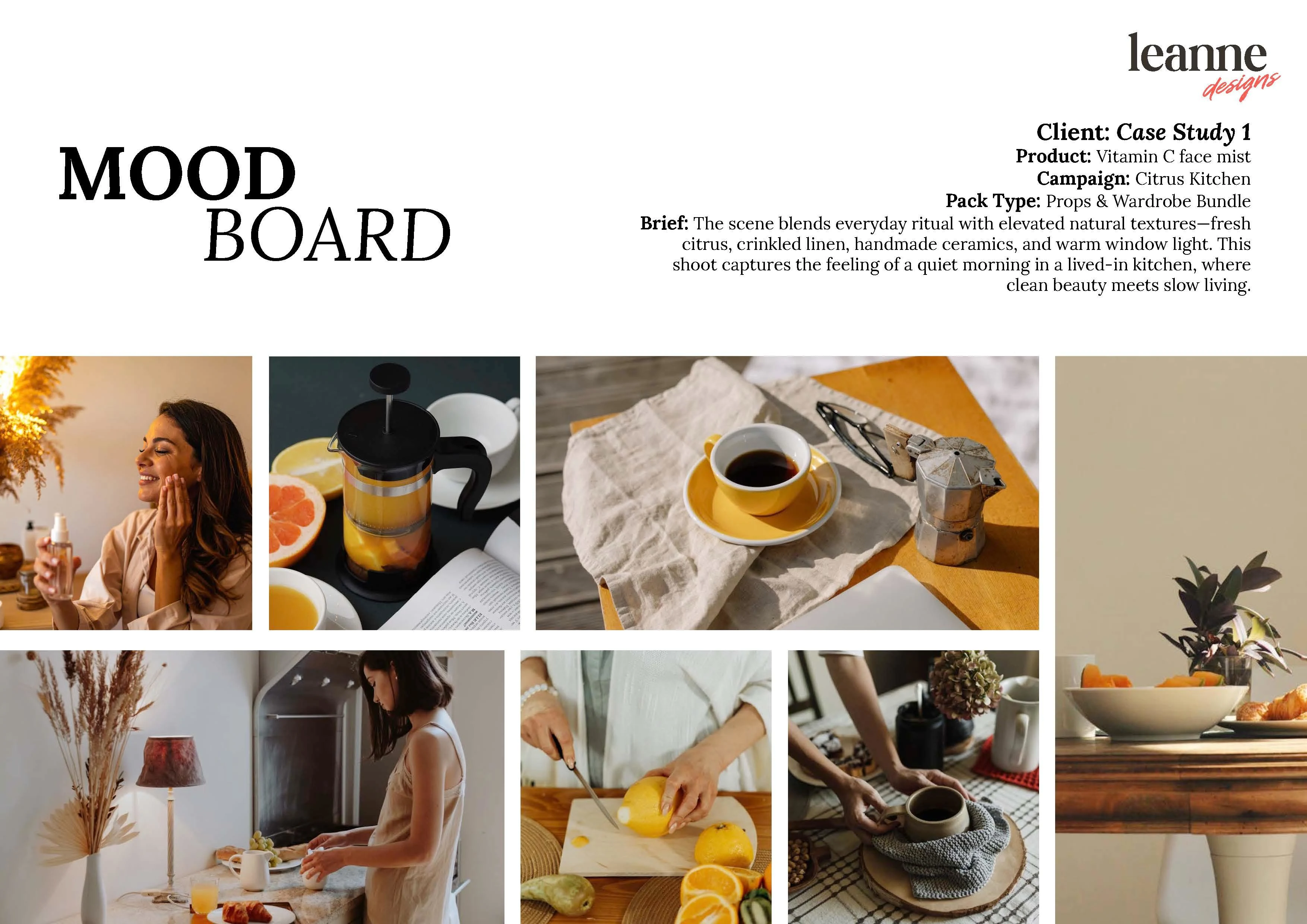 “Citrus Kitchen” is a virtual styling concept created for a summer skincare shoot, focused on a vitamin C facial mist. The goal was to capture a warm, tactile morning mood using fresh citrus, soft textures, and wardrobe that feels casual yet elevated. This styling pack includes a custom moodboard and curated shopping links for props and wardrobe, designed to help bring the shoot to life with ease and visual clarity.
