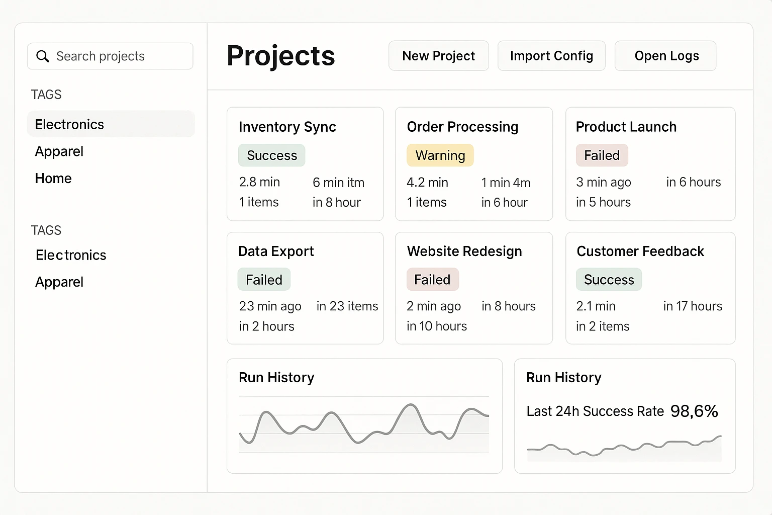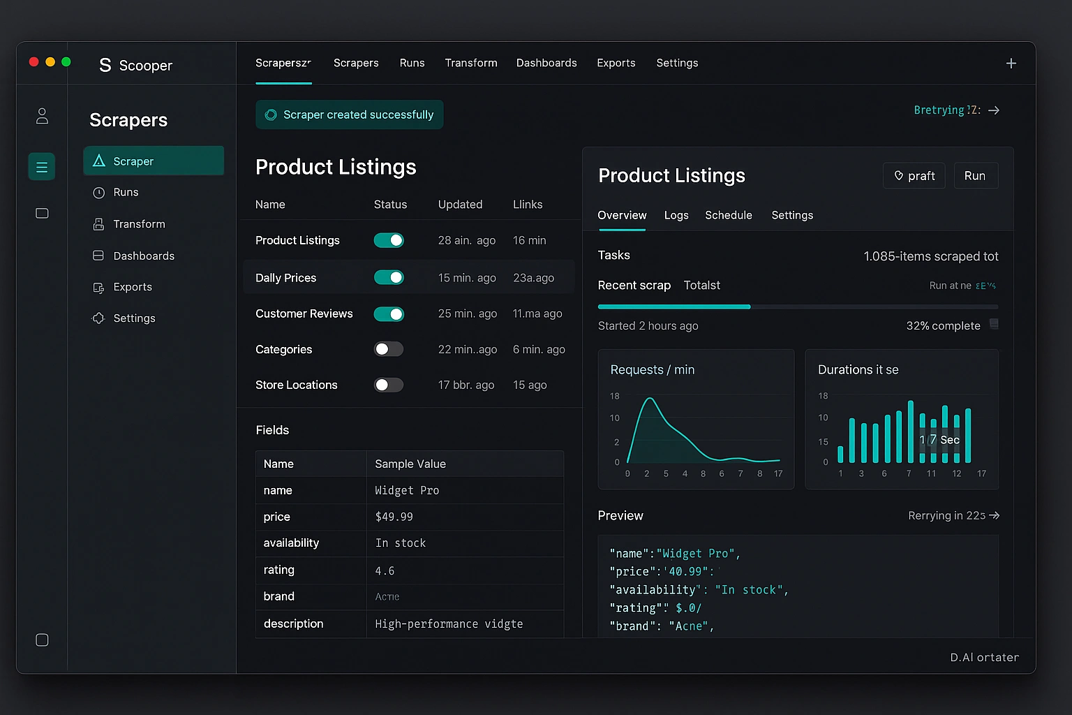 Scooper is an Electron-based web-scraping and data collection workspace that captures raw e-commerce data, monitors runs with real-time logs, transforms results into interactive dashboards, and exports for further analysis. It integrates tightly with AWS for auth, persistence, and LLM-powered enrichment, enabling reliable, cross-platform data operations.