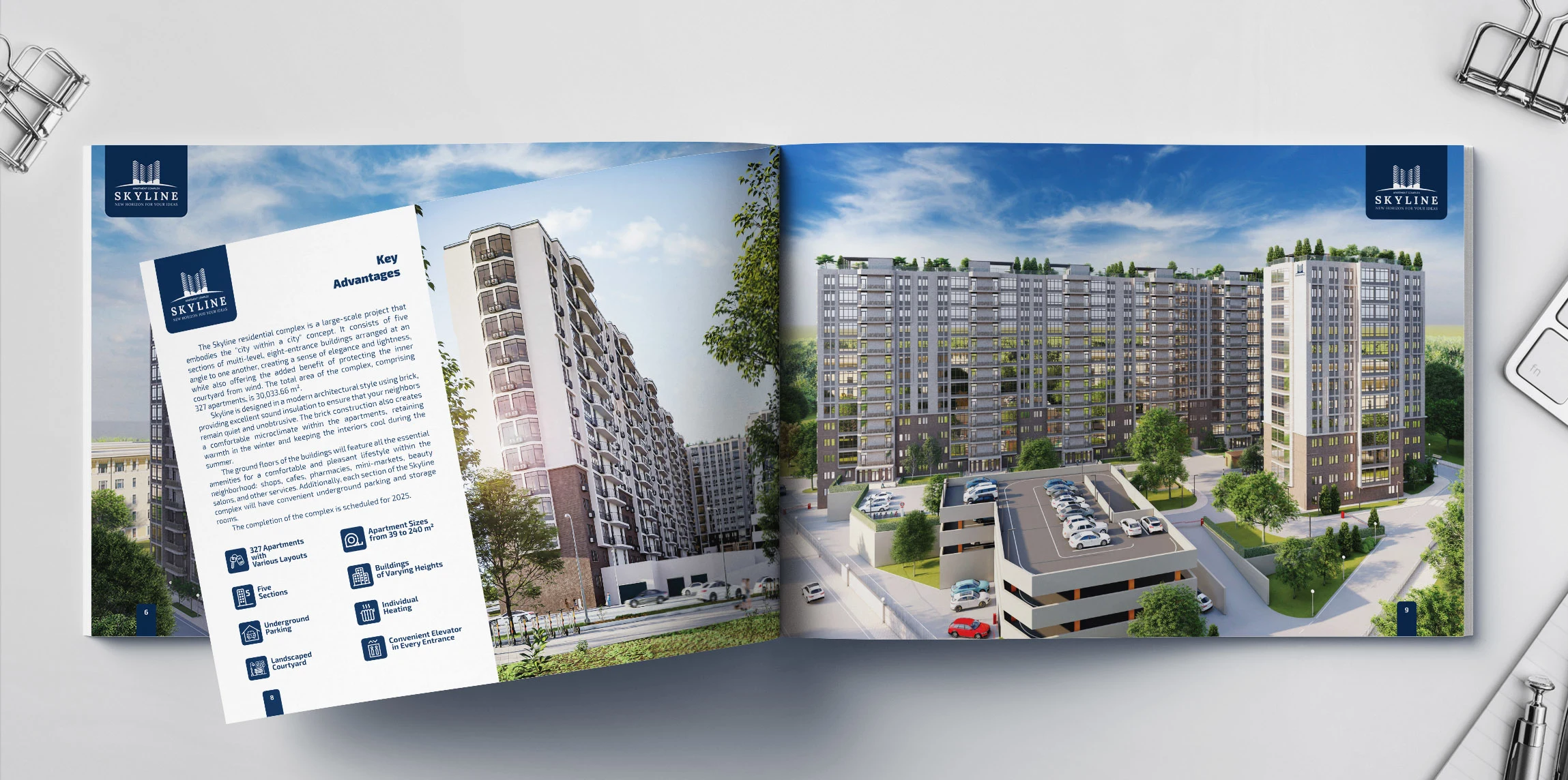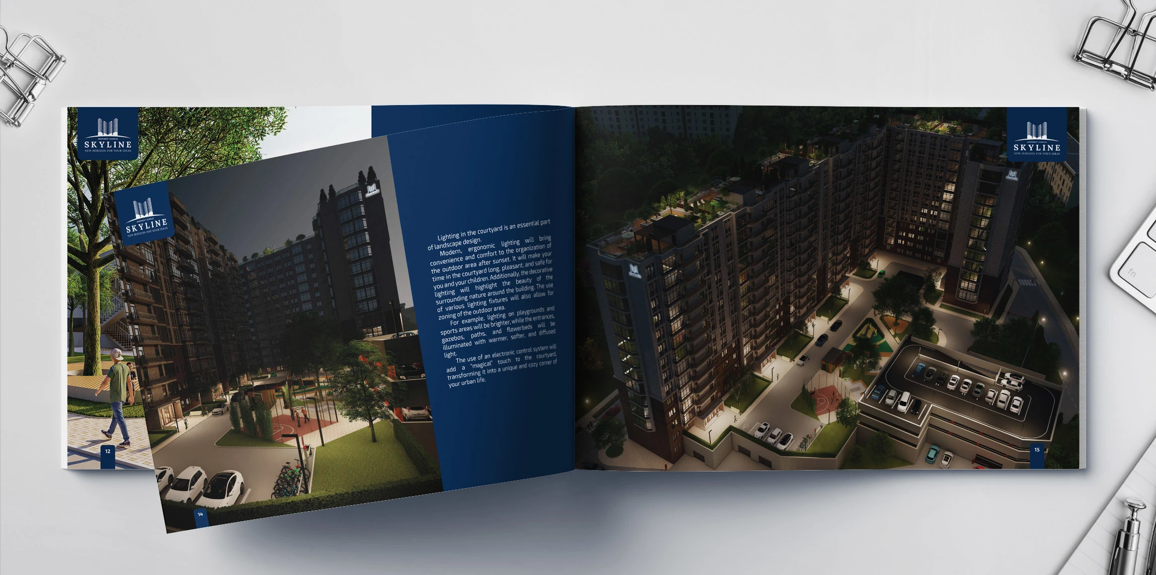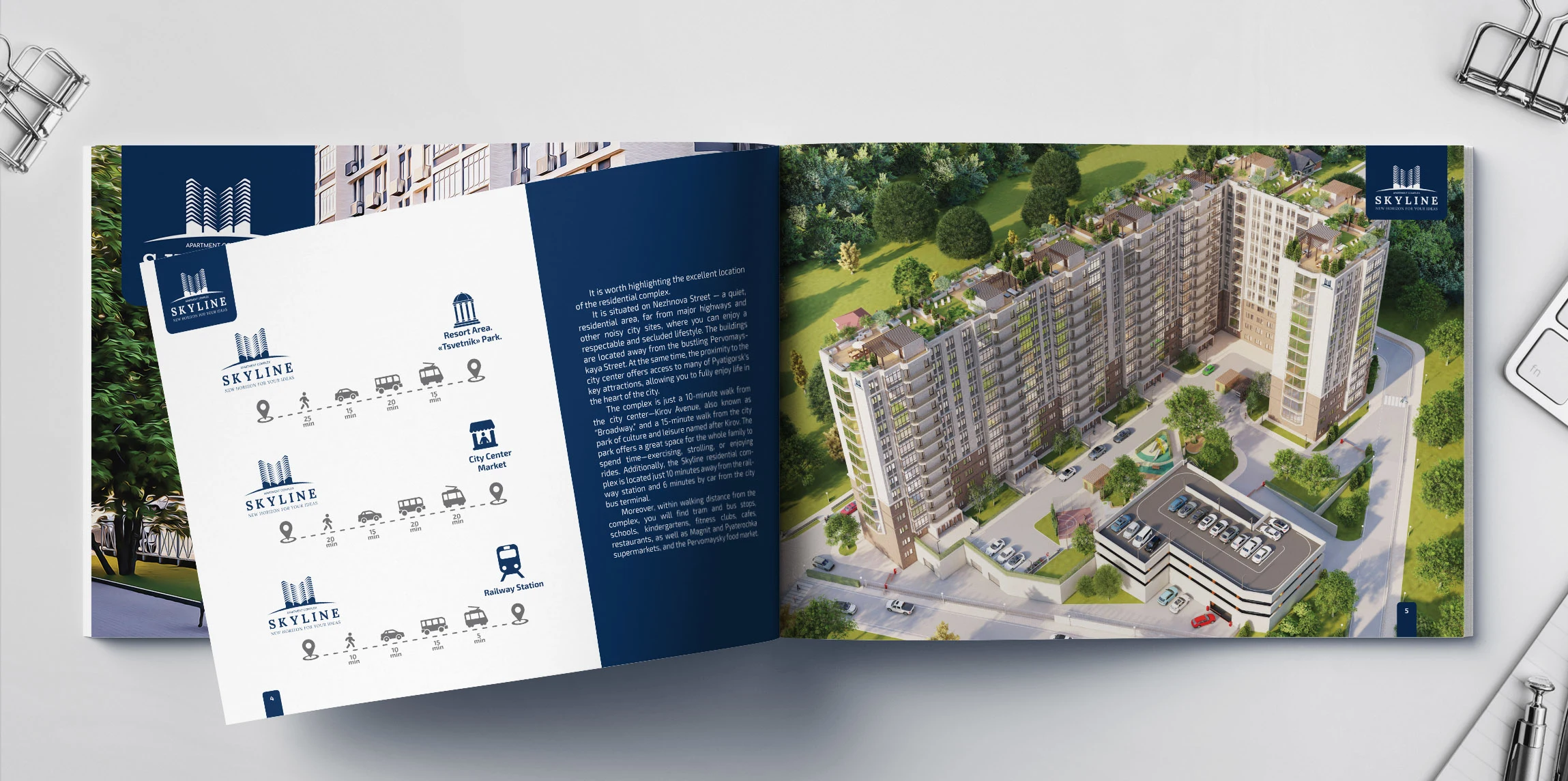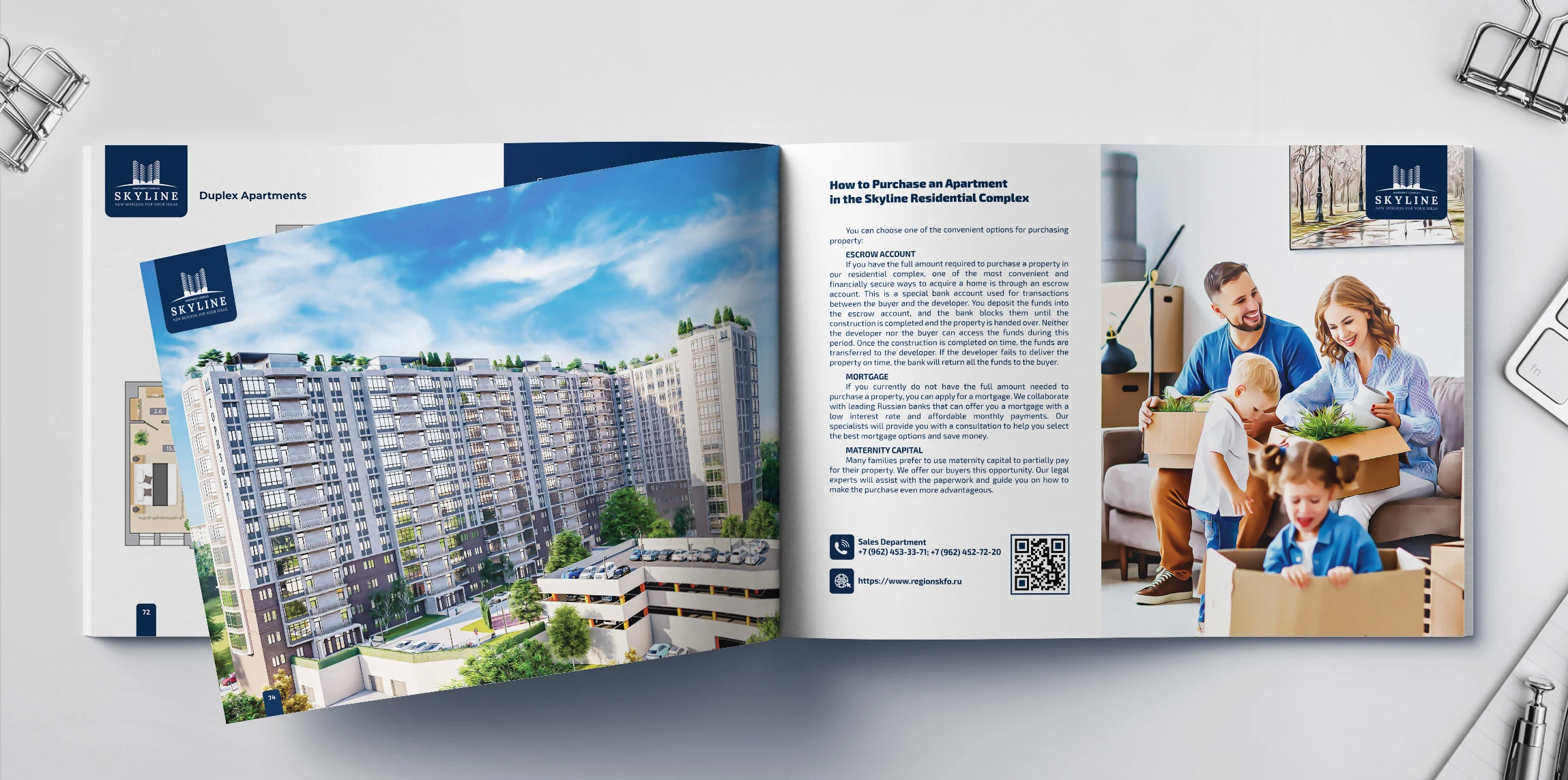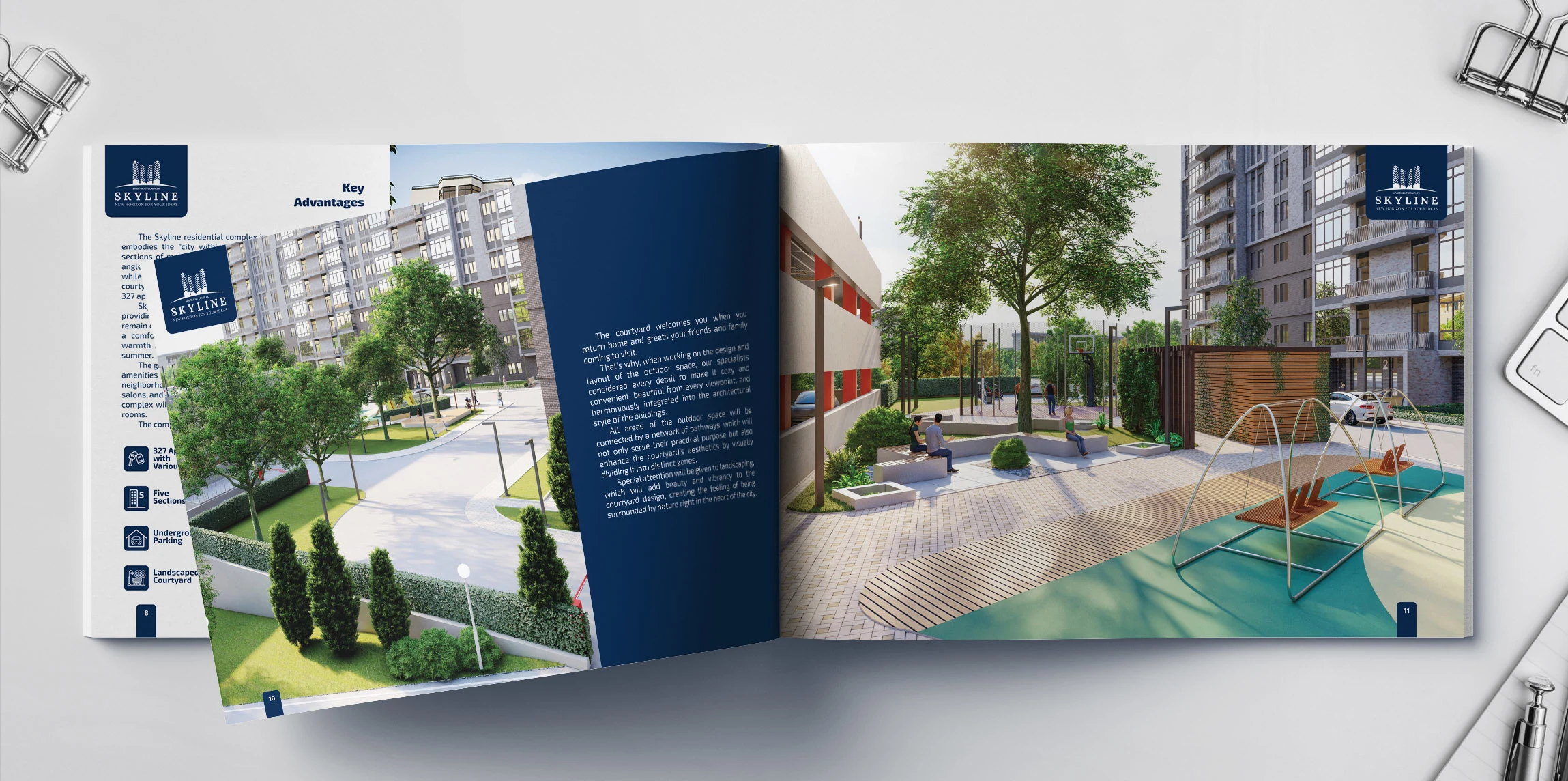 The client asked me to take the lead on the design. We started by creating a logo for the residential complex. Later, the client provided visualizations, but they were not very eye-catching. To enhance the presentation, I brought in a 3D designer who created striking visuals. I also enlisted a copywriter to craft compelling texts.