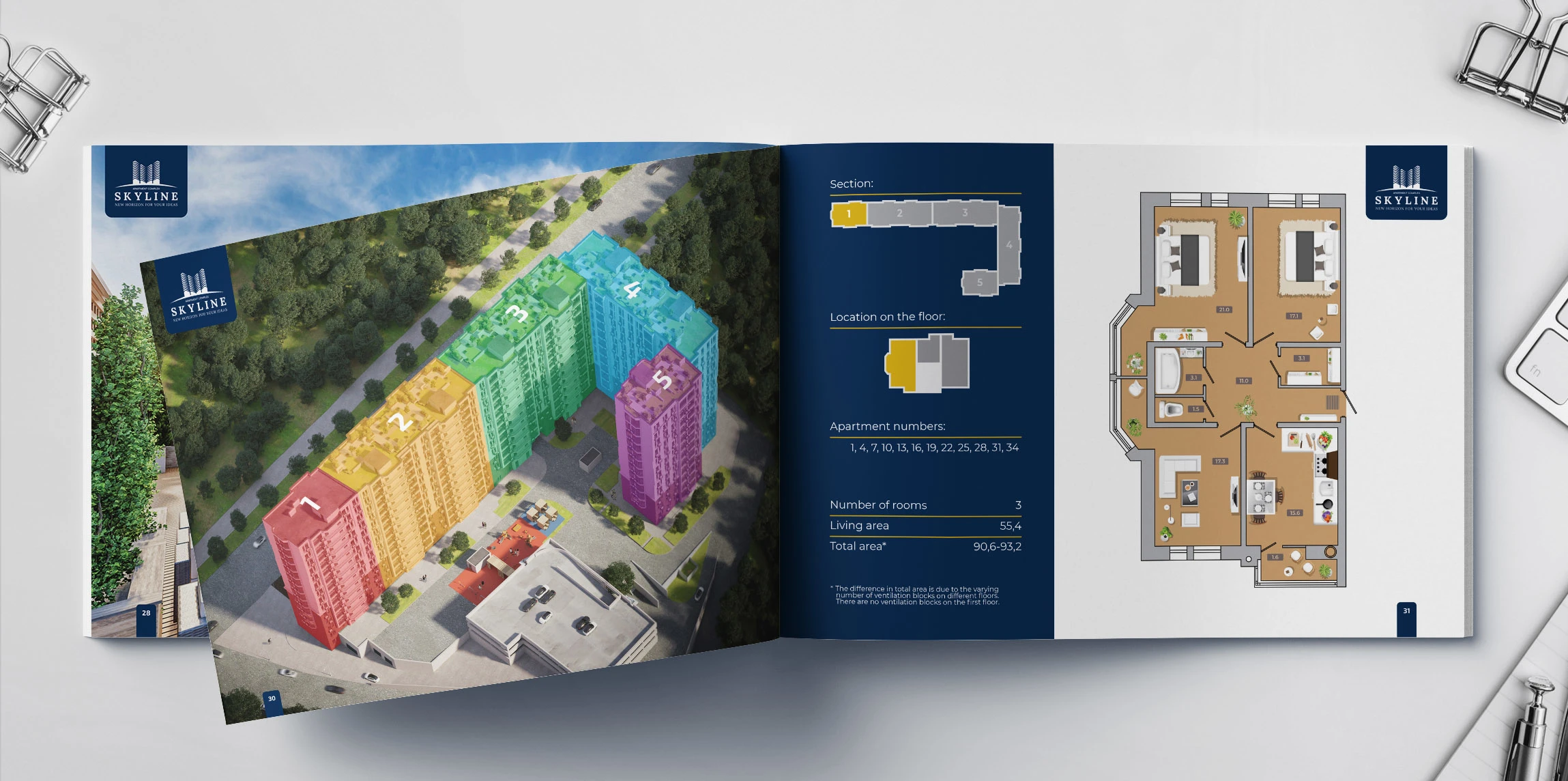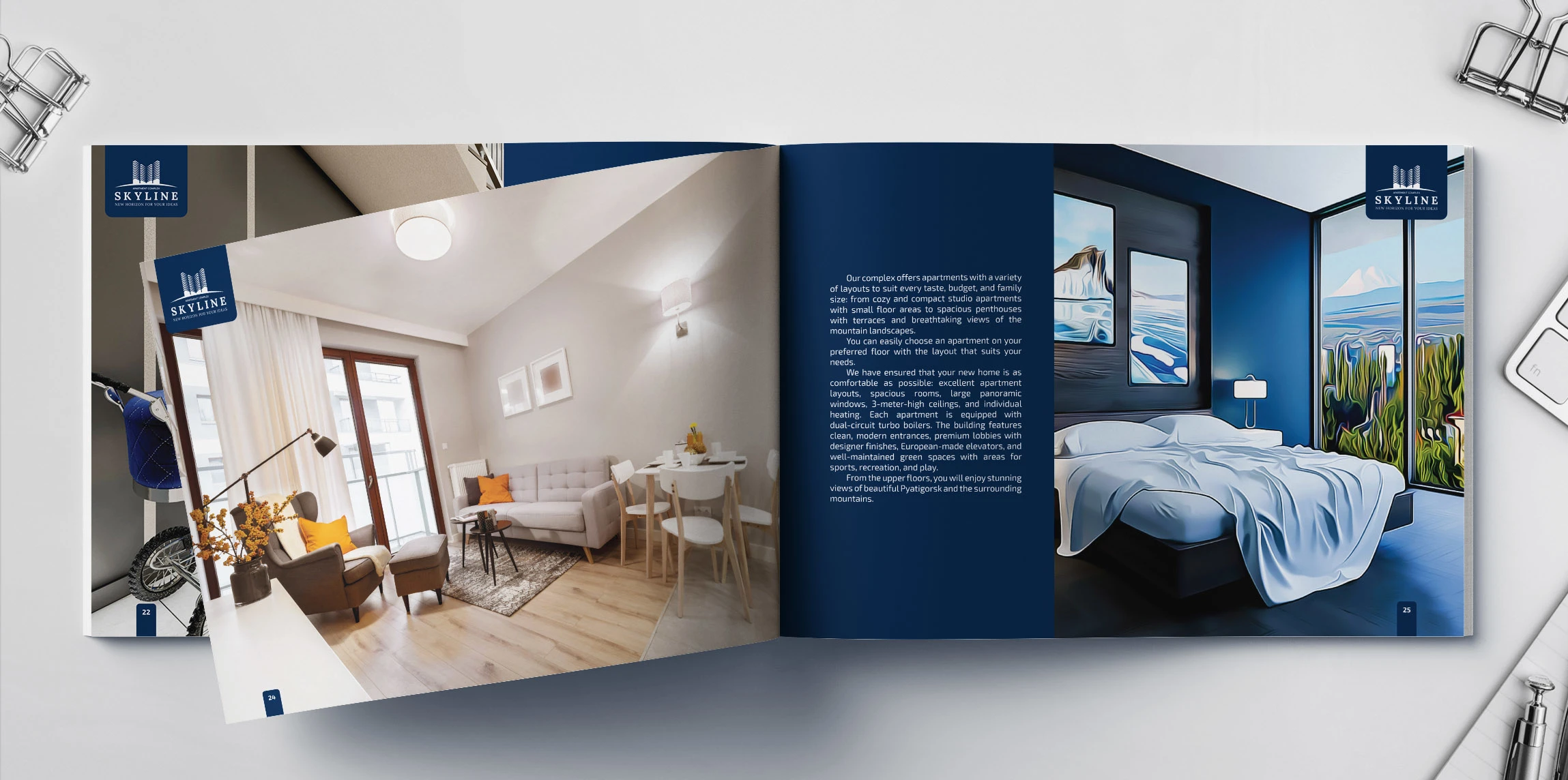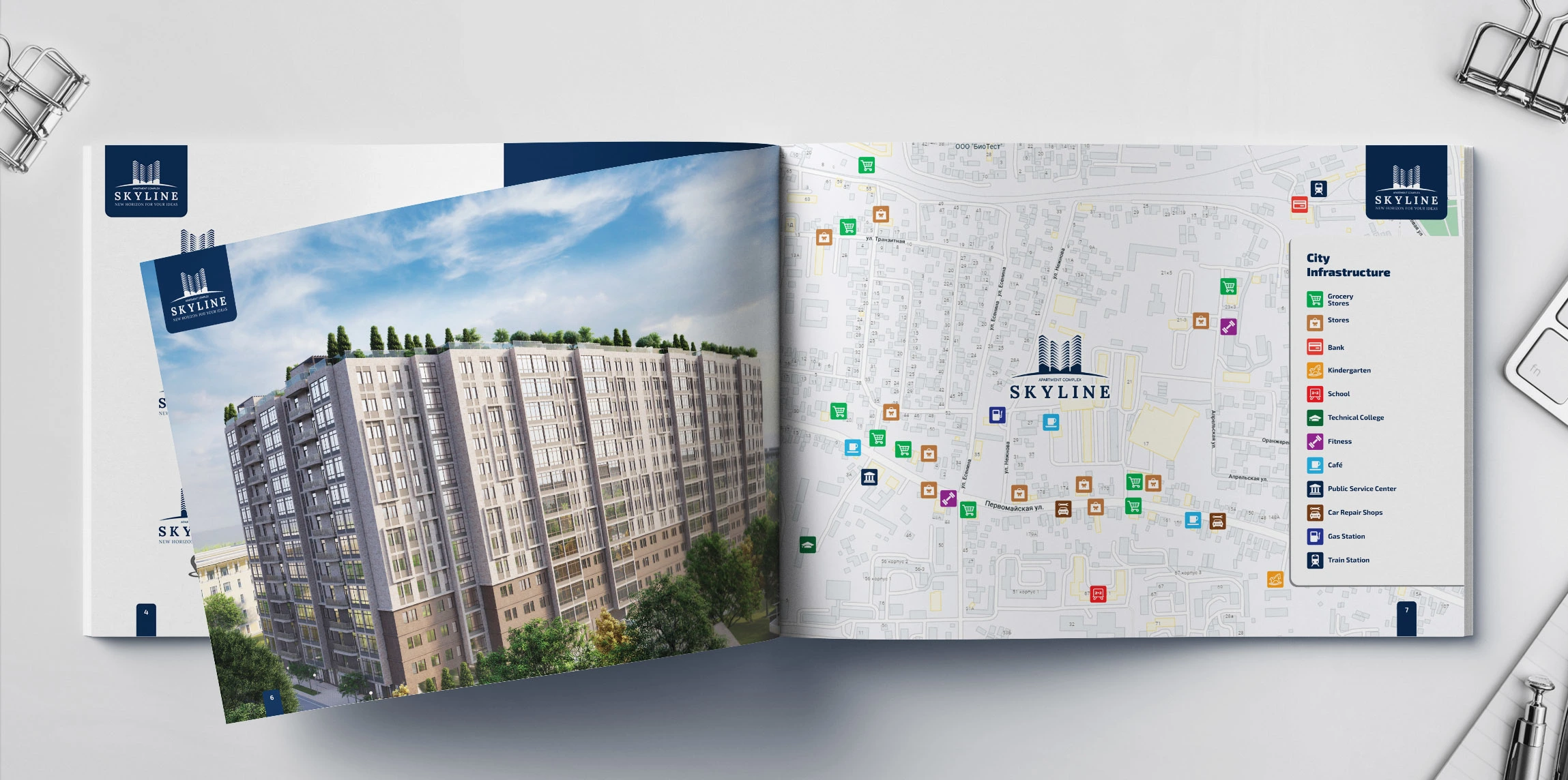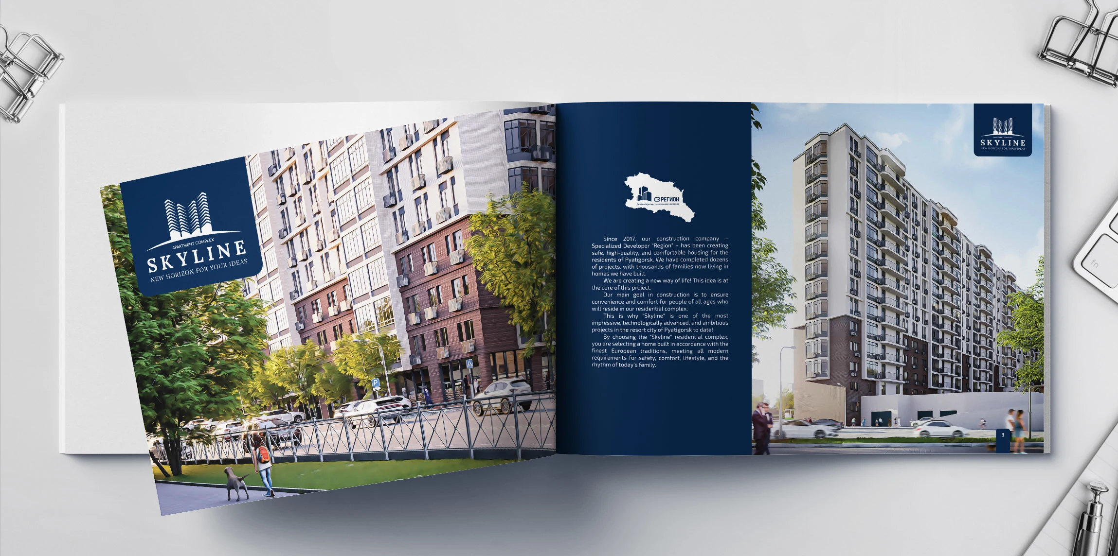 The client asked me to take the lead on the design. We started by creating a logo for the residential complex. Later, the client provided visualizations, but they were not very eye-catching. To enhance the presentation, I brought in a 3D designer who created striking visuals. I also enlisted a copywriter to craft compelling texts.