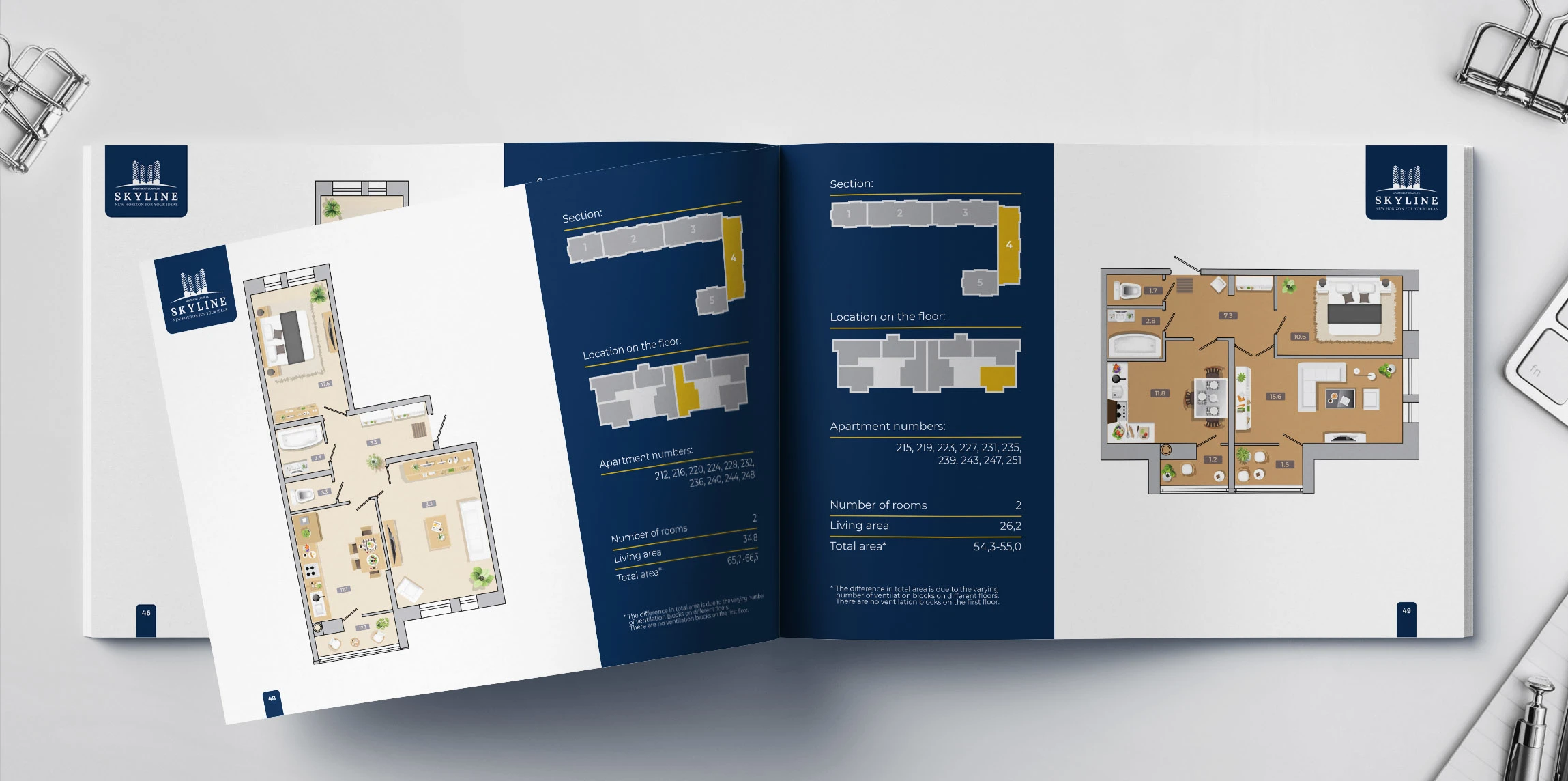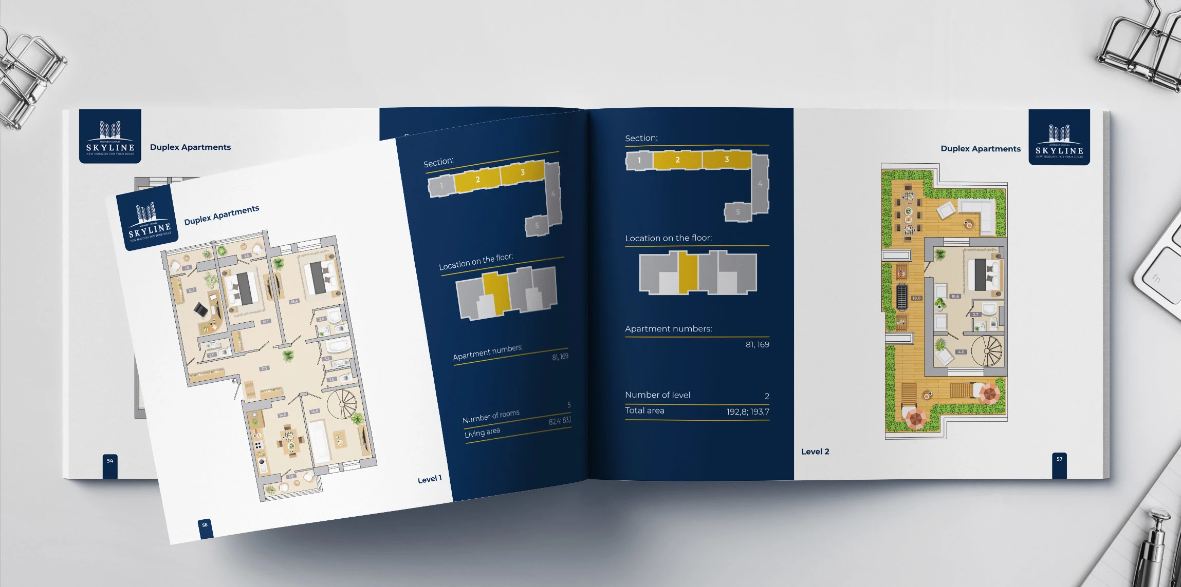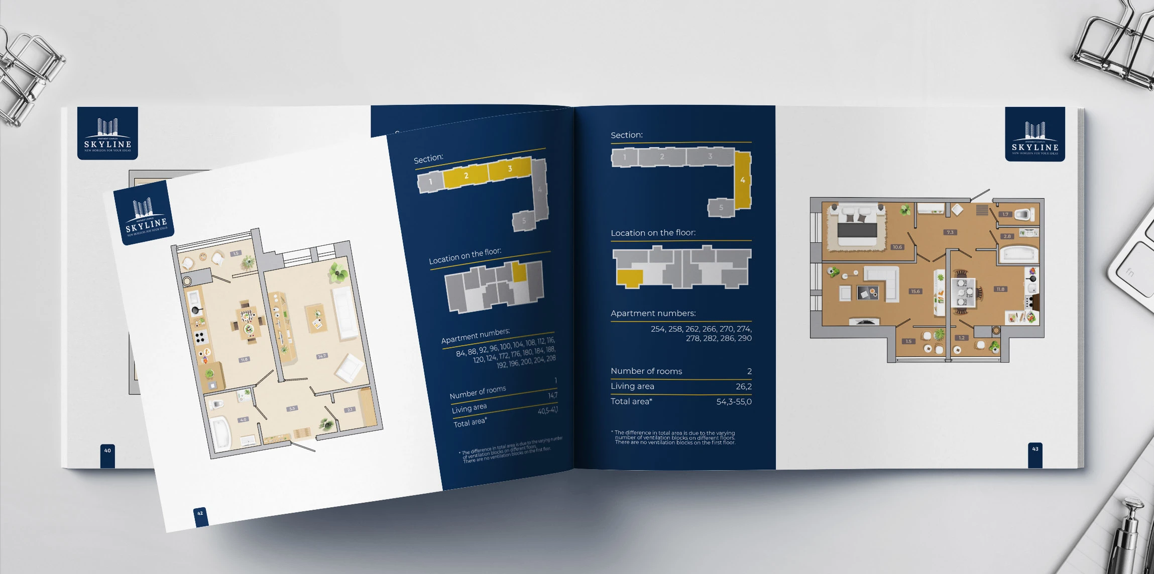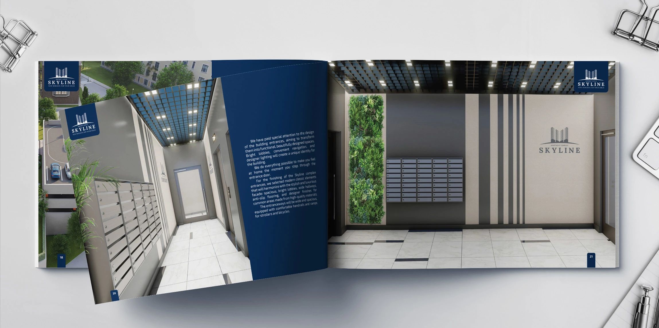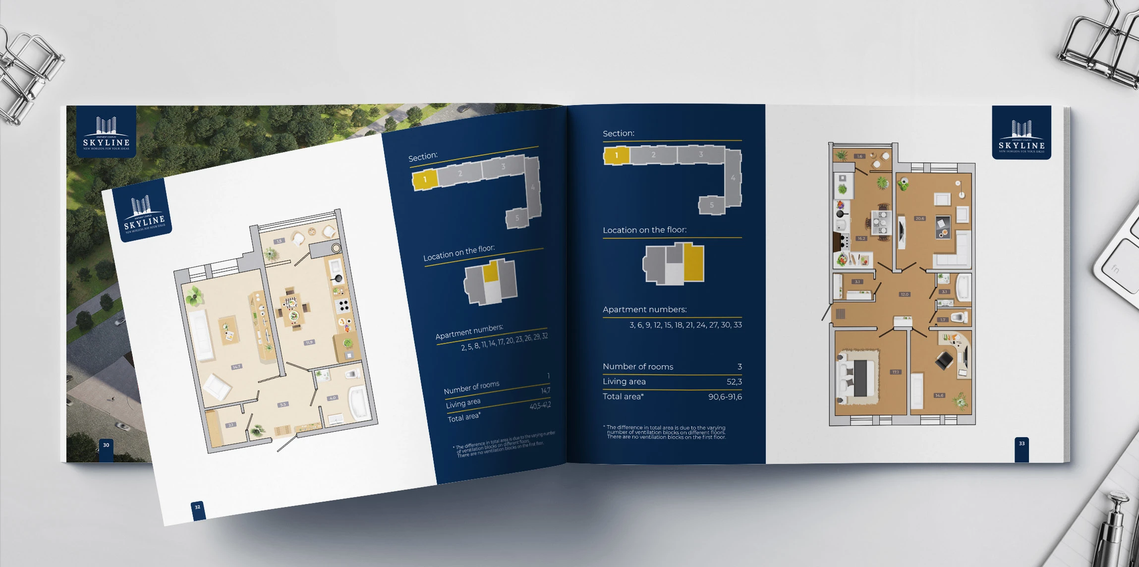 The client asked me to take the lead on the design. We started by creating a logo for the residential complex. Later, the client provided visualizations, but they were not very eye-catching. To enhance the presentation, I brought in a 3D designer who created striking visuals. I also enlisted a copywriter to craft compelling texts.