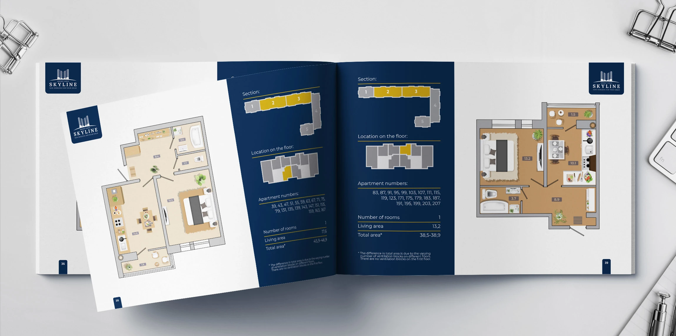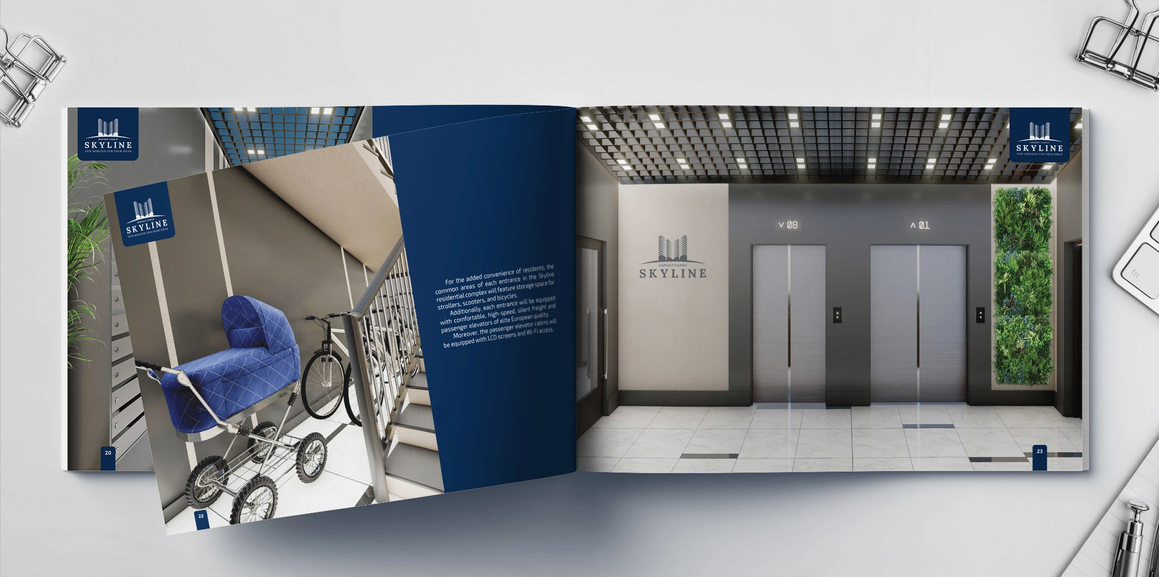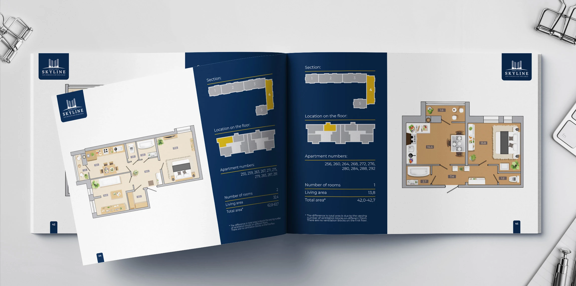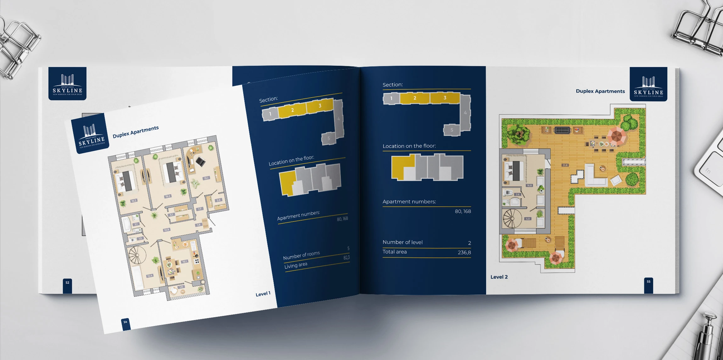 The client asked me to take the lead on the design. We started by creating a logo for the residential complex. Later, the client provided visualizations, but they were not very eye-catching. To enhance the presentation, I brought in a 3D designer who created striking visuals. I also enlisted a copywriter to craft compelling texts.