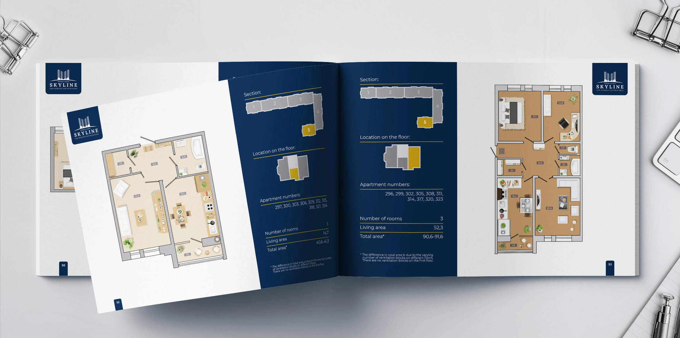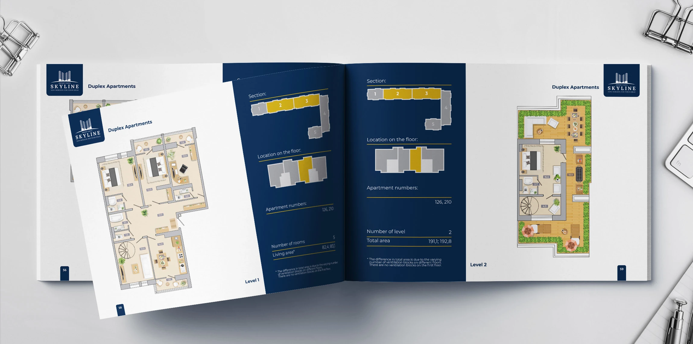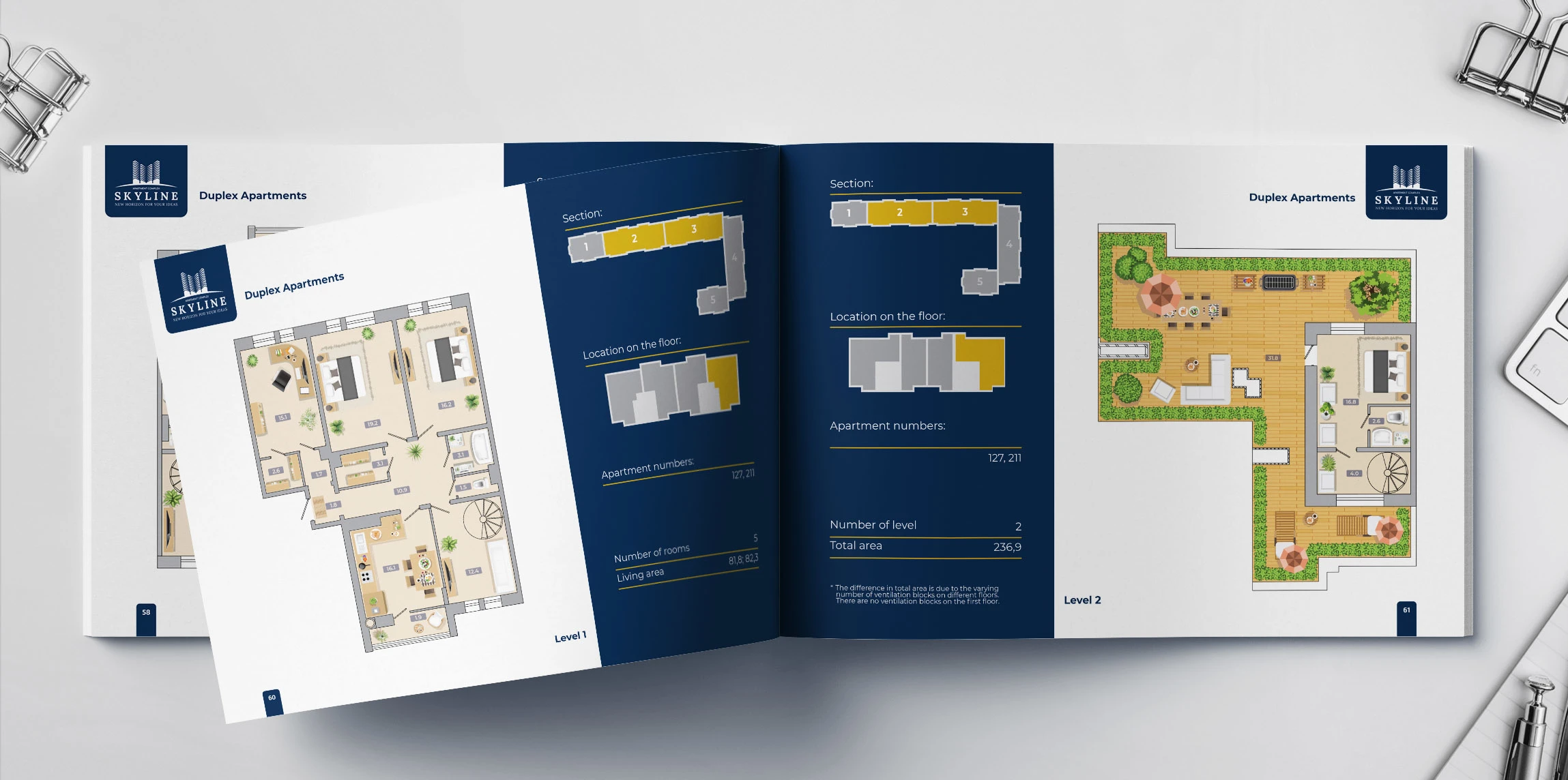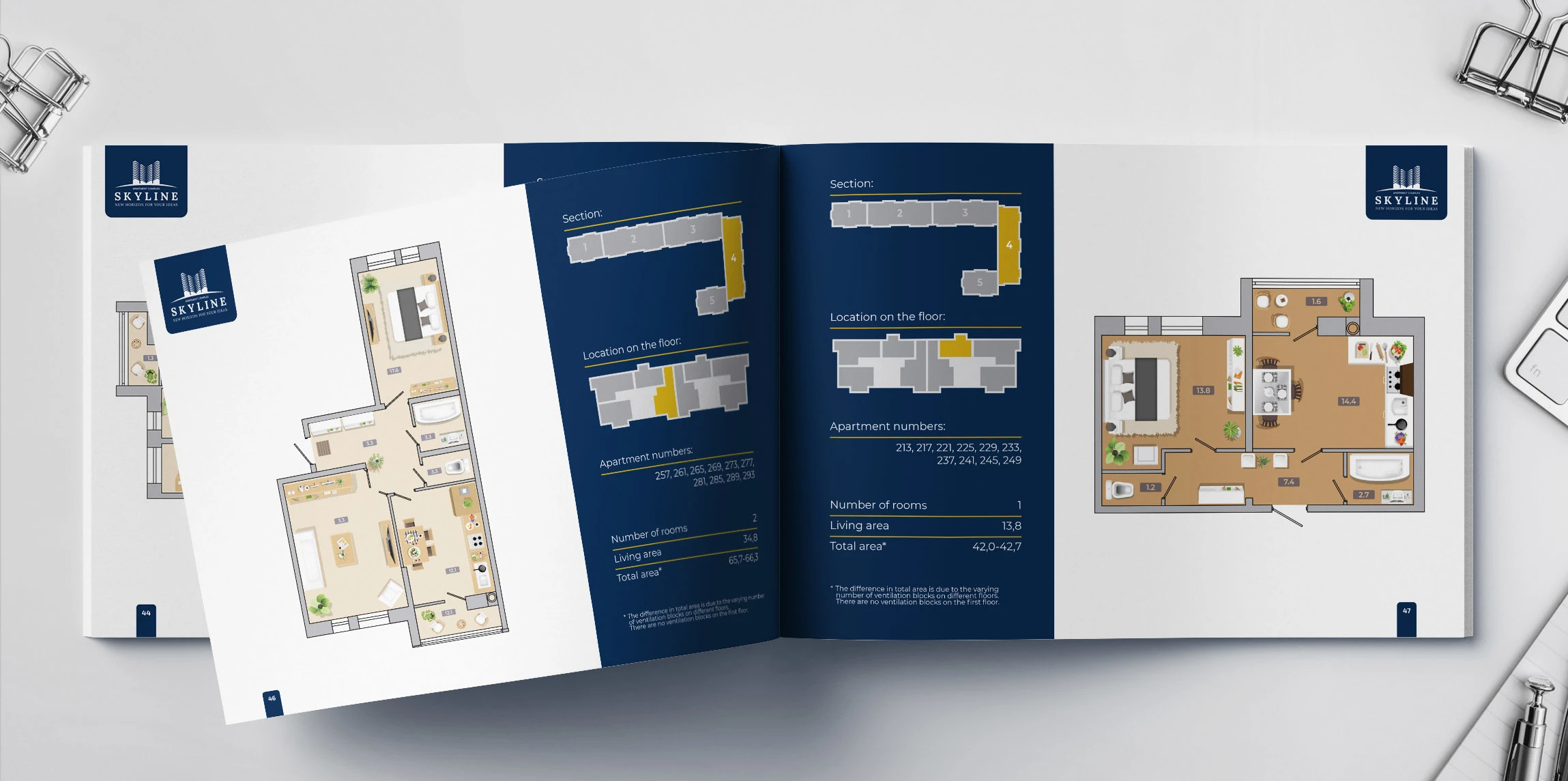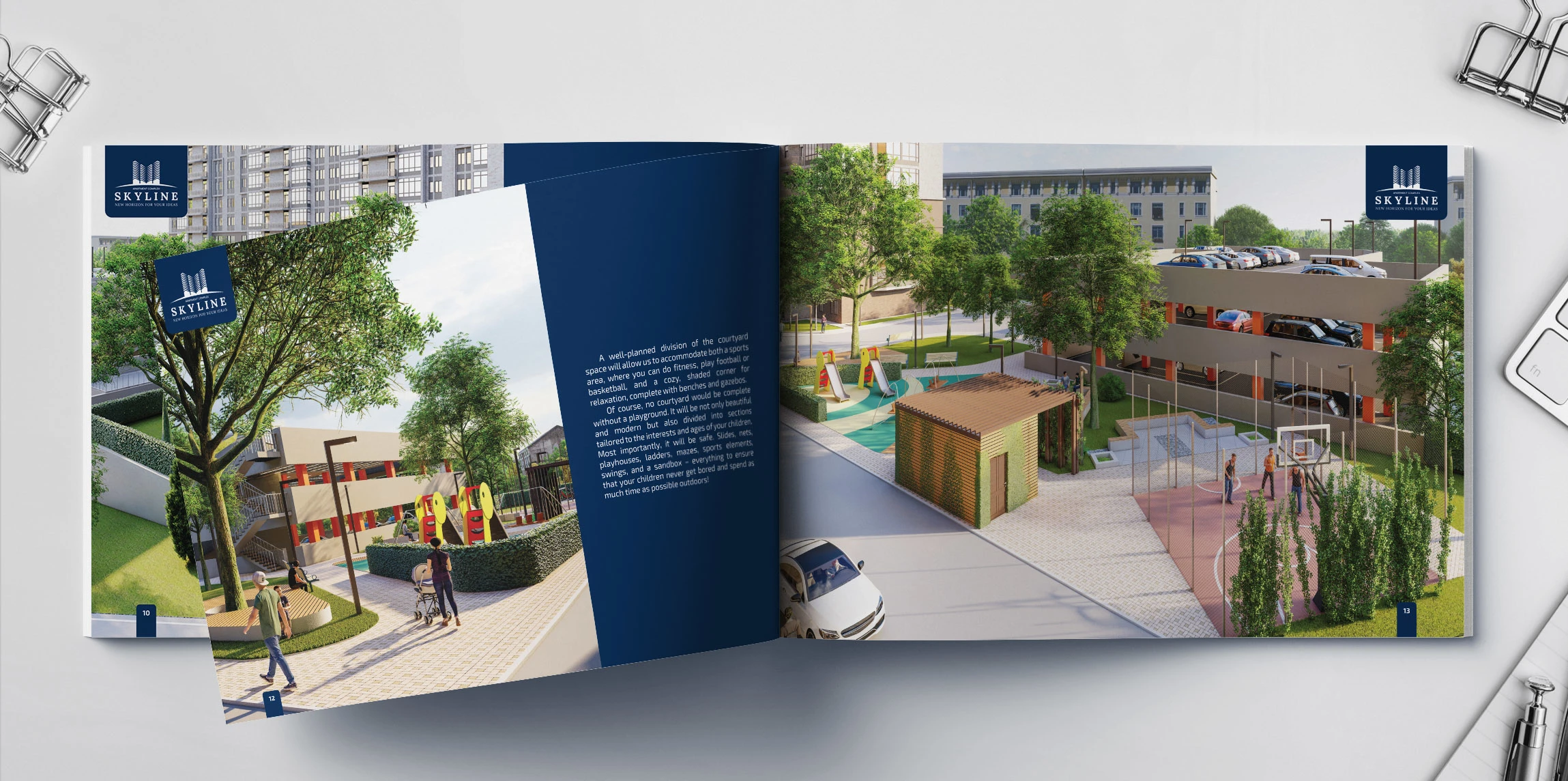 The client asked me to take the lead on the design. We started by creating a logo for the residential complex. Later, the client provided visualizations, but they were not very eye-catching. To enhance the presentation, I brought in a 3D designer who created striking visuals. I also enlisted a copywriter to craft compelling texts.