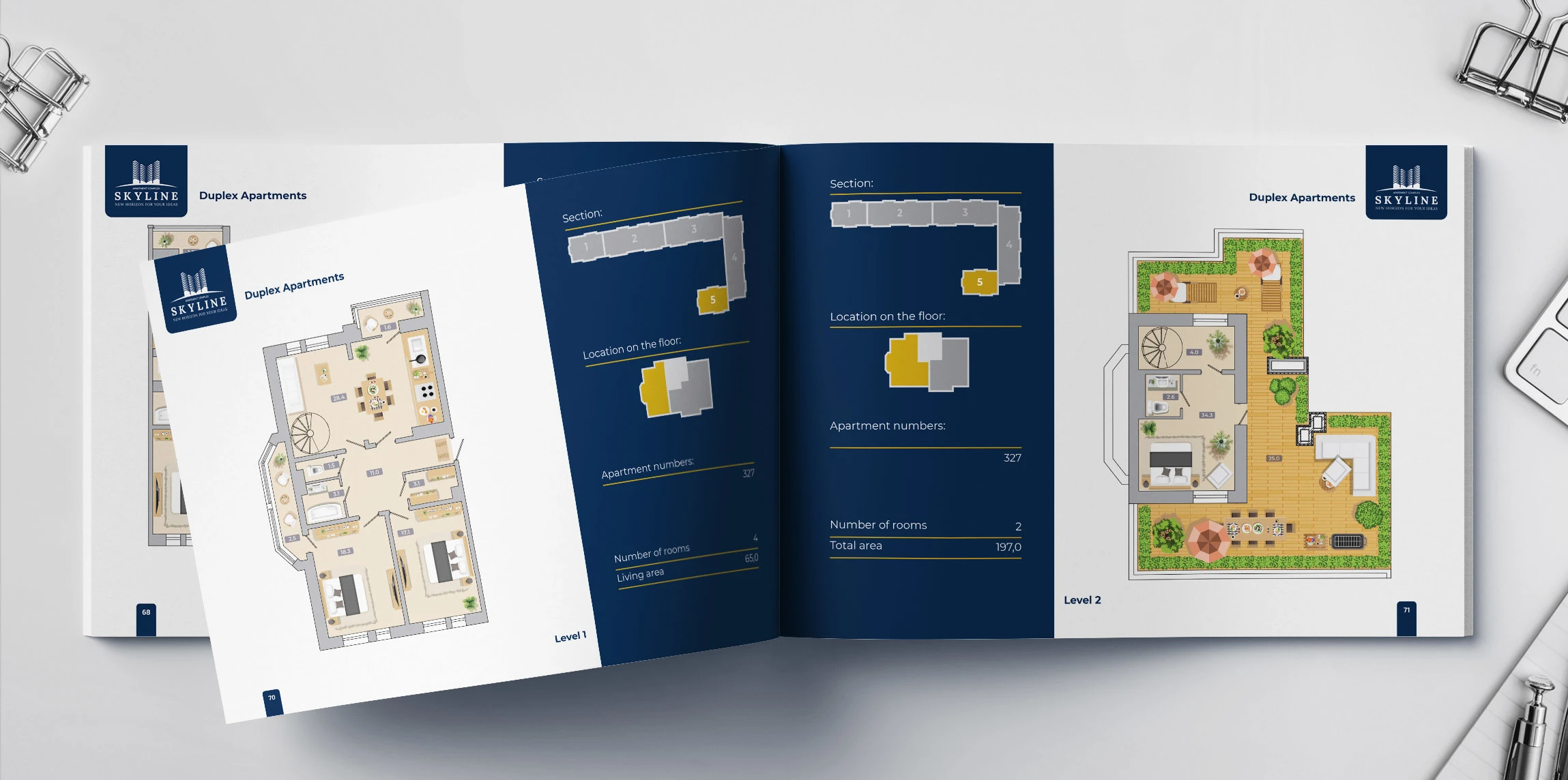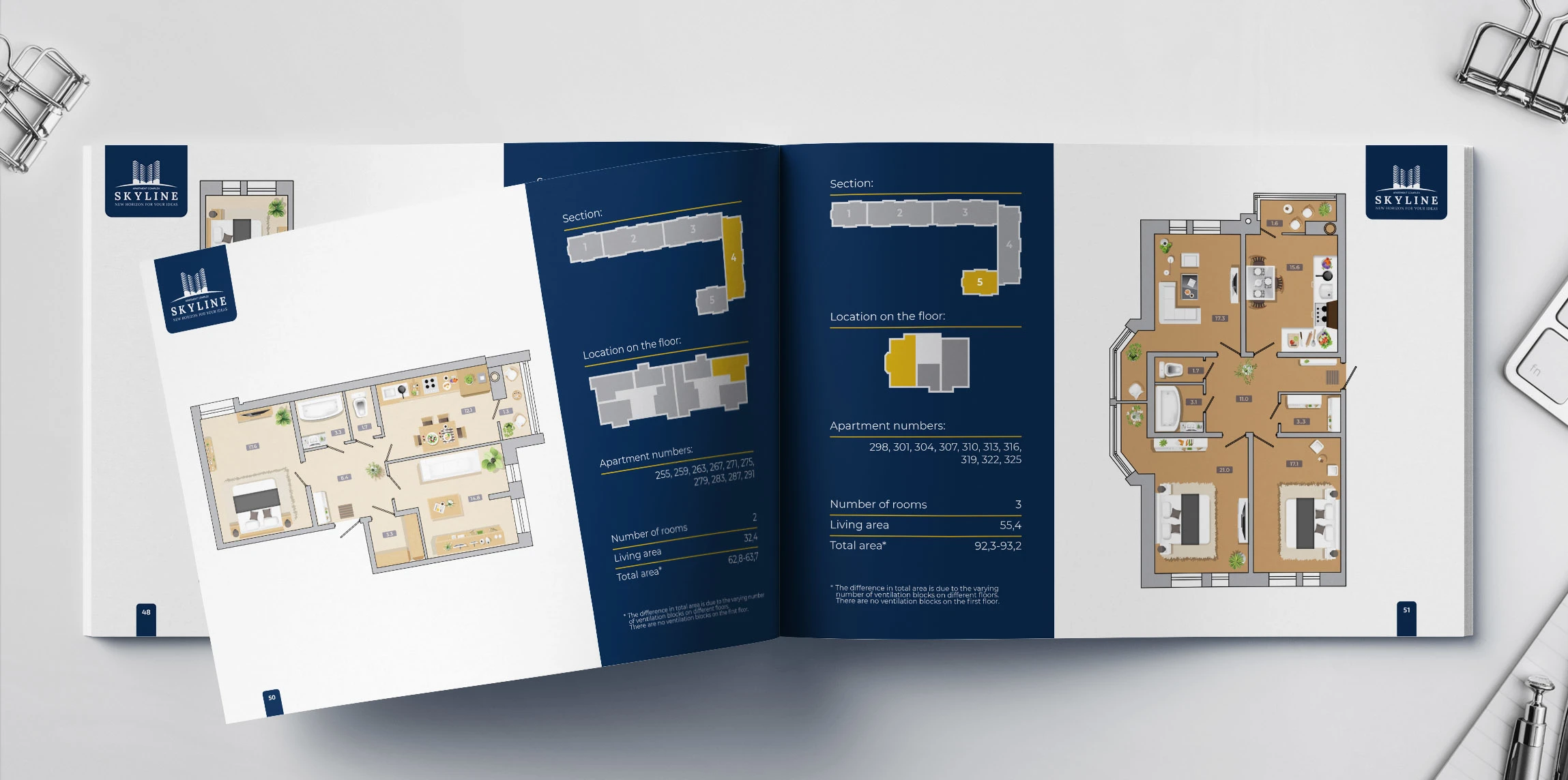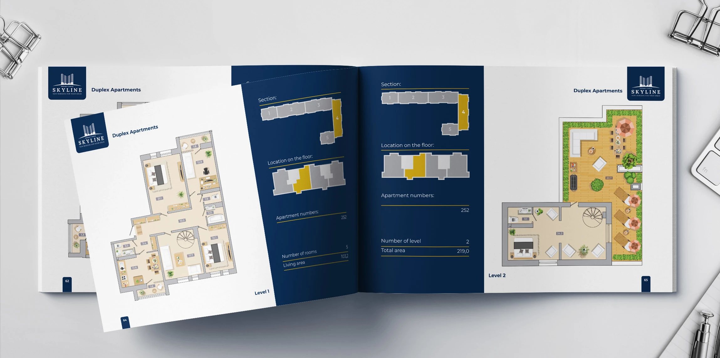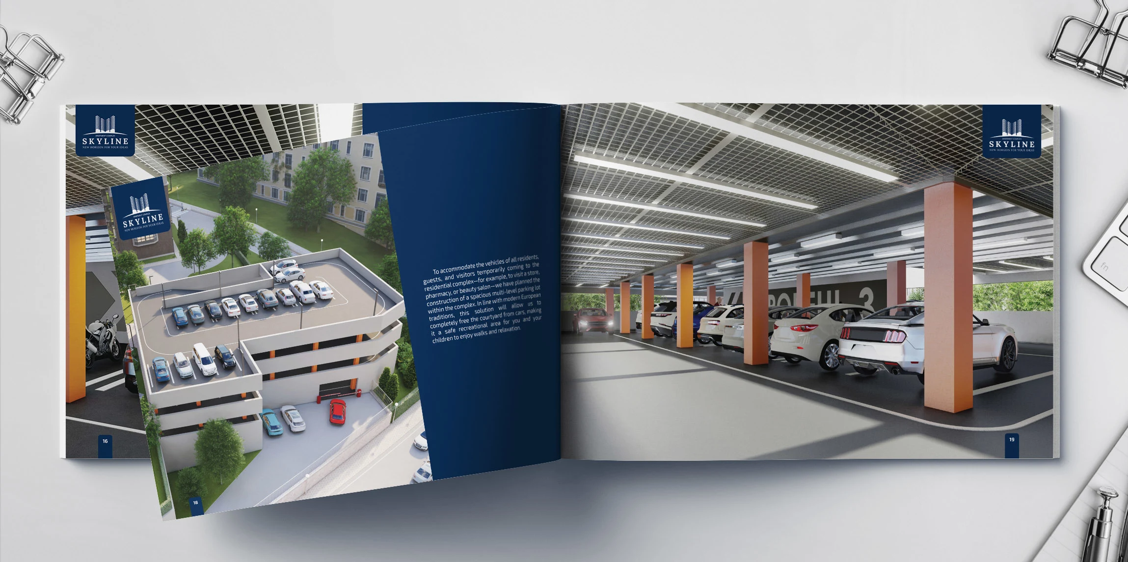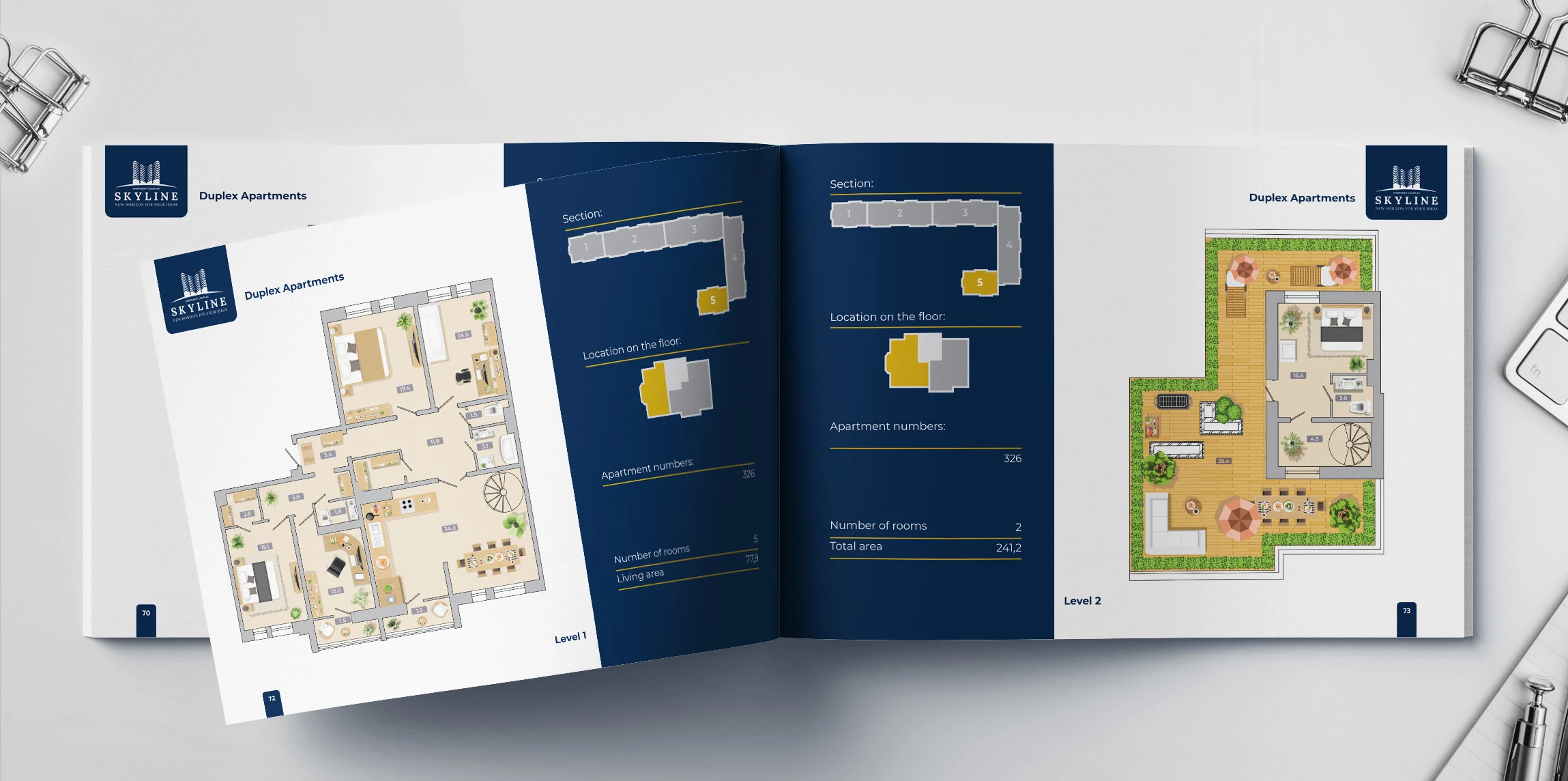 The client asked me to take the lead on the design. We started by creating a logo for the residential complex. Later, the client provided visualizations, but they were not very eye-catching. To enhance the presentation, I brought in a 3D designer who created striking visuals. I also enlisted a copywriter to craft compelling texts.