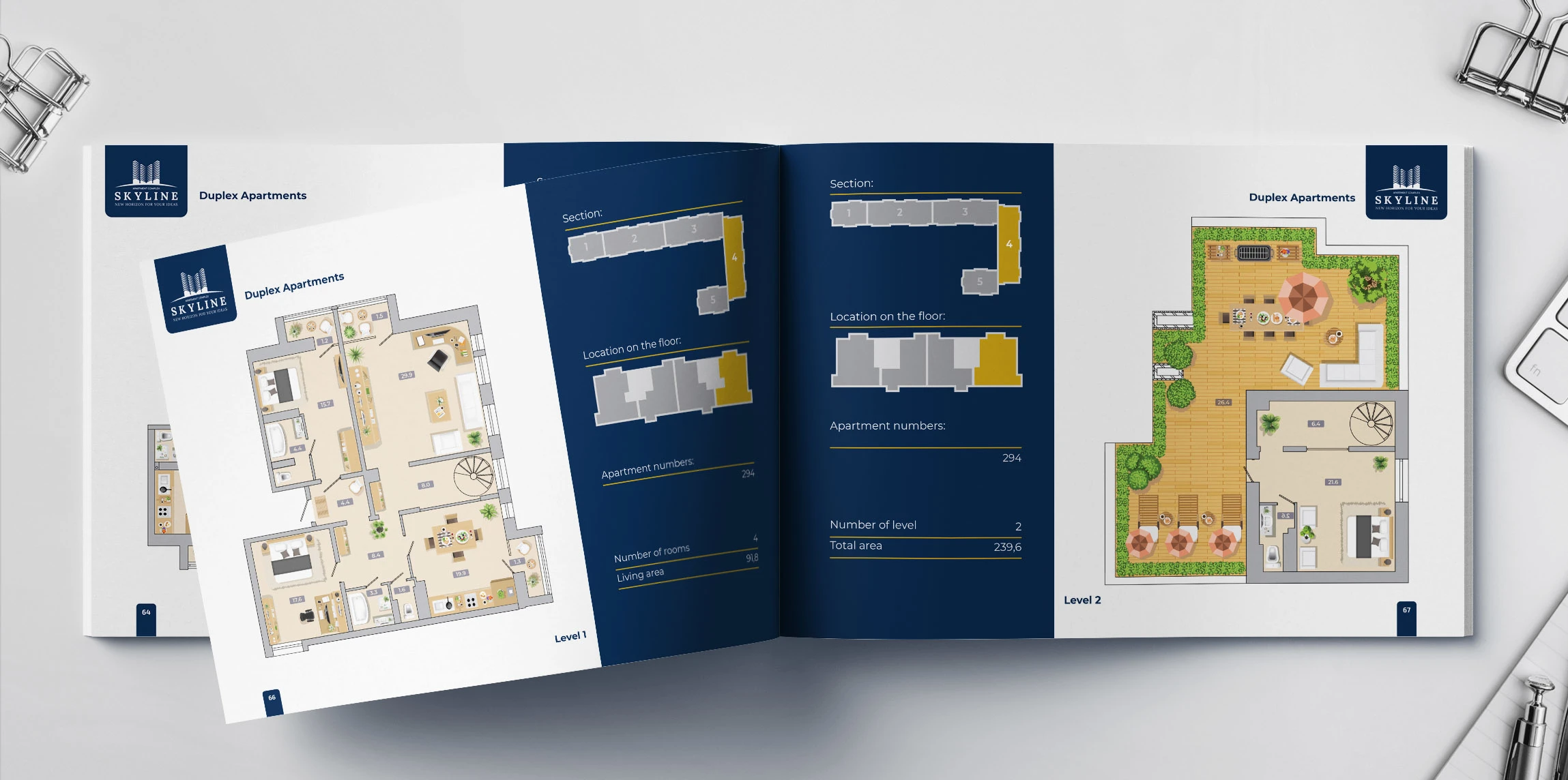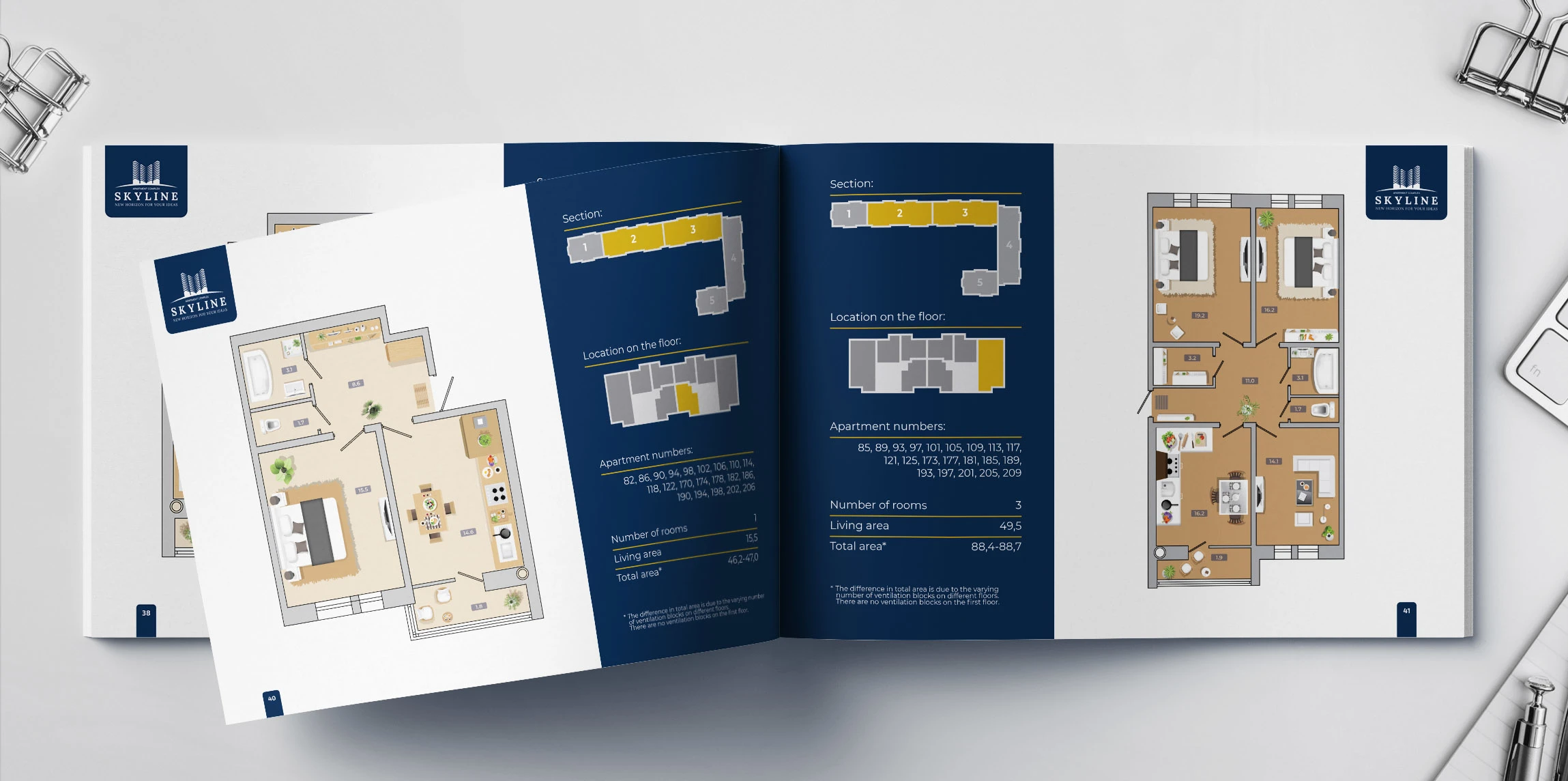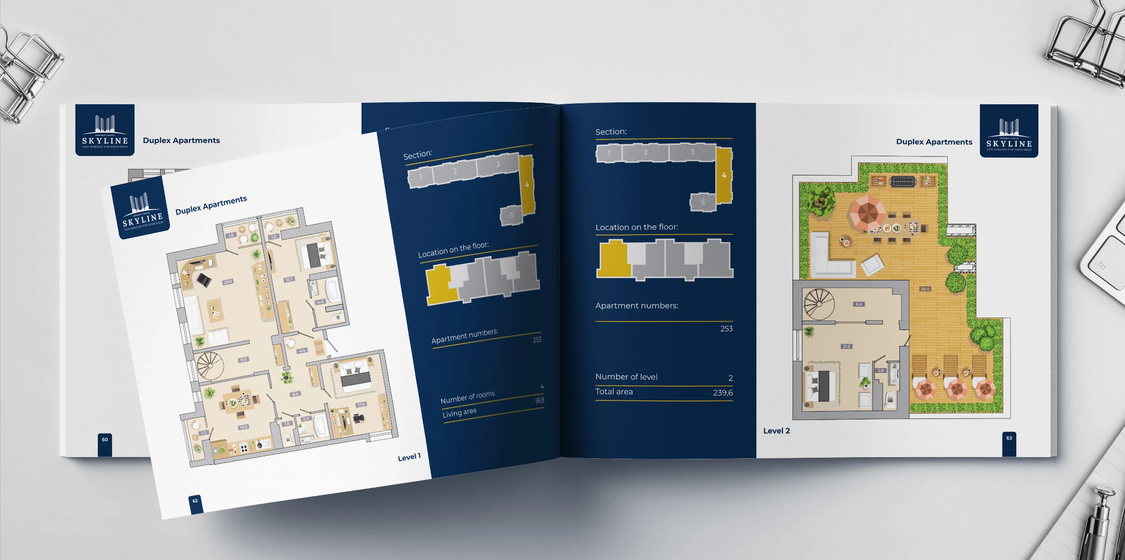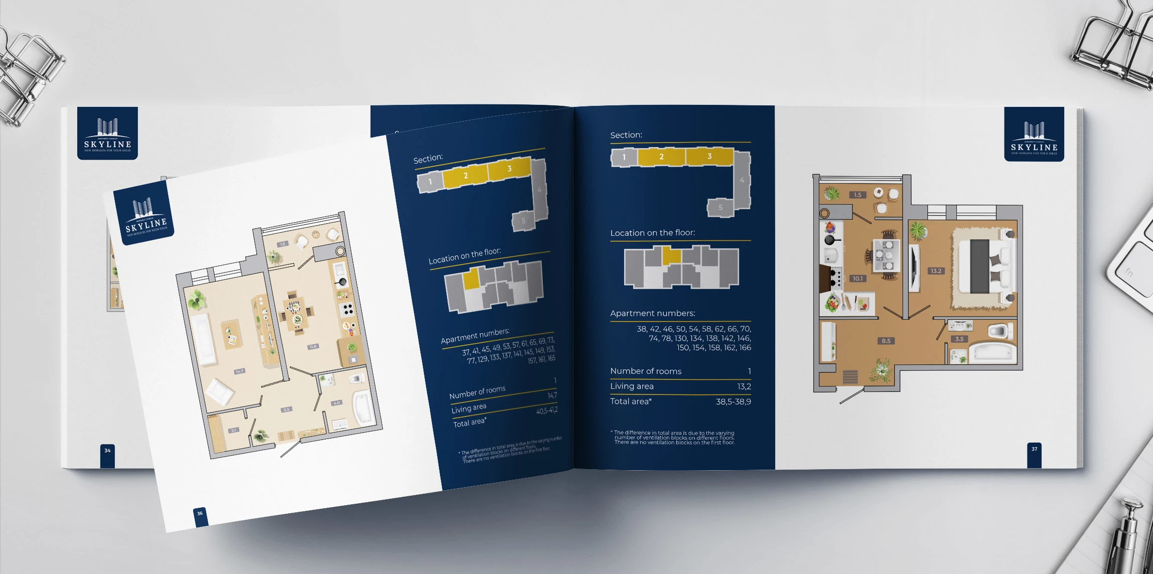 The client asked me to take the lead on the design. We started by creating a logo for the residential complex. Later, the client provided visualizations, but they were not very eye-catching. To enhance the presentation, I brought in a 3D designer who created striking visuals. I also enlisted a copywriter to craft compelling texts.