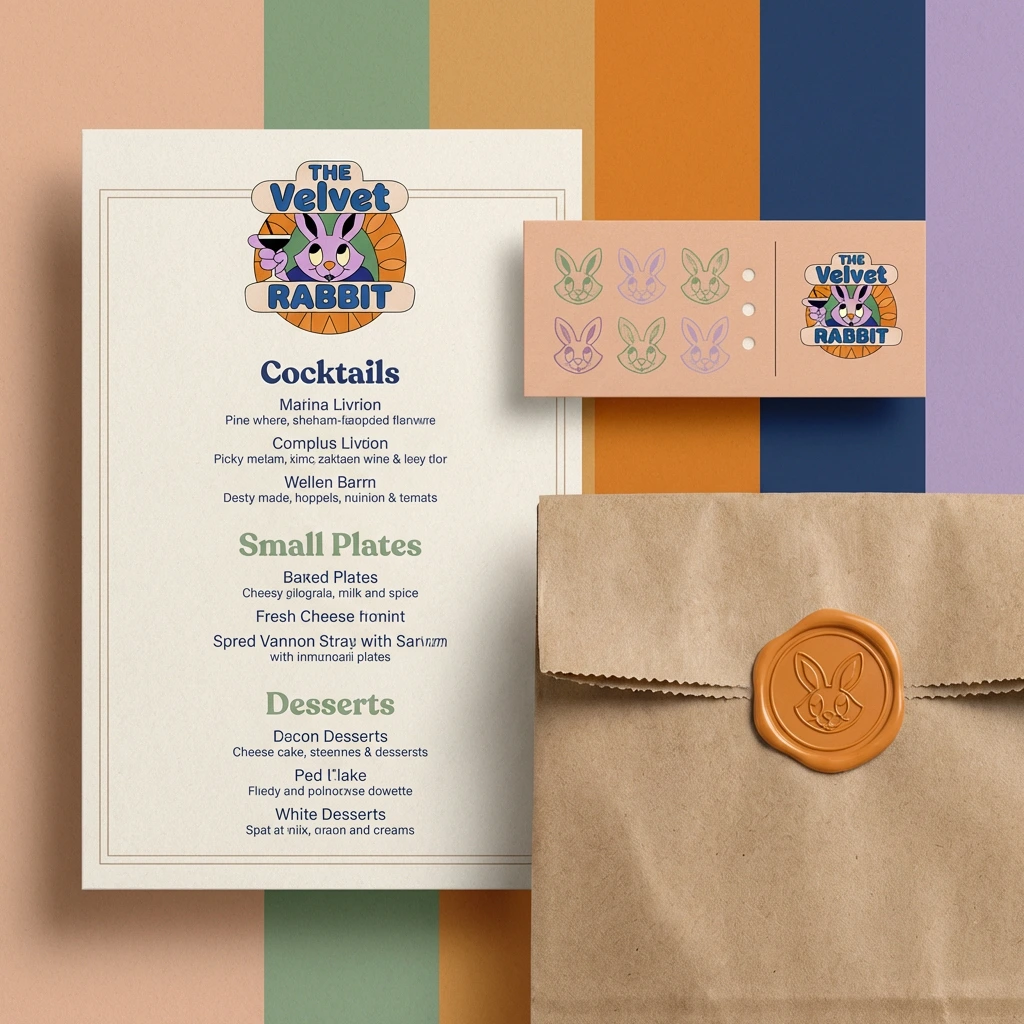 #F2C9A8 — primary warmth, backgrounds, paper stock#E8853D — energy, accent, stained glass#7FA882 — secondary calm, contrast#1E2D5A — authority, type, depth#C9A8D4 — the rabbit, the unexpected softness#FAF3E8 — negative space, breathing room#C9A84C — premium touch points only