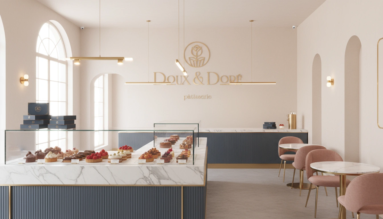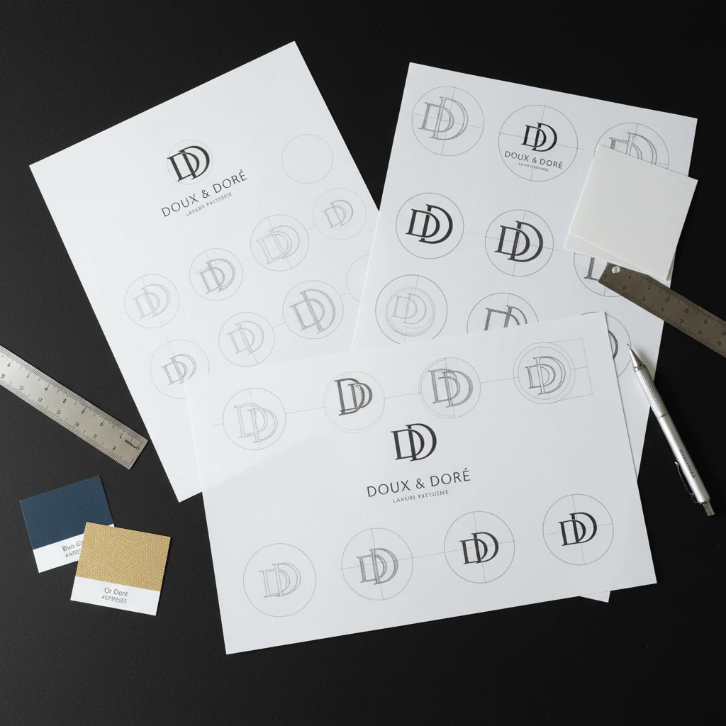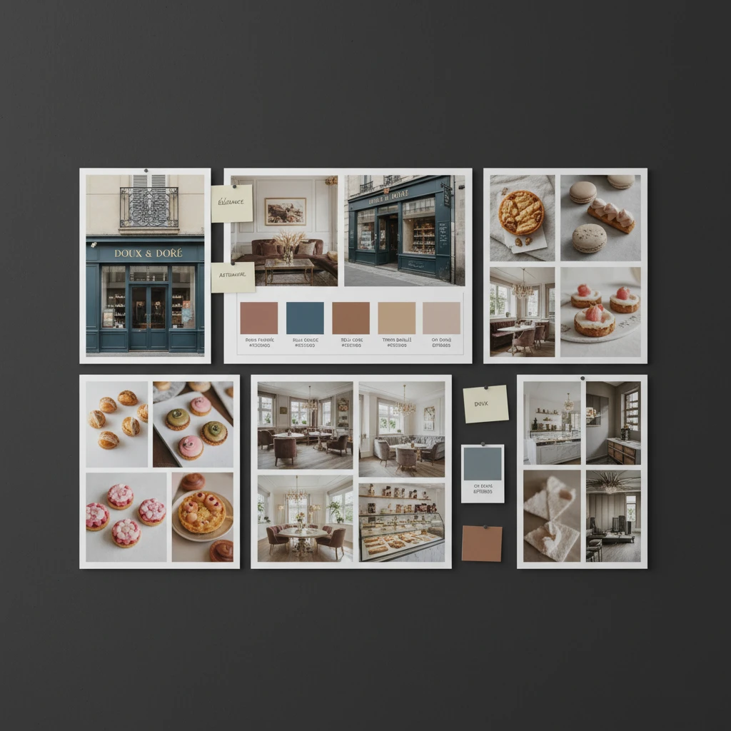 I started with strategic discovery, researching French patisseries, luxury packaging, and competitor brands to define Doux & Doré's core attributes and position. Building moodboards from French interiors, patisseries, and high-end packaging, I explored how to visually balance refinement with approachability.
