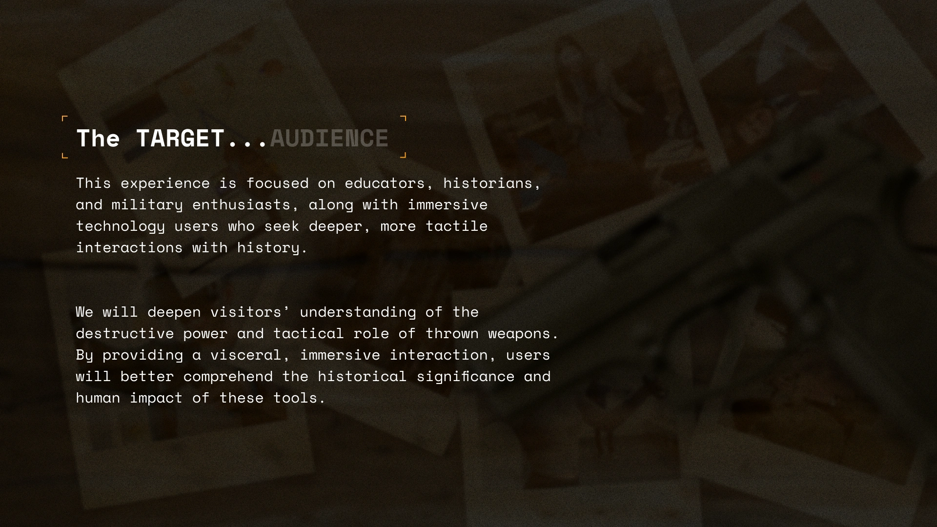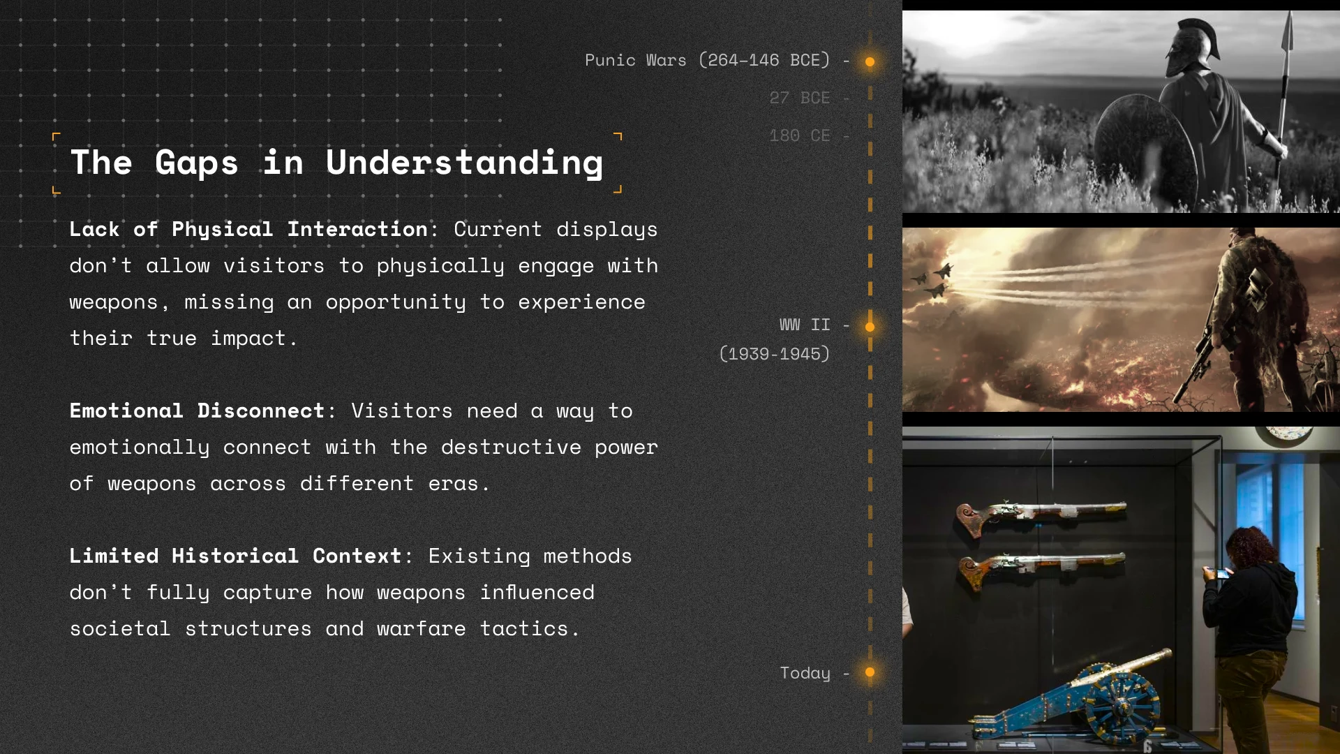 I fused gritty textures and imagery to echo the tension and precision of warfare. The design strikes a balance between historical storytelling and modern impact, turning each slide into a mission: to inform, immerse, and provoke thought. Every element is loaded with intent—like a weapon, it's built for effect.