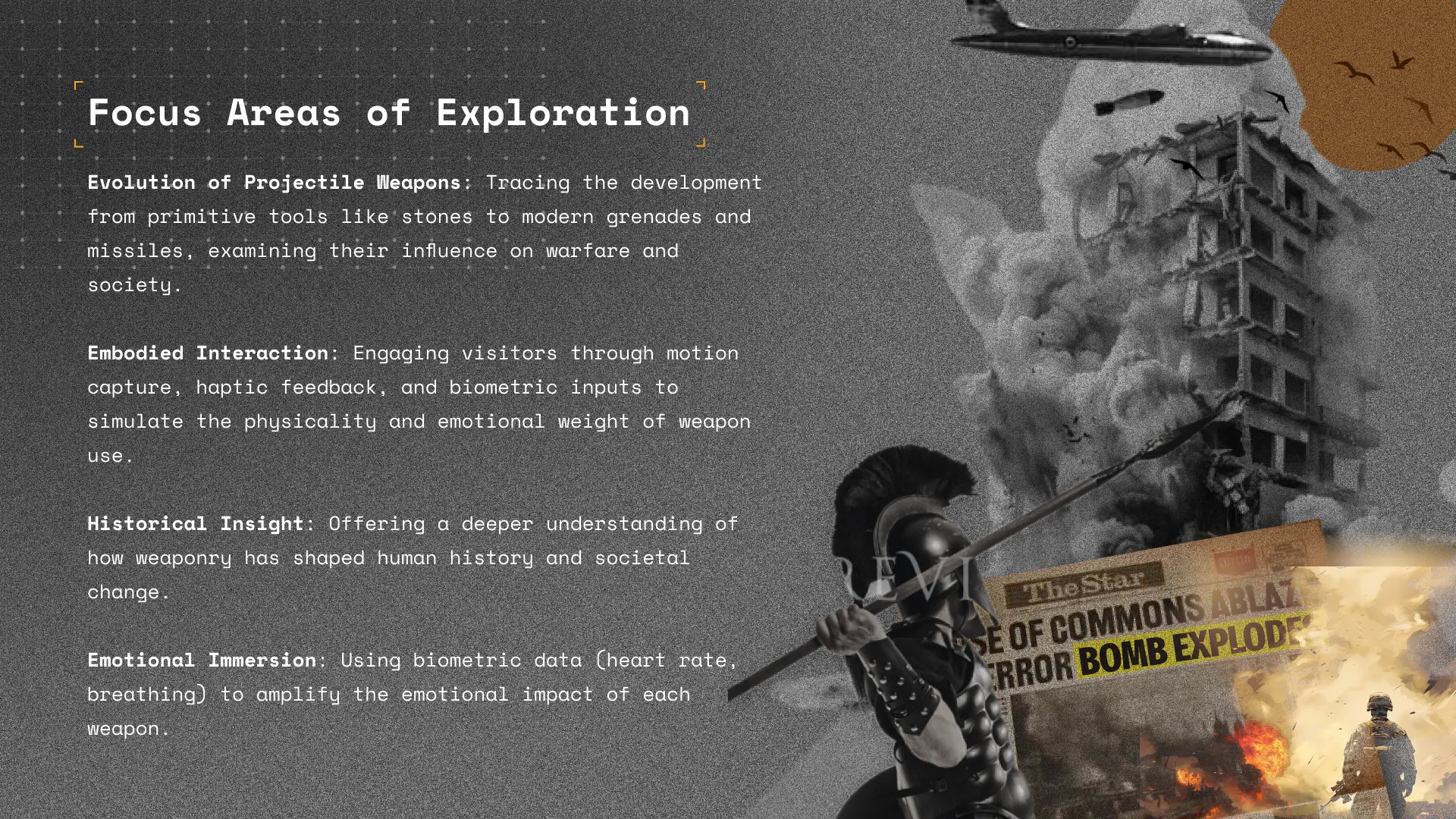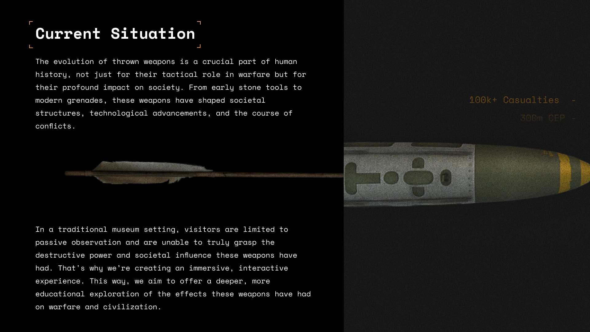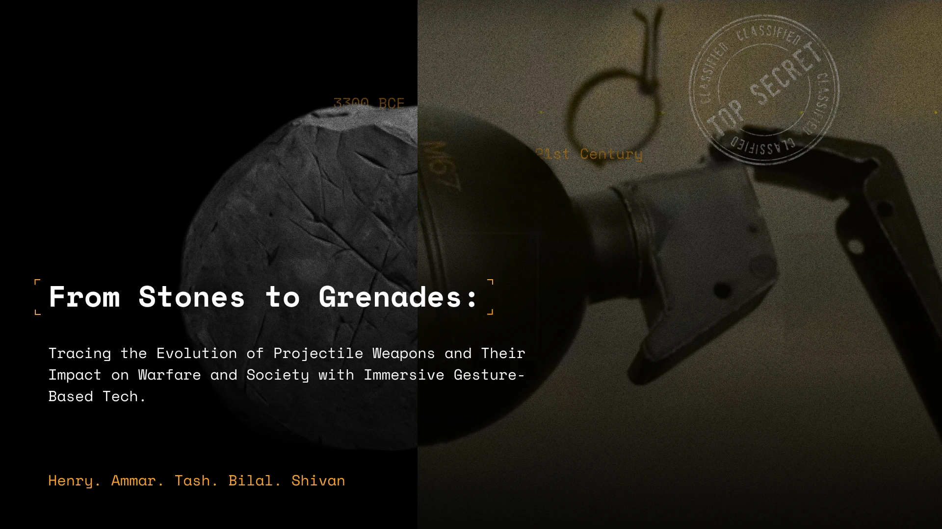 In this Presentation slide, I explore the evolution of thrown weapons—from primal stones to modern grenades—through a bold, militaristic visual language.
