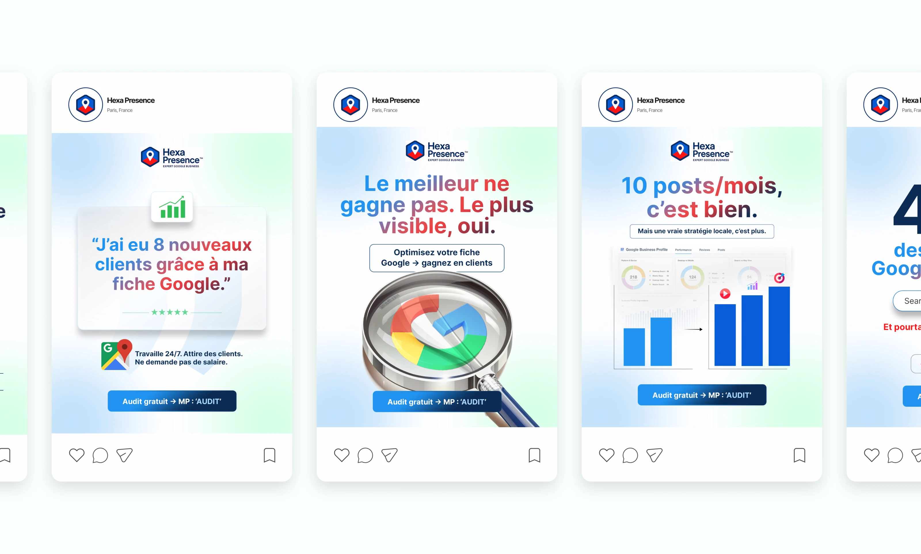 Social media designs for Google Business Profile optimization service. Educational content with data-driven messaging and CTAs to generate audit sign-ups.