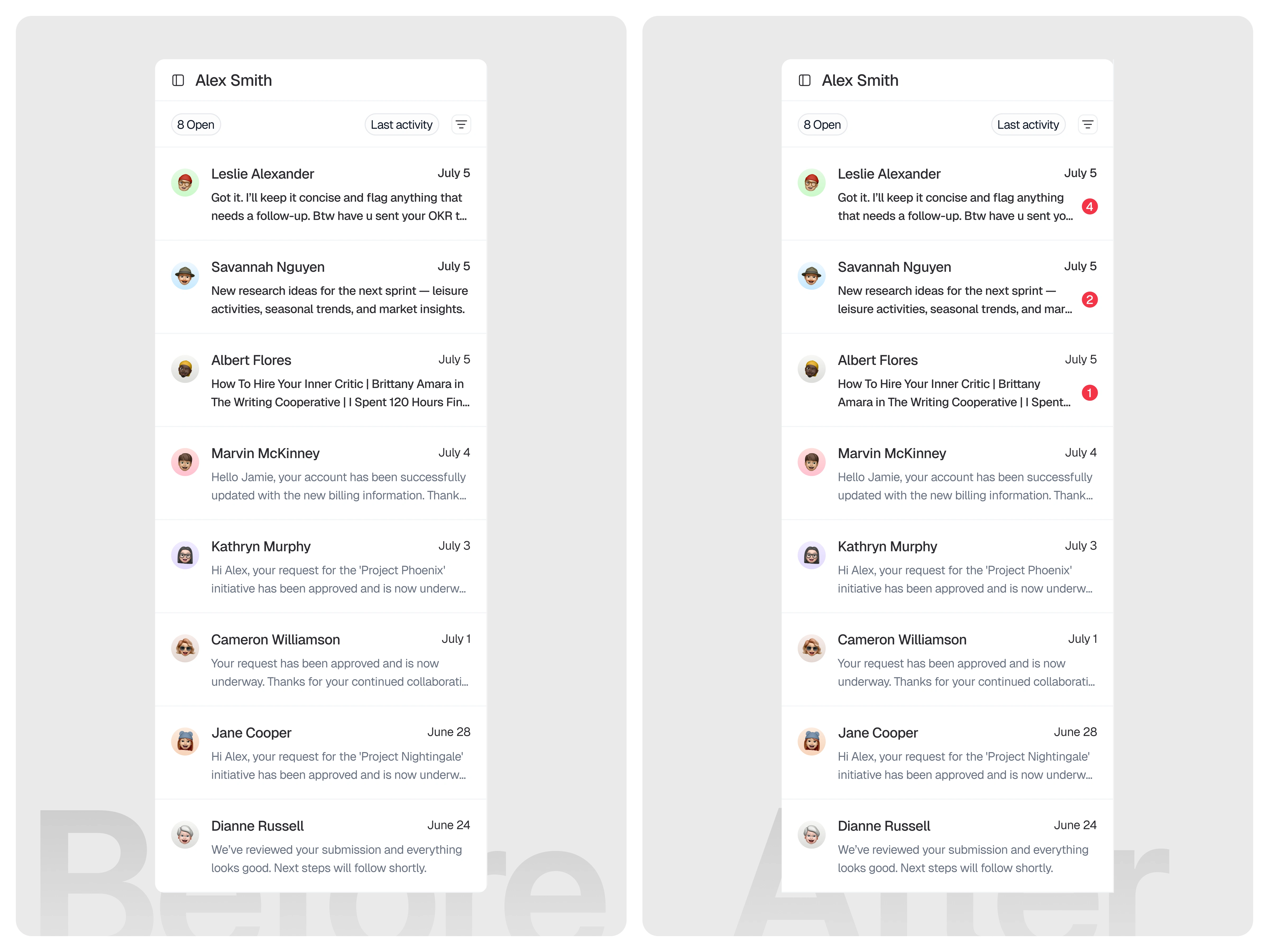 The system should always keep users informed about what requires their attention through clear and immediate visual indicators. In the initial version, unread conversations were only distinguished by slightly bolder text. While this technically created a difference between read and unread messages, the change was too subtle to provide strong visibility. Users could easily overlook unread chats, especially when scanning quickly, since the distinction relied solely on typography without any supporting visual signal. In the improved version, unread messages are now accompanied by a numeric badge that clearly indicates both the presence and quantity of unread messages. This provides an explicit and easily scannable status indicator, allowing users to instantly recognize which conversations need attention and how many messages are waiting. The badge reduces ambiguity, improves message prioritization, and communicates system status more effectively than relying on bold text alone. (src: Jakob Nielsen – 10 Usability Heuristics for User Interface Design)