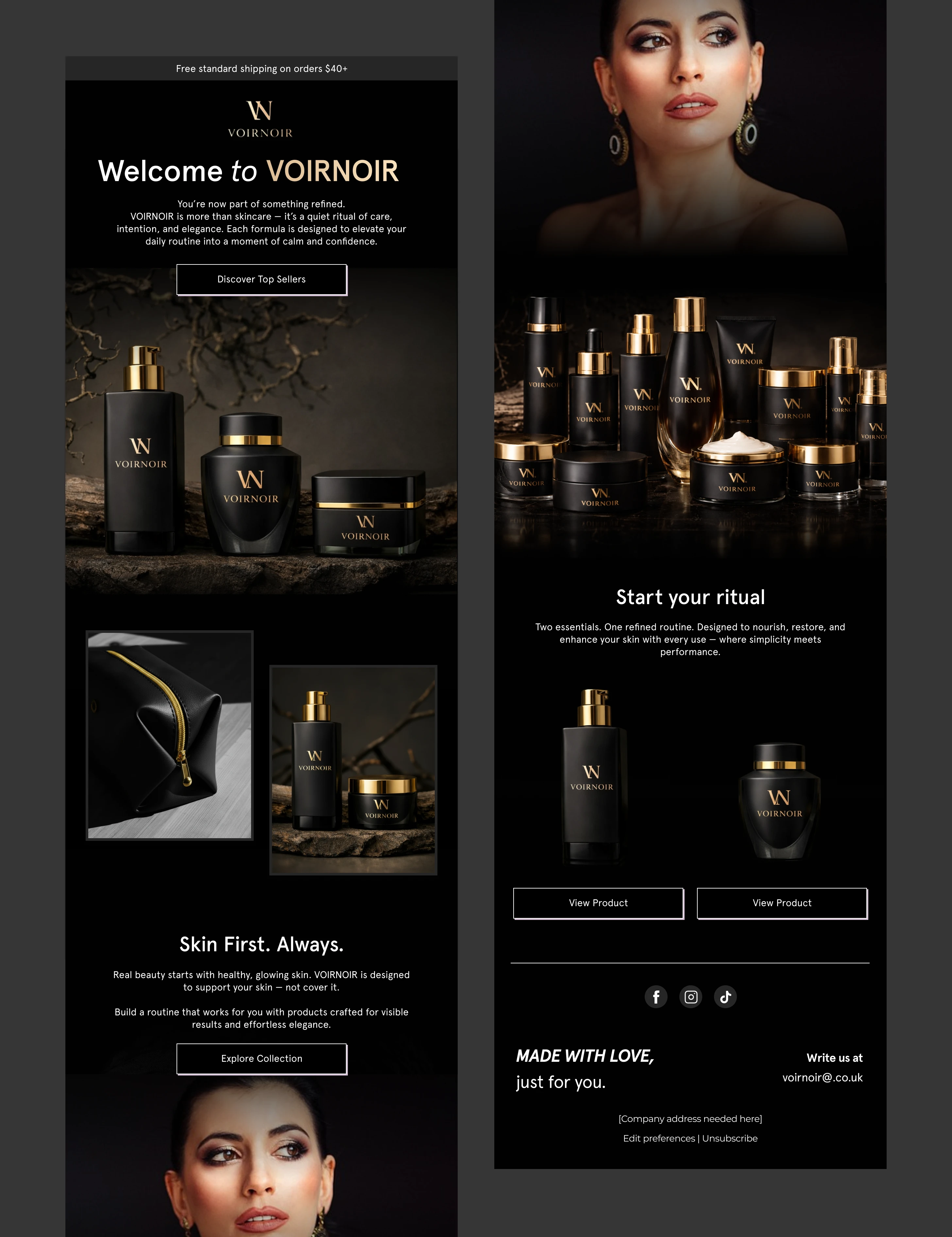 A premium welcome email design created for a fictional luxury skincare brand, VOIRNOIR.