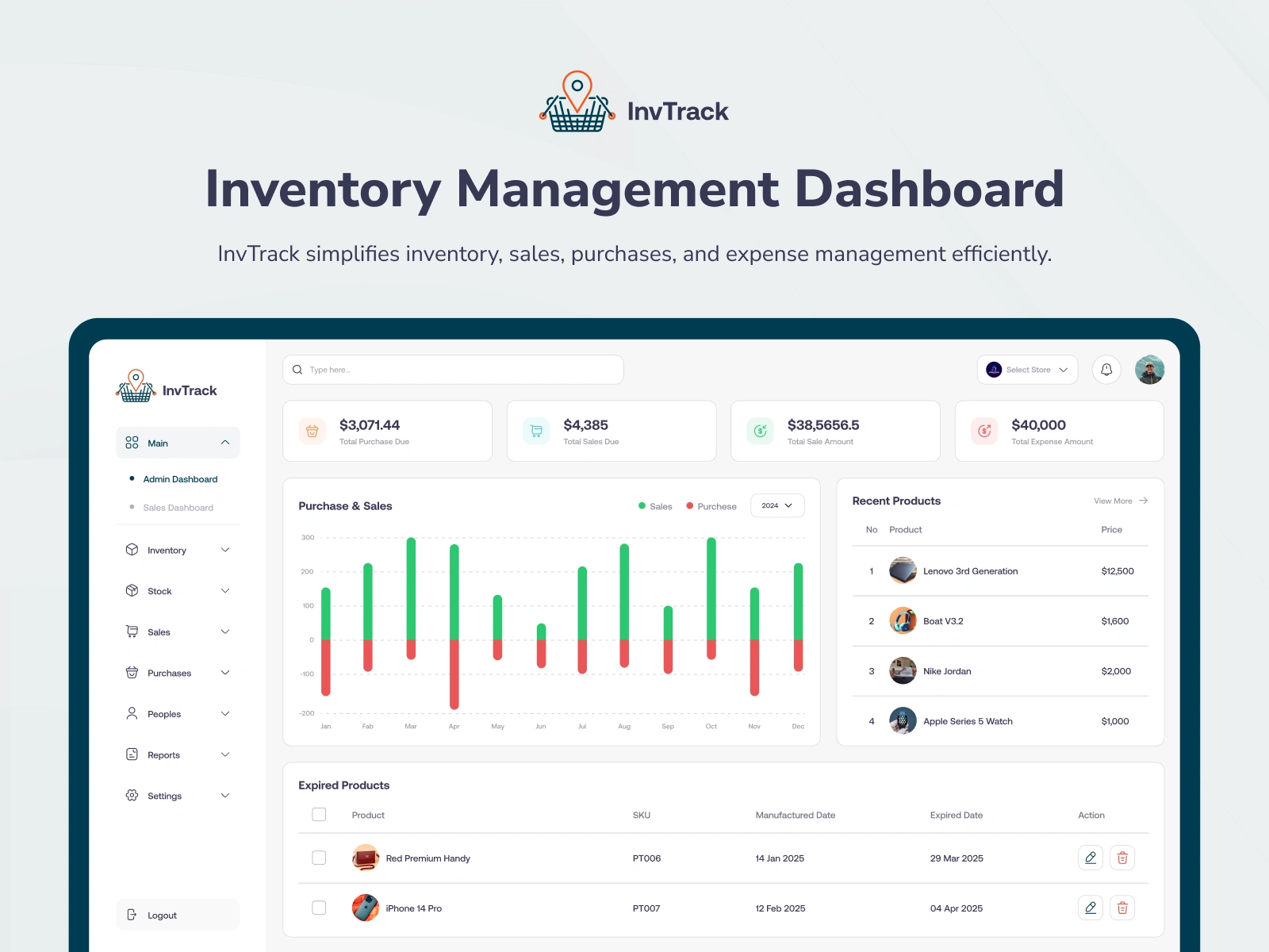 InvTrack is a modern inventory management dashboard designed to help businesses efficiently manage stock, sales, purchases, customers, and expenses from a single platform. With real-time analytics and a data-driven interface, InvTrack simplifies daily operations and enables smarter inventory decisions.