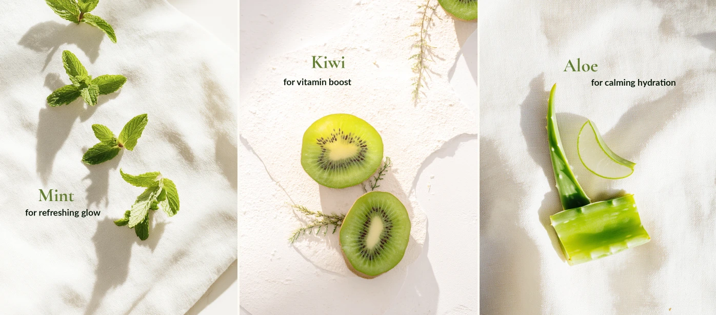 macro ingredient shots (mint, kiwi, aloe) to highlight freshness and benefits