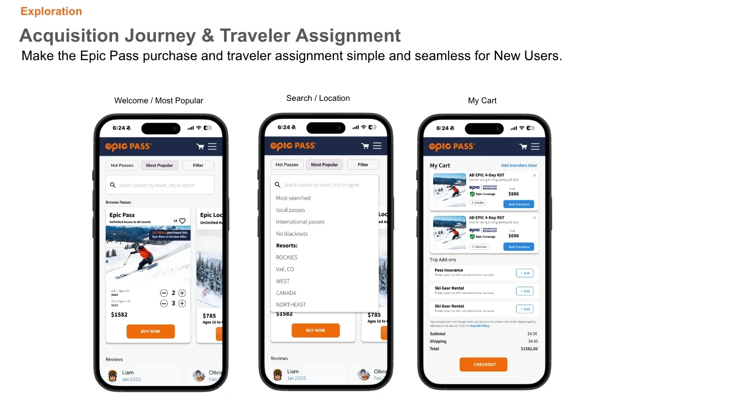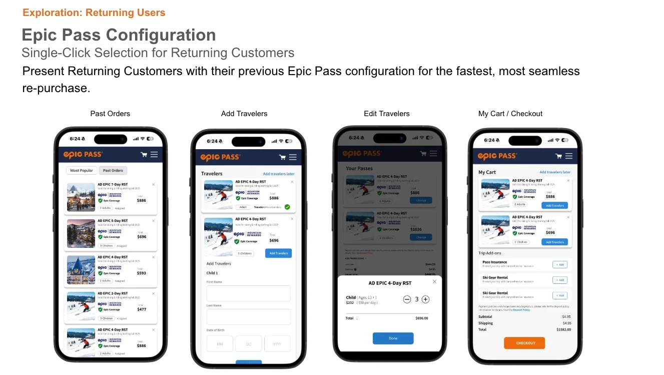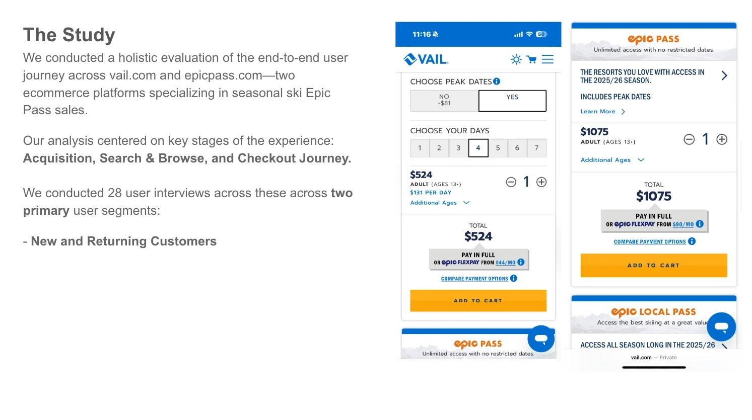 Research study for Epic Pass acquisition journey and returning skiers, uncovering many product blockers, traveler setup, and a challenging checkout experience.