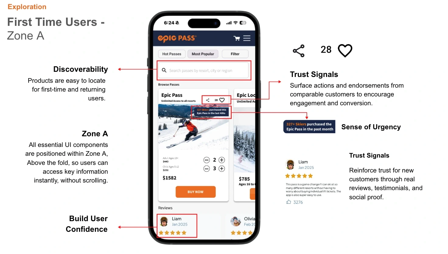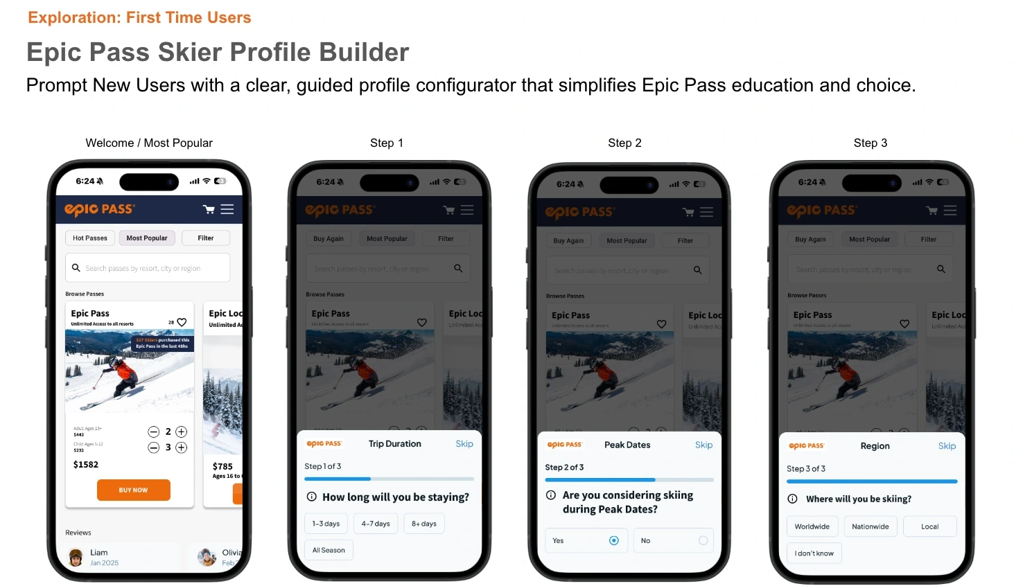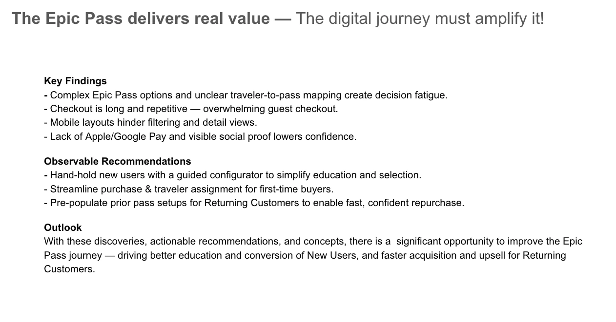 Research study for Epic Pass acquisition journey and returning skiers, uncovering many product blockers, traveler setup, and a challenging checkout experience.