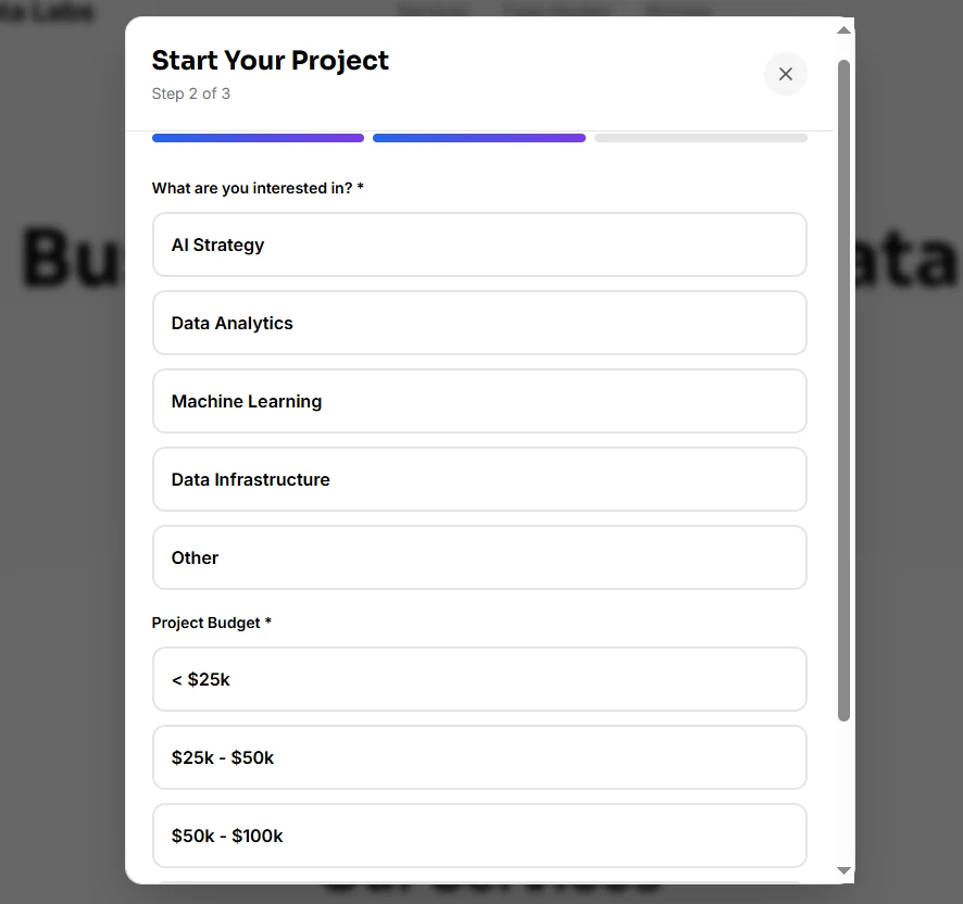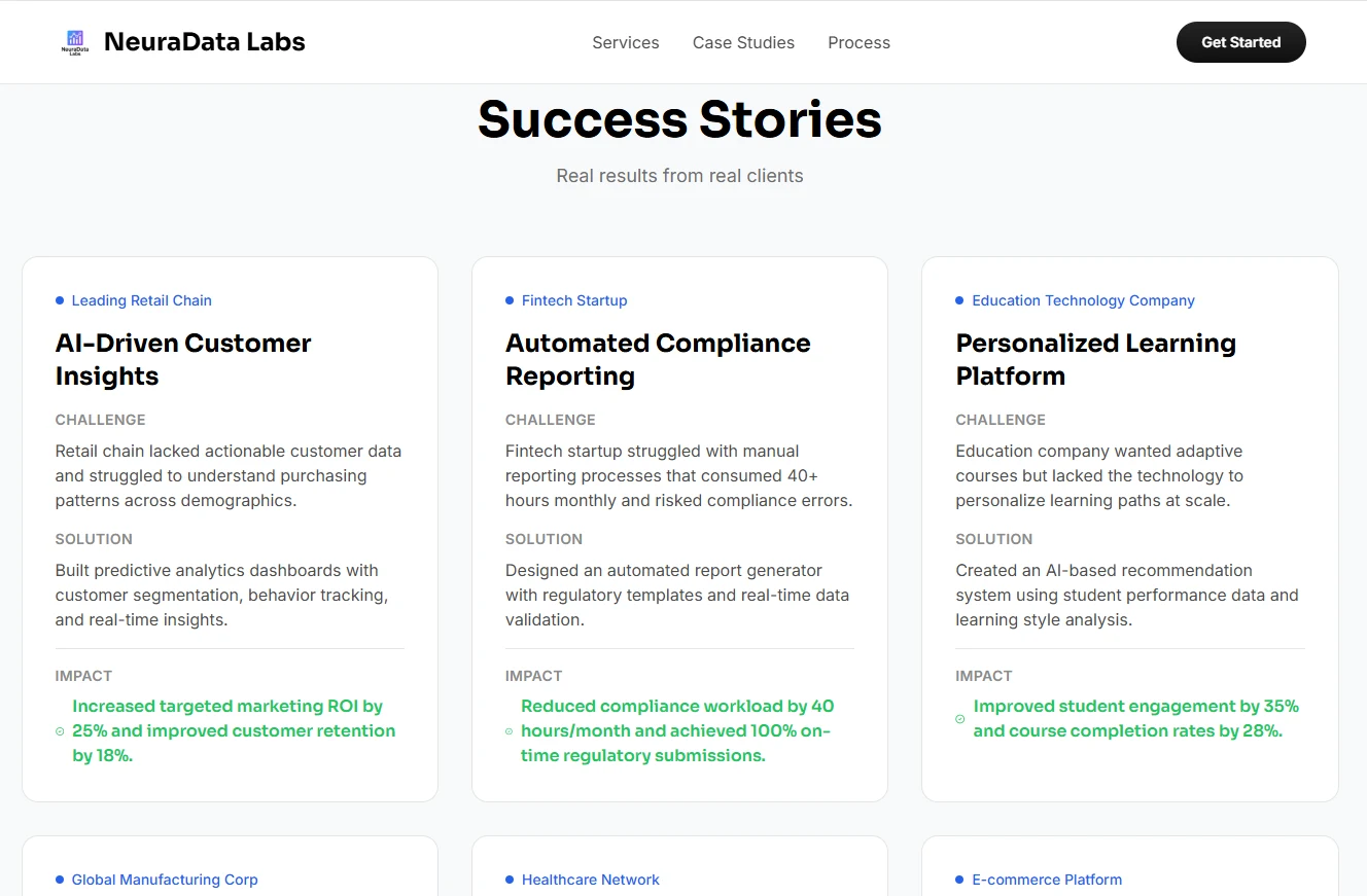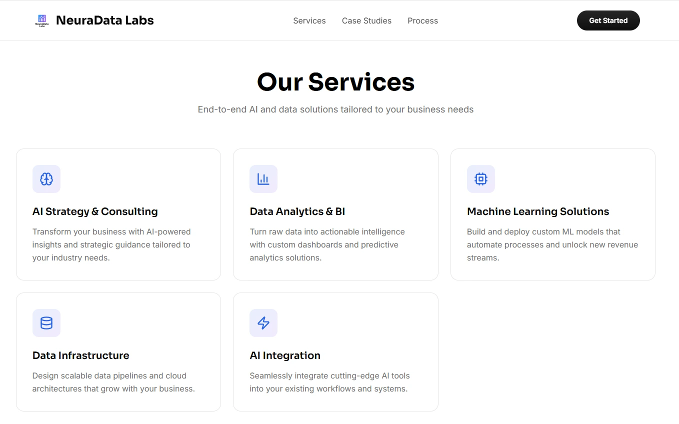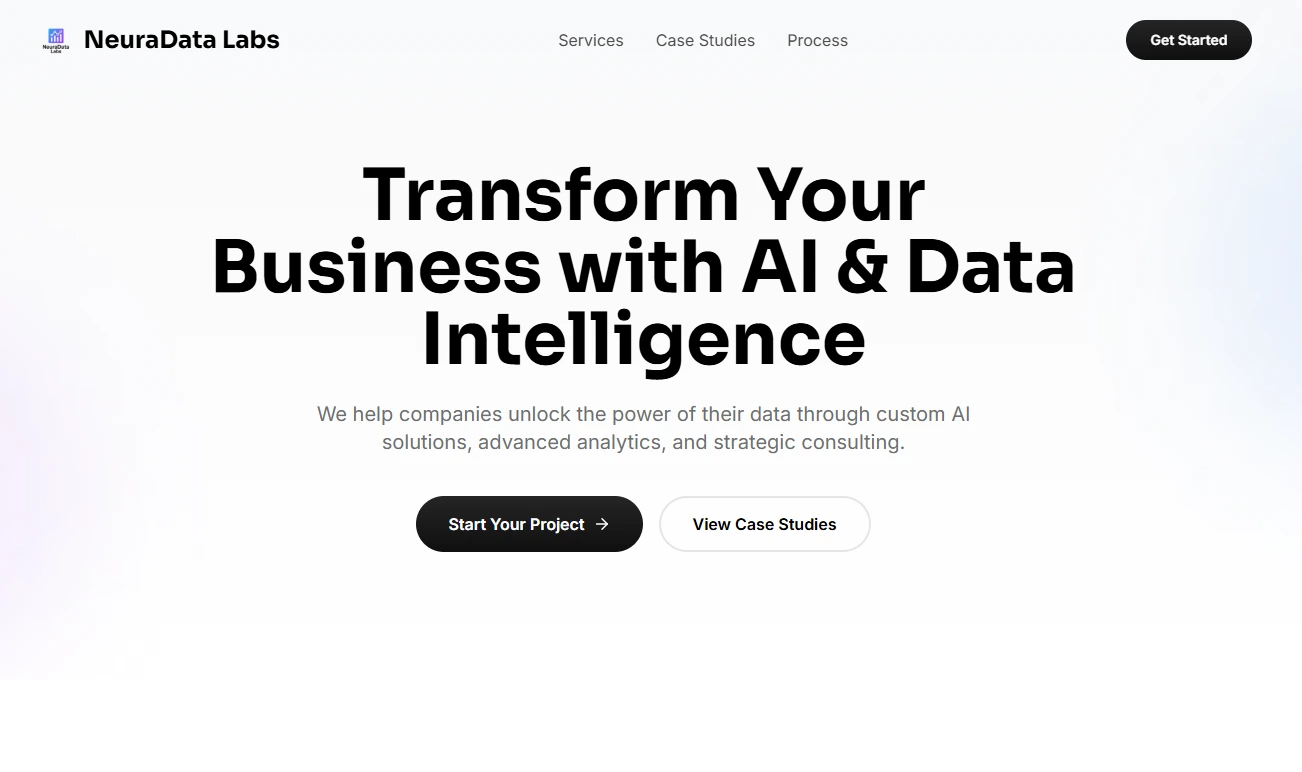 The Agency Page for NeuraData Labs. It showcases the agency’s services, case studies, and processes, while capturing qualified leads through a multi-step form. The platform also includes a full admin dashboard to manage content dynamically and track incoming inquiries.