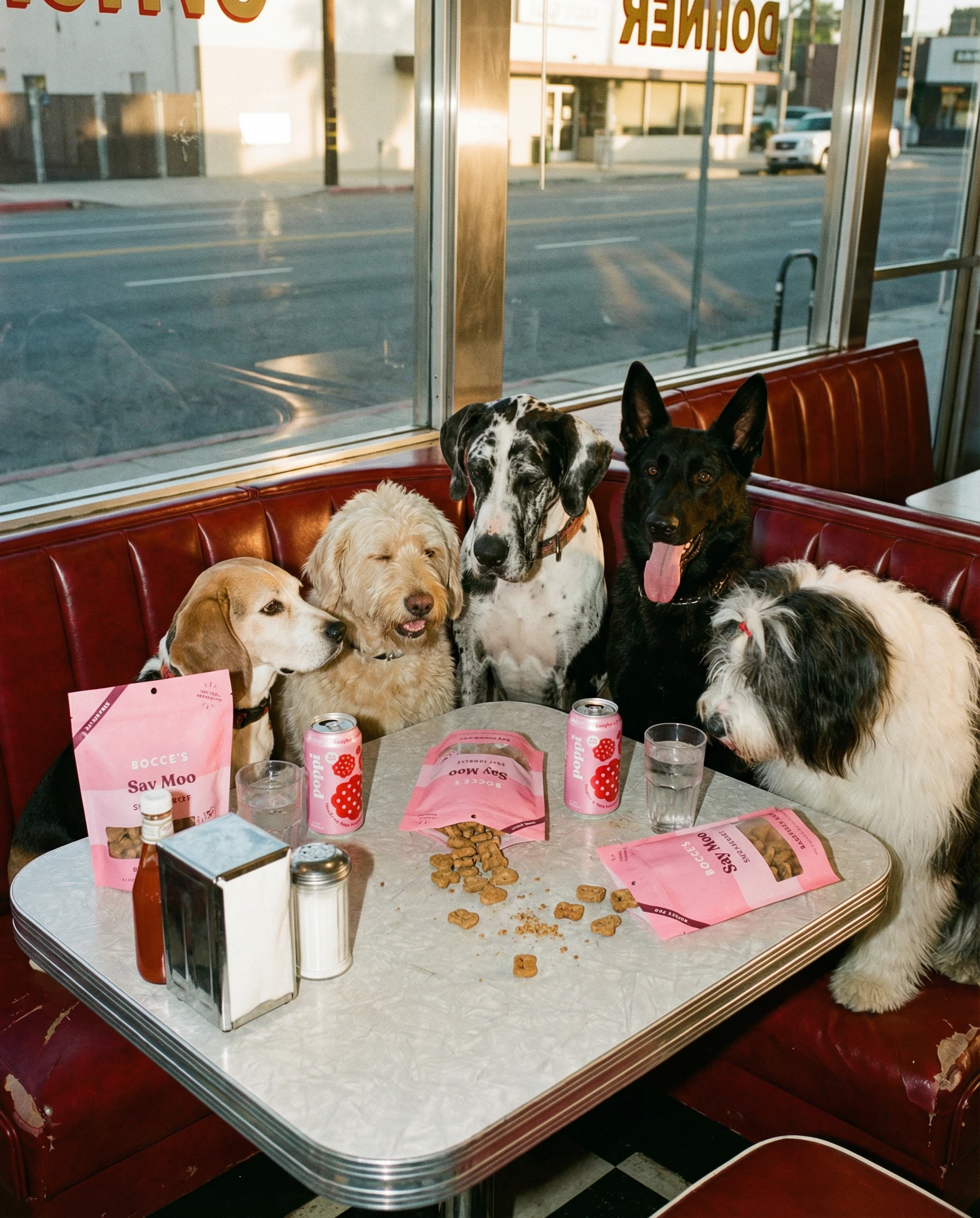 Real personality: Dogs in sunglasses. A convertible overflowing with treat bags. Three heads peeking through a doorway. Dogs eating at a diner. Each scene has built-in humor and shareability.