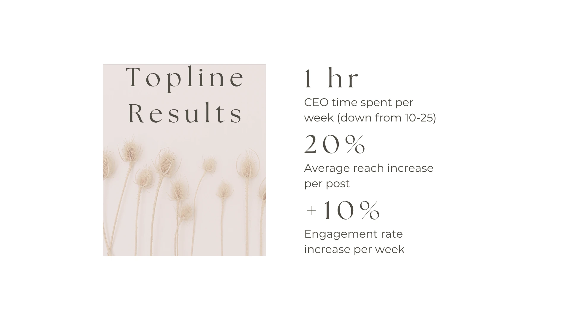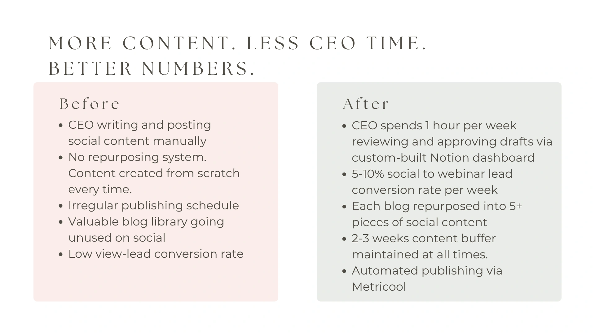 The overall process reduced the CEO's direct involvement in social media content creation down to just 1 hour each week, allowing her to focus on business development.
