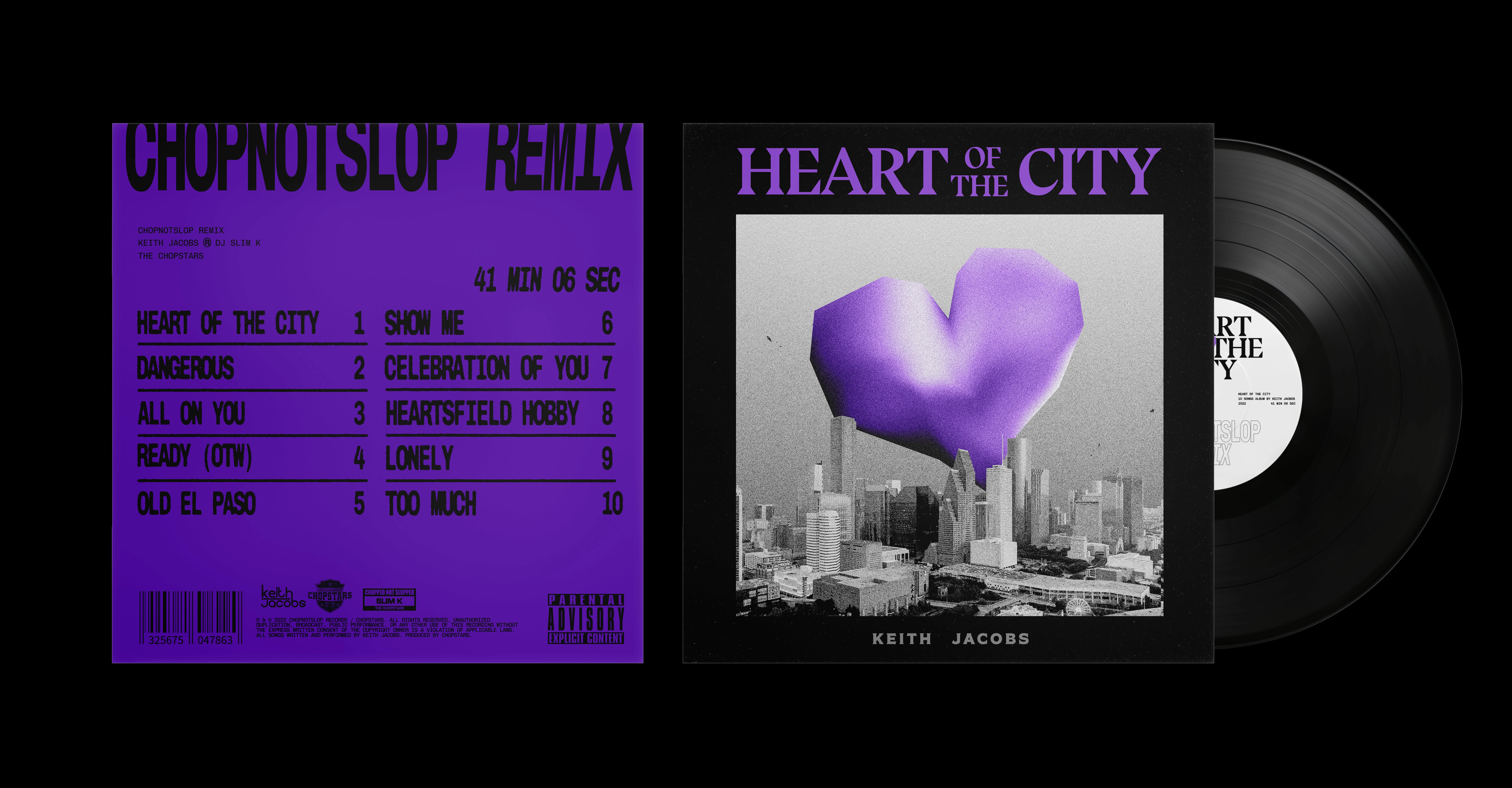 Heart of the City (Chopnotslop Remix) is a 10-track R&B album featuring Houston artist Keith Jacobs alongside DJ Slim K and The Chopstars, released in 2022 under ChopNotSlop Ent. The project brings together Keith Jacobs' original material with the Chopstars' signature chopped and screwed treatment a Houston tradition that slows and layers music into something heavier, more deliberate, more felt. The brief was a single album cover. The final output was a complete visual identity.