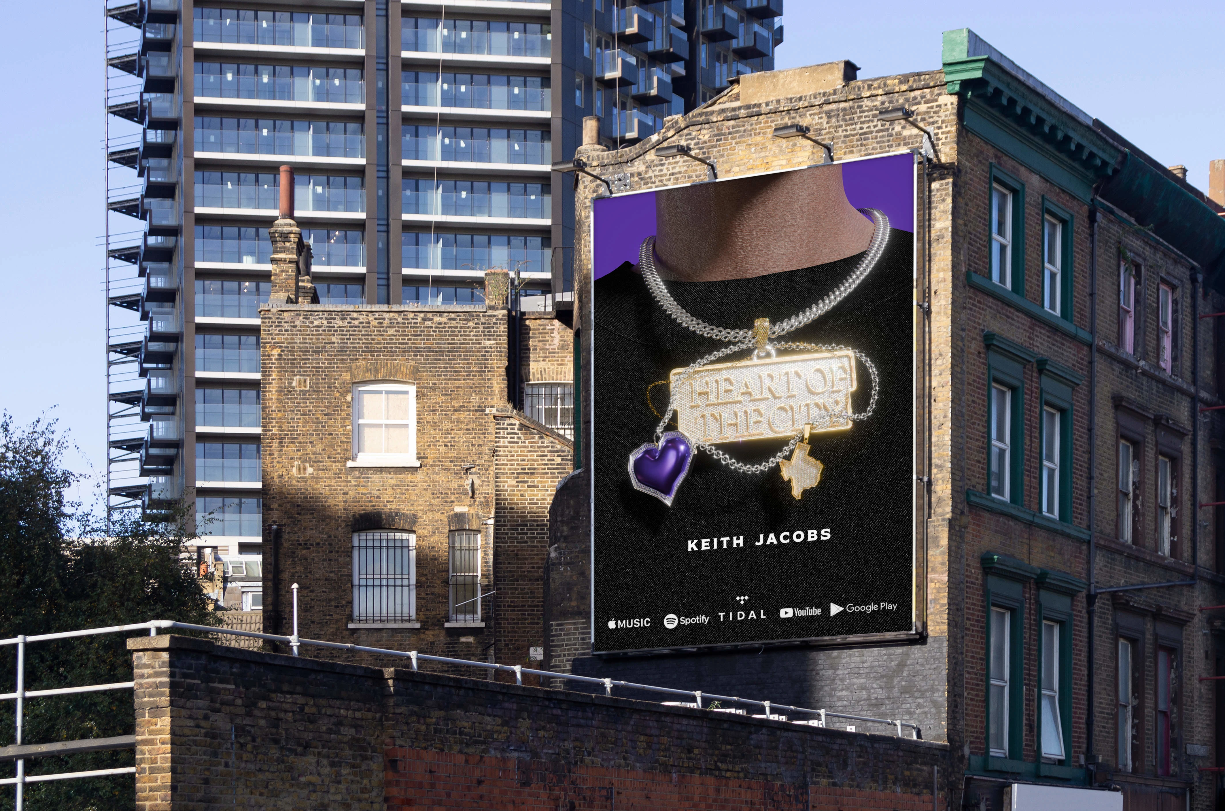 The concept draws from 90s black romance cinema — Love & Basketball, The Best Man an era where love stories played out against the grain and texture of city life. That cultural reference became the design foundation. A desaturated cityscape anchors the frame. Against it, a single vivid purple heart the only colour in the entire composition carries all the emotional weight. The contrast is intentional: love as the one vivid thing in a world that's been drained of colour. The restraint is what gives it force. The grayscale treatment also nods to the grain and contrast of 90s photography without mimicking it literally giving the cover a timeless quality that holds at every scale, from a 12-inch vinyl sleeve to a 40×40px streaming thumbnail.