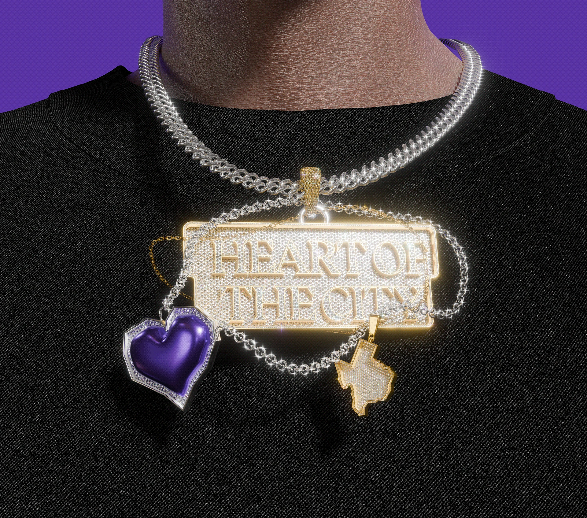Every element carries the same single rule: purple is the only colour. Everything else is the city.
