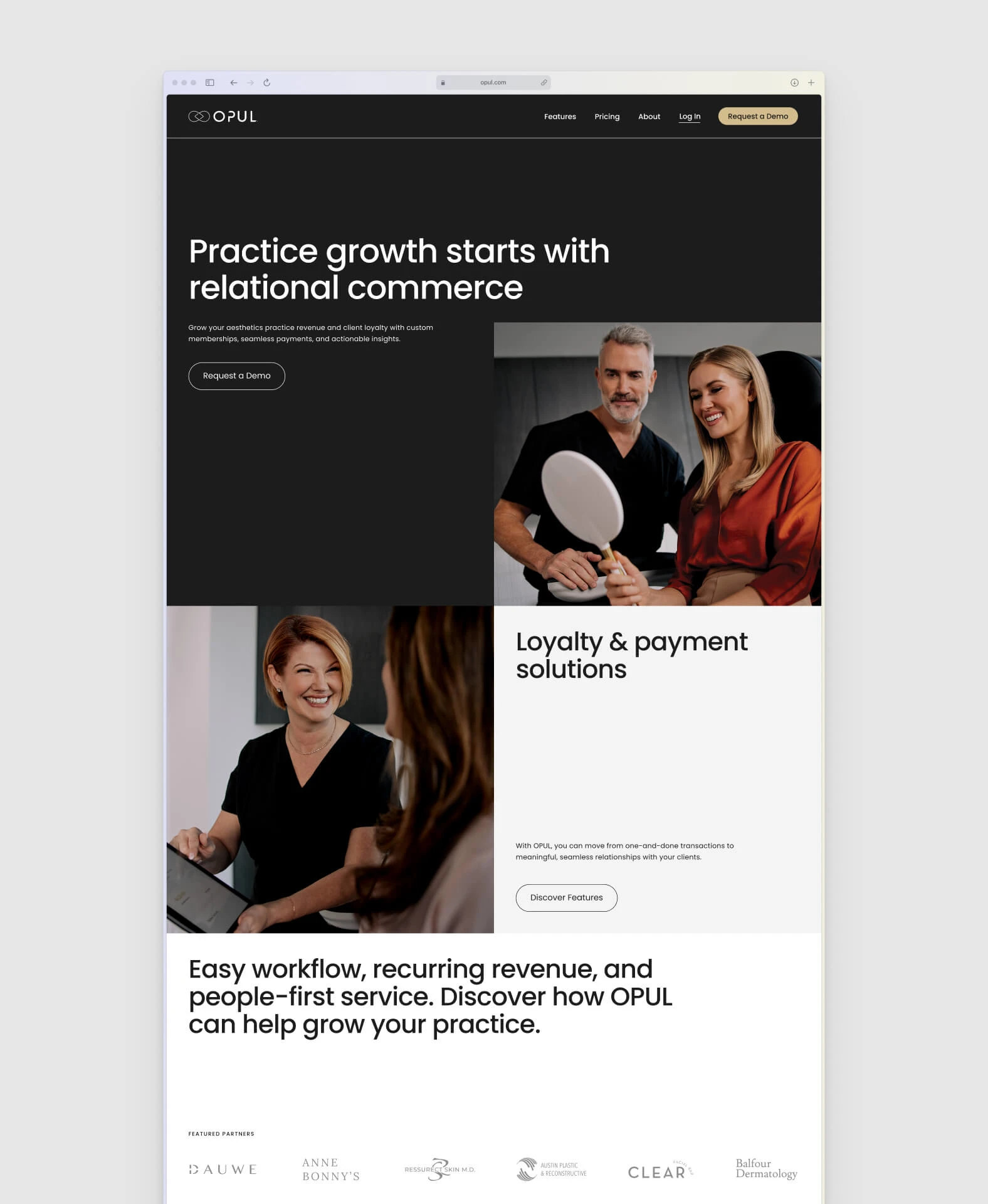 After acquiring Opul® (previously HintMD), Revance was looking to revolutionize the payment and loyalty platform by carving a new niche in the fintech space: Relational Commerce. At the core of this shift was Opul’s focus on people—helping to build and strengthen relationships between aesthetic practices and their clients through integrated payment processing and built-in client loyalty features.