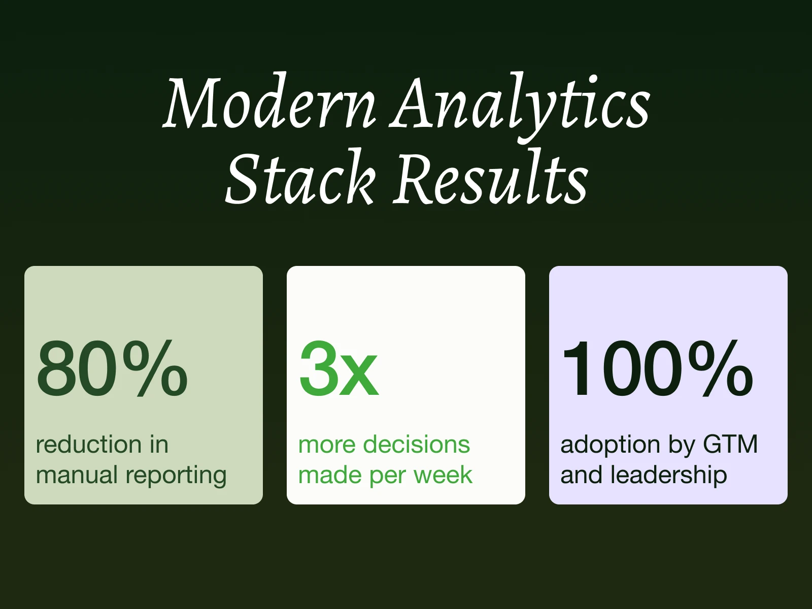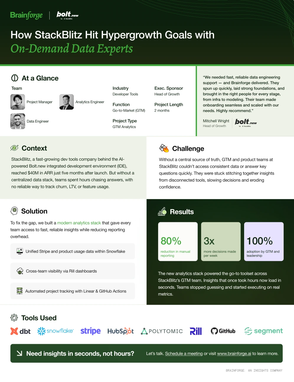 In 2 months, we delivered a modern analytics stack unifying Stripe + Postgres in Snowflake, with Rill dashboards and automated GTM product tracking via Linear & GitHub Actions. We saved 6+ hours per report, cut dashboard load time to <30s, and achieved 100% adoption by GTM and leadership.