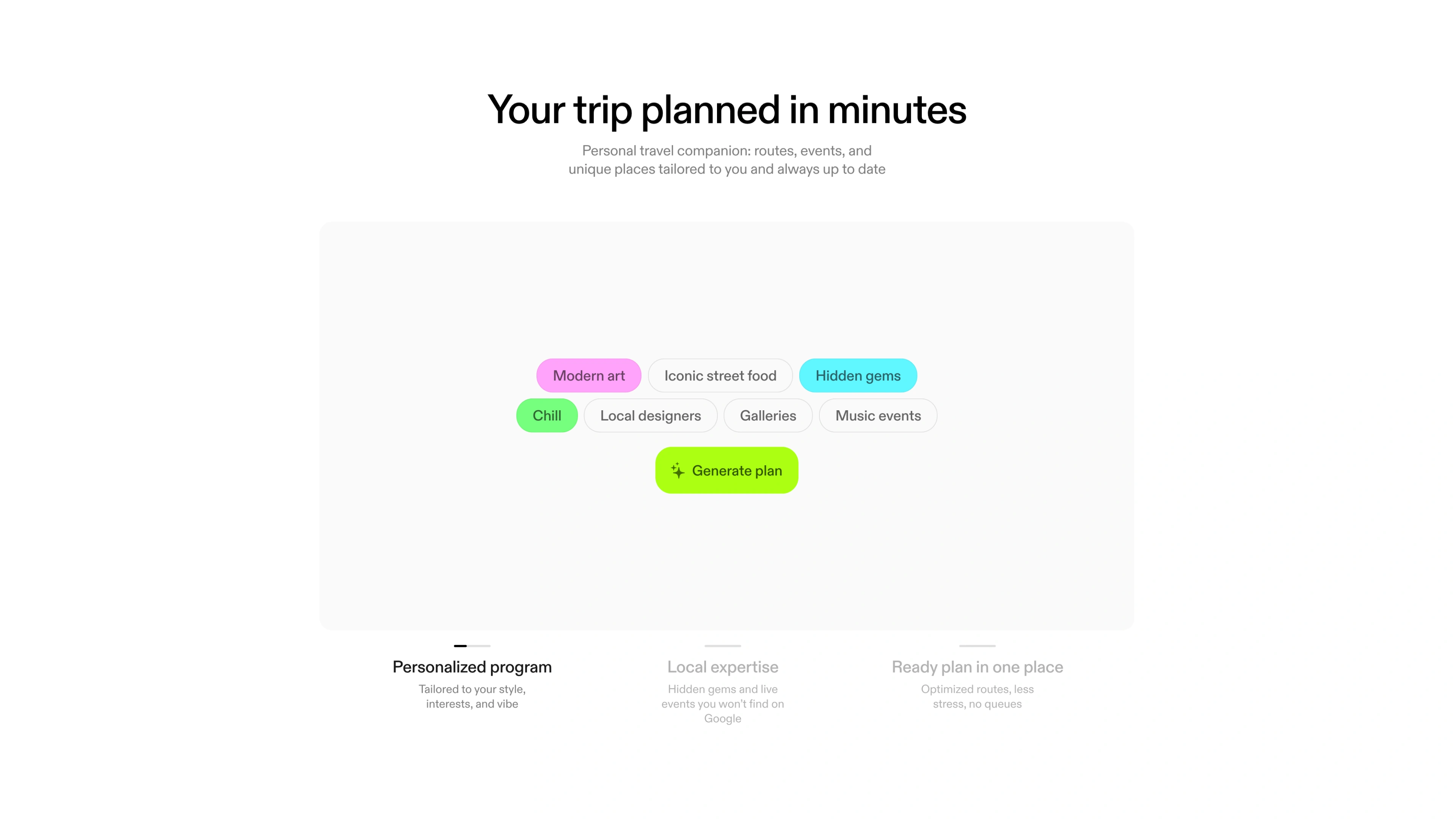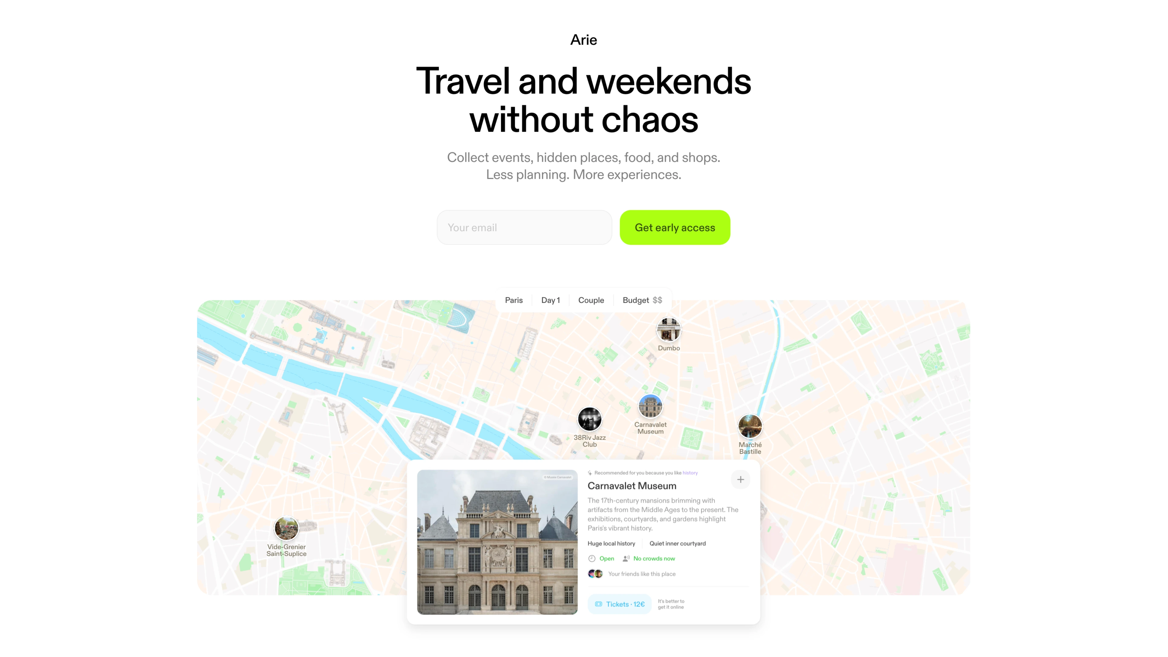 Arie is an intelligent travel planner that helps people build personalized trips based on context, preferences, and intent. At this stage the product was still in development, so the first step was creating a clear public presence and understanding whether people would actually pay for it.