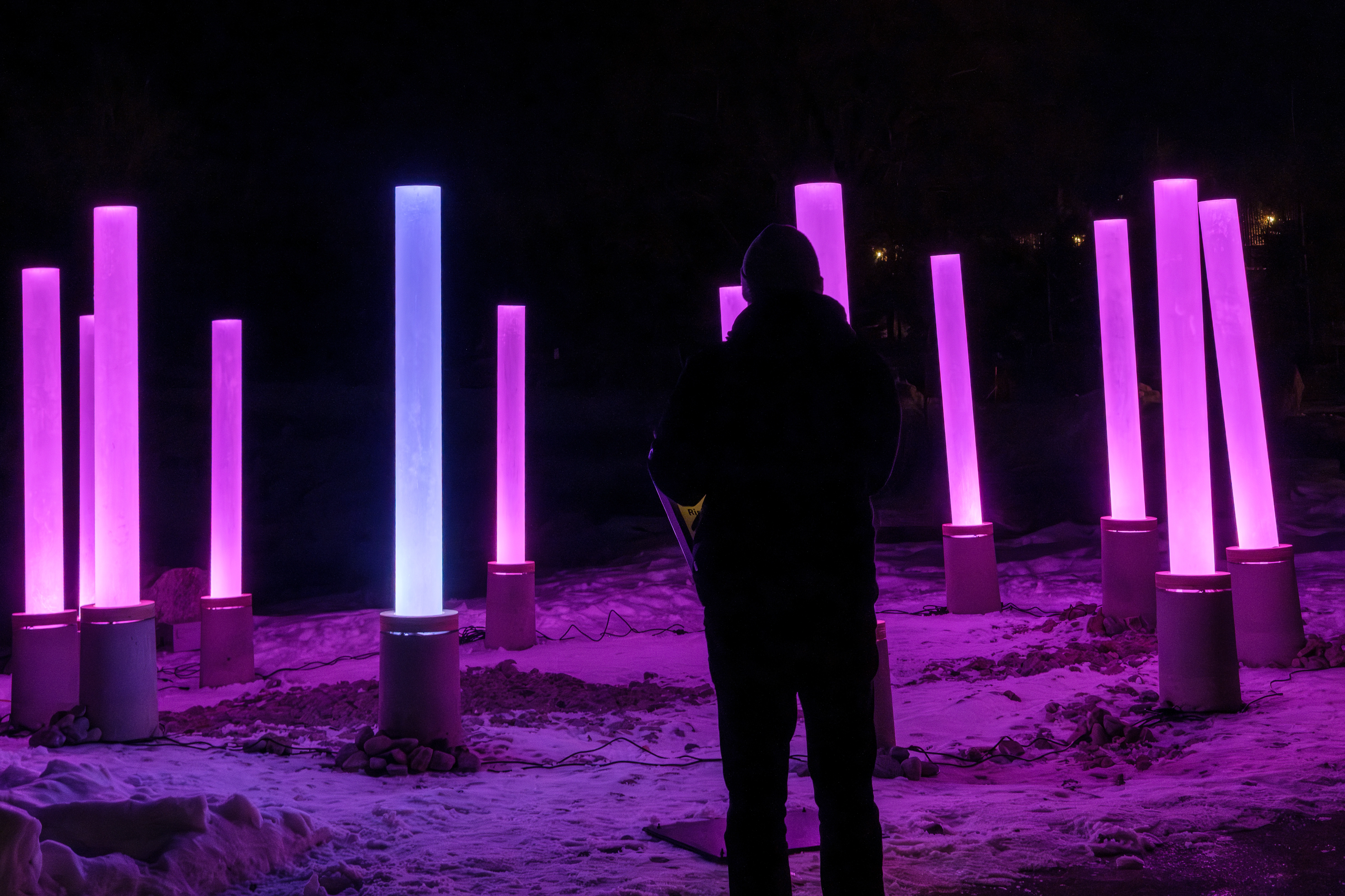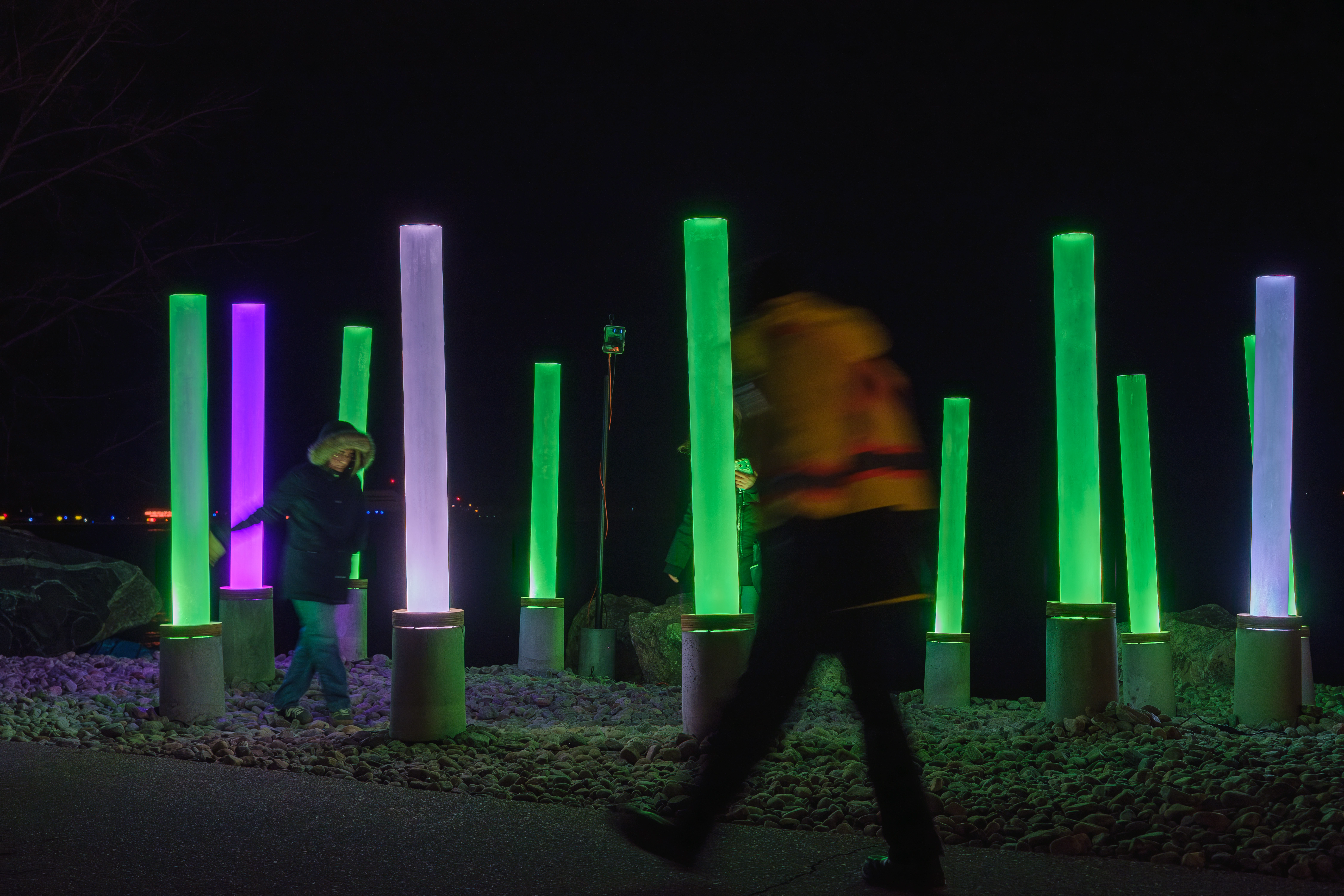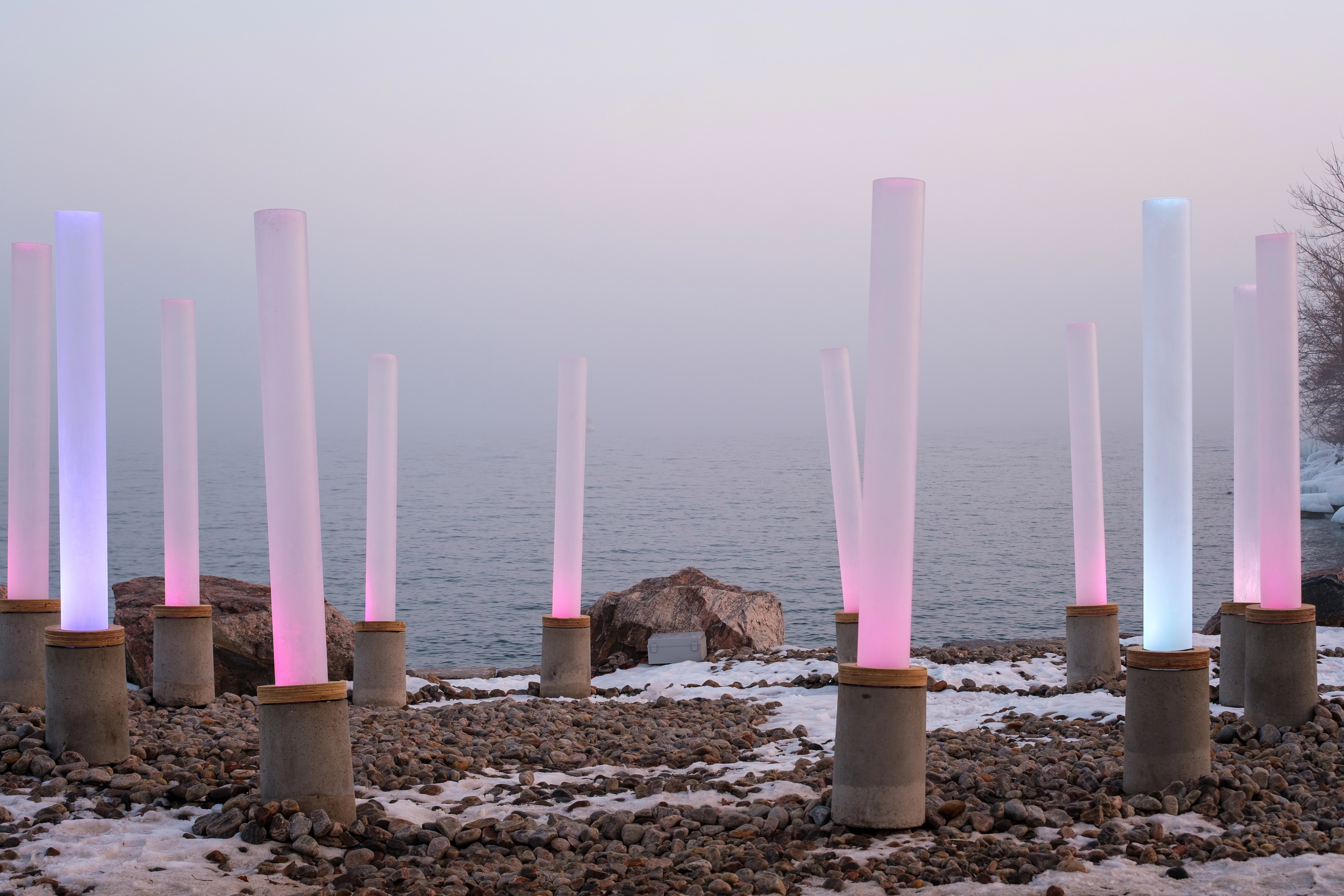 Ripples in Time is an interactive, human-scale clock that makes time and movement perceptible through light. Twelve luminous pillars, each seven feet tall, mark the passing of hours, minutes and seconds. As they move through the installation, visitors can send colourful ripples across the pillars, creating new patterns.