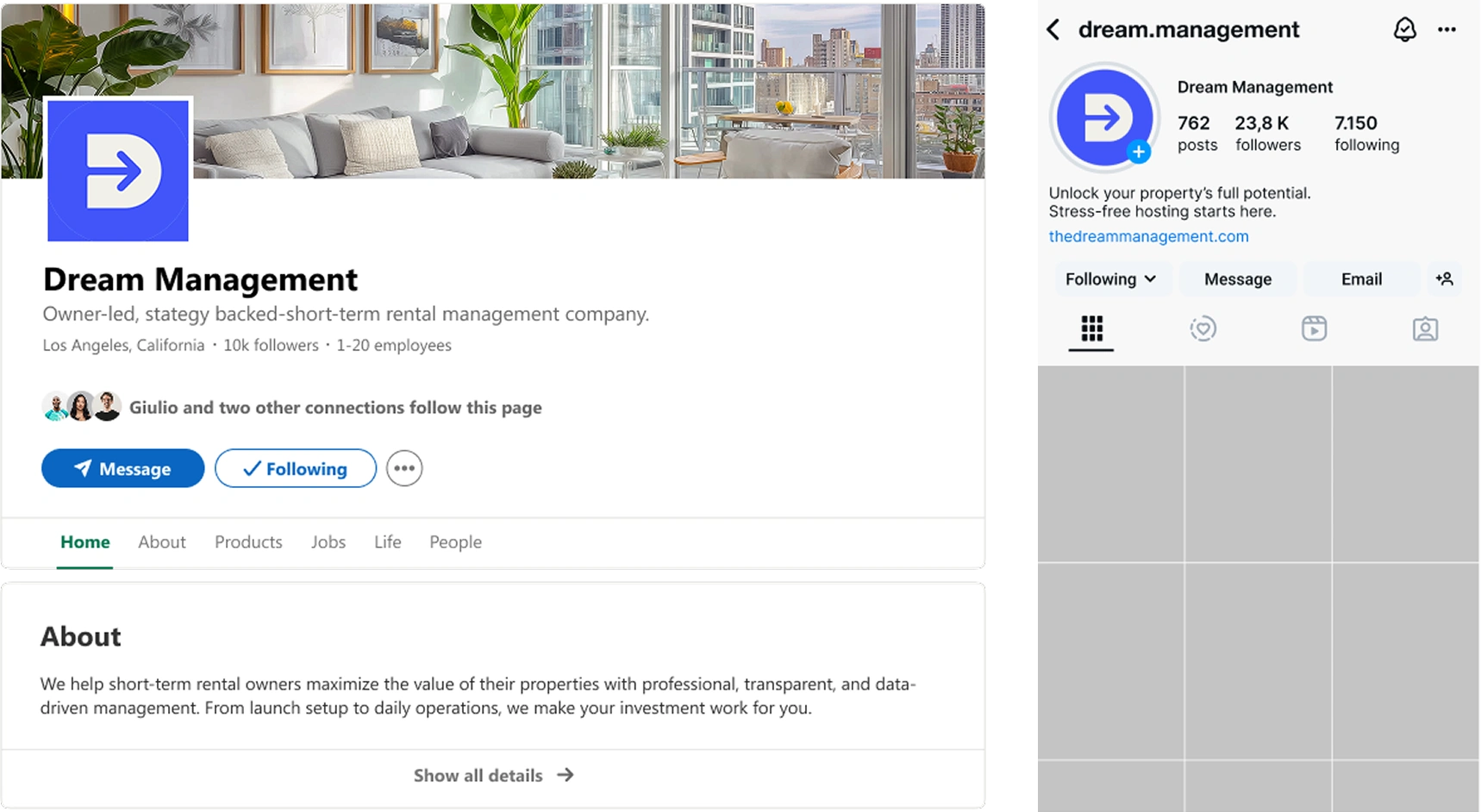 Together, they position Dream as approachable on Instagram and authoritative on LinkedIn, always driving traffic back to the website.